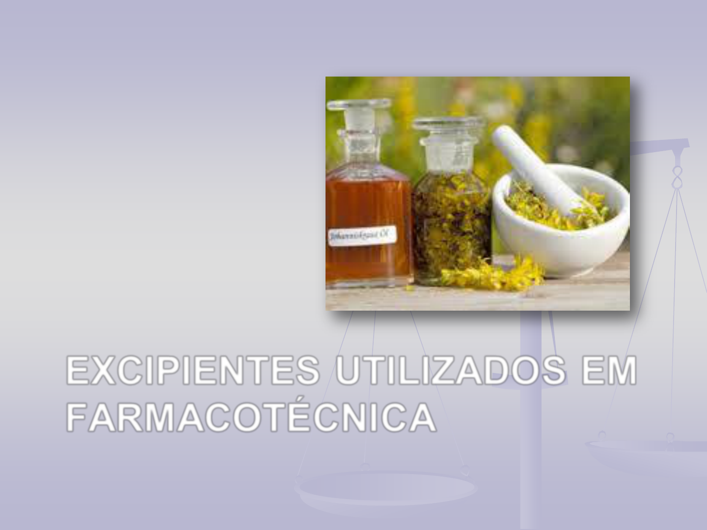* EXCIPIENTES UTILIZADOS EM FARMACOTÉCNICA * * EXCIPIENTES São aditivos usados para converter substâncias farmacologicamente ativas em suas diversas formas farmacêuticas. Os excipientes desempenham uma ampla variedade de funções nas formas farmacêuticas * * Obter formas farmacêuticas estáveis, eficazes, palatáveis e apresentáveis. Solubilizam Suspendem Espesssam Diluem Emulsificam Estabilizam Conservam Colorem Flavorizam * * Funções dos Excipientes Conferir peso, volume e consistência ao fármaco Melhorar as propriedades organolépticas Dar estabilidade (química, física, microbiológica e toxicológica) aos ativos Proporcionar precisão da dose Reduzir ou prevenir a ocorrência de efeitos adversos * * Funções dos Excipientes Modular a solubilidade e biodisponibilidade dos ativos Manter o pH e/ou osmolaridade de formulações líquidas Promover a liberação controlada do fármaco Facilitar a adesão ao tratamento Conferir processabilidade durante a preparação ou fabricação * * Características ideais de um Excipiente Farmacologicamente inativo Química e fisicamente inerte em relação ao fármaco Compatível com os componentes da formulação Incolor e insípido Alta fluidez e fluxibilidade Alta compressibilidade * * Características ideais de um Excipiente Disponibilidade em diversos fornecedores Baixo custo Bem caracterizado Fácil armazenagem Reprodutibilidade lote a lote Efetiva performance com a forma farmacêutica específica * * Tipos de excipientes Veículos: são agentes carreadores de substâncias farmacêuticas, são utilizados na preparação de líquidos orais e parenterais. Ex. água purificada, óleos (mineral, de amêndoas doces, de semente de uva). Agente de aumento de viscosidade: Usado para alterar a consistência de uma formulação, fornecendo maior resistência ao escoamento. Ex. goma adraganta, metilcelulose, etc * * Tipos de excipientes Agente de tonicidade: Usado para dar à solução características osmóticas semelhantes a dos líquidos fisiológicos (como as usadas no caso de colírios). Ex. Cloreto de sódio, dextrose. Agente suspensor: Usado para suspender as partículas sólidas no veículo. Aumentando assim, a viscosidade do veículo. Ex. Agar agar, caulim, metilcelulose, CMC, HMC, goma adraganta. * * Tipos de excipientes Agente acidificante e alcalinizante: Substâncias utilizadas para acidificar ou alcalinizar o meio com objetivo de fornecer estabilidade ao fármaco. Ex. ácido acético, ácido cítrico, ácido fumárico, hidróxido de sódio, trietanolamina, dietanolamina. Diluente: Substância inerte utilizada como agente de enchimento. Usado para criar volume desejado, propriedade de fluxo (para fluir) e as características de compressão nas preparações de comprimidos e cápsulas. Ex: lactose, amido, celulose, manitol, etc. * * Tipos de excipientes Aglutinante: Substâncias utilizadas para causar aderência nas partículas de pó no processo de granulação. Aumentam a coesão entre as partículas. Ex. amido, povidona, metilcelulose. Desagregante/ Desintegrantes: Promovem o rompimento da massa sólida em partículas menores, que acabam podendo se dispersar ou dissolver mais rapidamente. Ex. amido, carboximetilcelulose reticulada, ácido tartárico, bicarbonato de sódio. * * Tipos de excipientes Lubrificante: Utilizado para diminuir o atrito durante a fluidez do material, facilitando o escoamento dos pós (para dentro das cápsulas por exemplo), otimizando o processo de fabricação do medicamento. Também designados deslizantes ou antiaderentes. Ex. Estearato de magnésio, estearato de cálcio, estearato de zinco, talco. Absorventes: Também chamados de secantes. Absorvem umidade residual. Ex. Carbonato de cálcio, talco, dióxido de silício coloidal. * * Tipos de excipientes Agente de revestimento: Protege da ação do Tubo Gastro Intestinal. Servem para cobrir o comprimido evitando degradação antes da hora, protege contra gosto ruim, altera o tempo de liberação do fármaco no organismo (retarda e prolonga a desagregação). Ex. Açucarado (glicose, sacarose), película (Ethocel = etilcelulose ou hidroxipropilmetilcelulose), revestimento entérico (ftalato de acetato de celulose, goma laca). * * Tipos de excipientes Tensoativos: Melhoram a absorção do fármaco, pois diminuem a tensão superficial das substâncias (principalmente da água por substâncias lipossolúveis), facilitando a dissolução. Ex. LSS, polissorbatos, lecitina de soja. Agentes Umectantes: Deixa úmido, pois retêm água. Serve para evitar o ressecamento de cremes e pomadas. Ex. Glicerina, propilenoglicol, sorbitol. * * Tipos de excipientes Agentes emolientes: Amaciamento da camada córnea. Ex. Glicerina, propilenoglicol, esteres graxos. Agentes emulsificantes: Usado para promover e manter a dispersão de partículas em um veiculo no qual elas são imiscíveis. Podendo ter como produto final uma emulsão líquida ou semissólida. Ex. Álcool cetílico, monoestearato de glicerila, monoleato de sorbitano. * * Classificação Química Água, álcoois Ésteres, ac. Carboxílicos Glicerídeos e ceras Carboidratos (mono, di e polissacarídeos) Hidrocarbonetos Polímeros (naturais ou sintéticos) Minerais Conservantes, corantes, edulcorantes, etc. * * Água – é o mais importante dos solventes utilizados em farmacotécnica. Deve obedecer padrões farmacopeicos para água purificada. Líquido transparente, incolor, inodoro, insípido. pH entre 5,0 e 7,0 determinado potenciometricamente Ponto de ebulição: 1000C. Índices em (mg/litro): Sólidos totais dissolvidos(< 1), dióxido de carbono (< 4,0), cloreto (<0,5), cálcio (<0,5), sulfato (<0,5) Bactérias totais (<100 UFC/ml), coliformes totais (ausência), coliformes fecais (ausência) * * Solventes não aquosos Quando uma substância não é solúvel na água outros líquidos são utilizados para sua solubilização. Um ou mais solventes não aquosos podem ser adicionados à água nas preparações p
