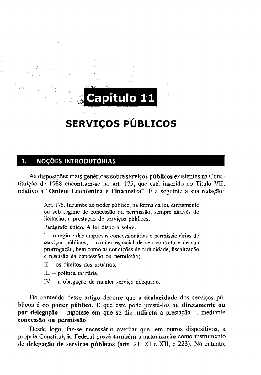 Capítulo 1'1 SERVIÇOS PÚBLICOS 1. NOÇÕES INTRODUTÓRIAS As disposições mais genéricas sobre serviços públicos existentes na Cons- tituição de 1988 encontram-se no art. 175, que está inserido no Título VII, relativo à "Ordem Econômica e Financeira". É a seguinte a sua redação: Art. 175. Incumbe ao poder público, na forma da lei, diretamente ou sob regime de concessão ou permissão, sempre através de licitação, a prestação de serviços públicos. Parágrafo único. A lei disporá sobre: I - o regime das empresas concessionárias e permissionárias de serviços públicos, o caráter especial de seu contrato e de sua prorrogação, bem como as condições de caducidade, fiscalização e rescisão da concessão ou permissão; li - os direitos dos usuários; III - política tarifária; IV - a obrigação de manter serviço adequado. Do conteúdo desse artigo decorre que a titularidade dos serviços pú- blicos é do poder público. E que este pode prestá-los ou diretamente ou por delegação - hipótese em que se diz indireta a prestação -, mediante concessão ou permissão. Desde logo, faz-se necessário averbar que, em outros dispositivos, a própria Constituição Federal prevê também a autorização como instrumento de delegação de serviços públicos (arts. 21, XI e XII, e 223). No entanto, 7 48 DIREITO ADMINISTRATIVO DESCOMPLICADO • Marcelo Alexandrino & Vicente Paulo a sua utilização deve ser excepcional; ordinariamente, é de se esperar que a delegação seja efetuada por meio de concessão e de permissão de serviços públicos. Outro aspecto importante a apontar é que, embora o art. 175 da Carta de 1988 assevere categoricamente que a titularidade dos serviços públicos é do poder público, a verdade é que nem sempre uma atividade desempenhada pelo Estado como serviço público é subtraída à livre-iniciativa privada. Ora, não se pode olvidar que o citado dispositivo encontra-se topicamente inserido no Título VII da Constituição, que trata da "Ordem Econômica e Financeira". Logo, os serviços públicos a que o art. 175 se reporta são aqueles classificados como atividade econômica em sentido amplo, carac- terizados pela possibilidade de serem explorados com intuito de lucro, sem perder a natureza de serviço público (é exatamente por essa razão que eles têm aptidão para serem prestados por particulares, mediante delegação). São exemplos os serviços públicos enumerados nos arts. 21, XI e XII, 25, § 2.0 , e 30, V, do Texto Magno. A titularidade desses serviços públicos submetidos ao art. 175 da Constituição Federal é exclusiva do Estado, isto é, os particulares não podem prestá-los por sua livre-iniciativa. Caso pretendam fazê-lo, deverão, obrigatoriamente, receber delegação do poder público, cujo instrumento será um contrato de concessão ou de permissão de serviço público, sempre precedido de licitação, ou, ainda, nas restritas hipóteses em que admitido, um ato administrativo de autorização de serviço público. A delegação nunca transfere a titularidade do serviço público, de sorte que o particular que a recebe assume a condição de mero executor daquela atividade. É essa a razão de se dizer que, nessa hipótese, ocorre prestação indireta do serviço público pelo Estado. Também por esse motivo, a presta- ção do serviço público pelo particular delegatário está sujeita a um regime de direito público que enseja ampla interferência estatal, com previsão até mesmo de retomada compulsória pelo poder público (por exemplo, nos casos de caducidade e de encampação, que serão estudados em outro tópico). Sem prejuízo do exposto nos parágrafos precedentes, há atividades que devem ser prestadas pelo Estado como serviços públicos, porém, ao mesmo tempo, são abertas à livre-iniciativa, isto é, podem ser exercidas complemen- tarmente pelo setor privado por direito próprio, sem estar submetidas ao regime de delegação, mas, tão somente, aos controles inerentes ao poder de polícia administrativa. Nessa peculiar situação encontram-se, caracteris- ticamente, os direitos fundamentais sociais (CF, art. 6.0 ), especialmente as atividades tratadas no Título VIII da Constituição, relativo à "Ordem Social". Tais atividades, se exercidas por particulares, têm a natureza de serviço privado - e podem ser exploradas com ou sem intuito de lucro. Diferente- Cap. 11 • SERVIÇOS PÚBLICOS 749 mente, quando é o Estado que as executa, serão sempre qualificadas como serviços públicos - prestados, portanto, sob regime jurídico de direito público, mas com duas relevantes distinções em comparação com aqueles a que alude o art. 175 da Carta Política, a saber: (a) o Estado - tanto a sua administração direta quanto a indireta- jamais poderá explorar essas atividades com intuito de lucro; e (b) não cabe cogitar a delegação de seu exercício a particulares (haja vista que estes desempenham as referidas atividades como serviços de natureza privada, sujeitos apenas a fiscalização e controle estatal pertinentes ao poder de polícia). É obrigatória a prestação efetiva pelo Estado desses serviços públicos que se enquadram como direitos constitucionais sociais. Entretanto, a titu- laridade deles não é exclusiva do poder público. Vale repetir: a prestação desses serviços que representam direitos sociais descritos no Título VIII da Constituição é livre à iniciativa privada, isto é, particulares podem fazê-lo por direito próprio, sem qualquer delegação do poder público, na qualidade de prestadores de serviço privado (a gestão do serviço é da própria pessoa privada, ao passo que a gestão - direta ou indireta - dos serviços públicos é sempre do Estado). Note-se que, nessas hipóteses, não é correto falar em "prestação in- direta" pelo Estado; tem-se, isso sim, prestação de um serviço privado por um particular, sob regime de direito privado. O exercíci