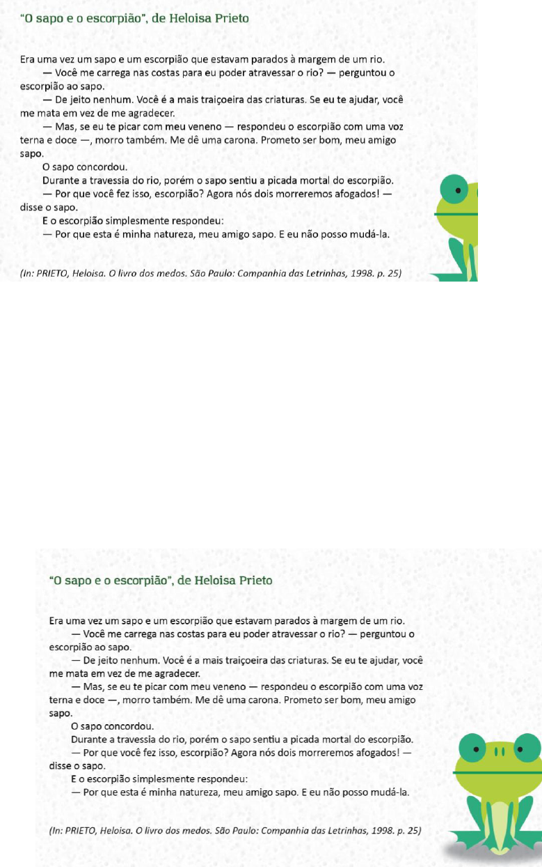 UNIDADE 8 - Tipos Textuais – A Narração: Elementos, Estrutura e Gêneros 1) Leia o texto abaixo: O gênero textual representado pelo texto é: a) Parábola. b) Romance. c) Fábula. d) Anedota. d) Epopeia. 2) O sapo e o escorpião seja um texto preponderantemente narrativo, é possível encontrar outras sequências discursivas no texto “O sapo e o escorpião”. A respeito disso, o tipo textual que está corretamente associado ao exemplo é a opção: a) Injunção: “Por que você fez isso, escorpião?” b) Injunção: “Você me carrega nas costas para eu poder atravessar o rio?” c) Dissertação expositiva: “Durante a travessia do rio, porém o sapo sentiu a picada mortal do escorpião”. d) Descrição: “- Me dê uma carona!” e) Dissertação objetiva: “O sapo concordou.” 3) O sapo e o escorpião Qual das frases abaixo poderia sintetizar a moral da história "O sapo e o escorpião"? a) A instrução é a luz do espírito. b) A ignorância é o pior de todos os males. c) Manda quem pode, obedece quem deve. d) O homem prevenido vale por dois. e) Não se pode lutar contra a natureza. 4) Quanto aos tipos de discurso, no fragmento abaixo é possível identificar: "E o escorpião simplesmente respondeu: - Por que esta é minha natureza, meu amigo sapo. E eu não posso mudá-la." a) Discurso direto, indireto e indireto livre. b) Apenas discurso direto. c) Apenas discurso indireto. d) Discurso direto e indireto. e) Discurso direto e indireto livre. 5) O sapo e o escorpião Quanto à estrutura textual, o item que faz uma relação equivocada entre a passagem e a parte na narrativa do texto "O sapo e o escorpião" é: a) A apresentação – 1º parágrafo. b) O fato complicador – 2º parágrafo. c) A complicação – do 3º ao 7º parágrafo. d) O clímax – 7º parágrafo. e) O desfecho – 8º parágrafo. UNIDADE 9- Argumentação Baseada em Provas e Raciocínio Lógico 1) Mais escolas, menos presídios É indiscutível o aumento da quantidade de jovens brasileiros que seguem a trajetória da criminalidade. Entretanto, os estudos vinculados à Criminologia têm constatado que a adesão dos jovens ao mundo do crime é potencializada pelas condições precárias de moradia, educação, remuneração, entre outros fatores. É também visível que o sistema penal no Brasil não apresenta um viés de ressocialização. Em crise, tal sistema encontrava-se em 2009 com 446 mil presos, segundo o Conselho Nacional de Justiça (CNJ), provocando a superlotação das cadeias, além de um déficit carcerário de 156 mil vagas. O interior dos presídios é uma escola para novos crimes, provoca o embrutecimento do sujeito, a falta de perspectiva de vida (dentro e fora da cadeia) e justifica o elevado índice de reincidência. Se o sistema penal não é efetivo em relação aos adultos, por que o seria em relação aos adolescentes? É urgente que se estabeleçam prioridades mais sábias e que o investimento nos direitos básicos, como a educação de qualidade, por exemplo, seja o foco principal das nossas lideranças. Somente assim, em vez de pensarmos em punir e reabilitar os criminosos, ou em reduzir a maioridade penal, poderemos pensar na formação integral de nossas crianças. (Ada Magaly Matias Brasileiro) A tese principal que pode ser construída pelo leitor deste texto é: a) Os presídios brasileiros não ressocializam. b) Os presídios brasileiros são escolas para novos crimes. c) Em vez de priorizar a construção de presídios, o Brasil deveria investir em escolas. d) A adesão dos jovens à criminalidade se deve às condições precárias em que vivem. e) As condições dos presídios brasileiros justificam a elevação da criminalidade brasileira. 2) Mais escolas, menos presídios É indiscutível o aumento da quantidade de jovens brasileiros que seguem a trajetória da criminalidade. Entretanto, os estudos vinculados à Criminologia têm constatado que a adesão dos jovens ao mundo do crime é potencializada pelas condições precárias de moradia, educação, remuneração, entre outros fatores. É também visível que o sistema penal no Brasil não apresenta um viés de ressocialização. Em crise, tal sistema encontrava-se em 2009 com 446 mil presos, segundo o Conselho Nacional de Justiça (CNJ), provocando a superlotação das cadeias, além de um déficit carcerário de 156 mil vagas. O interior dos presídios é uma escola para novos crimes, provoca o embrutecimento do sujeito, a falta de perspectiva de vida (dentro e fora da cadeia) e justifica o elevado índice de reincidência. Se o sistema penal não é efetivo em relação aos adultos, por que o seria em relação aos adolescentes? É urgente que se estabeleçam prioridades mais sábias e que o investimento nos direitos básicos, como a educação de qualidade, por exemplo, seja o foco principal das nossas lideranças. Somente assim, em vez de pensarmos em punir e reabilitar os criminosos, ou em reduzir a maioridade penal, poderemos pensar na formação integral de nossas crianças. (Ada Magaly Matias Brasileiro) Para defender a tese do texto, a autora usou vários argumentos. Assinale a opção em que o tipo de argumento esteja erroneamente identificado. a) “Estudos vinculados à Criminologia têm constatado que a adesão dos jovens ao mundo do crime é potencializada pelas condições precárias de moradia, educação, remuneração, entre outros fatores.” Uso da ilustração. b) “O sistema penal no Brasil não apresenta um viés de ressocialização.” Uso de um fato. c) “O sistema encontra-se hoje com 446 mil presos, segundo o Conselho Nacional de Justiça (CNJ)”. Uso de dados e autoridade. d) “provocando a superlotação das cadeias”. Uso de fato. e) “... um déficit carcerário de 156 mil vagas.” Uso de dados. 3) Leia o fragmento a seguir: "A maioridade penal, durante o período colonial de 1830, foi instaurada no Brasil com o advento do primeiro Código Criminal do Império, uma