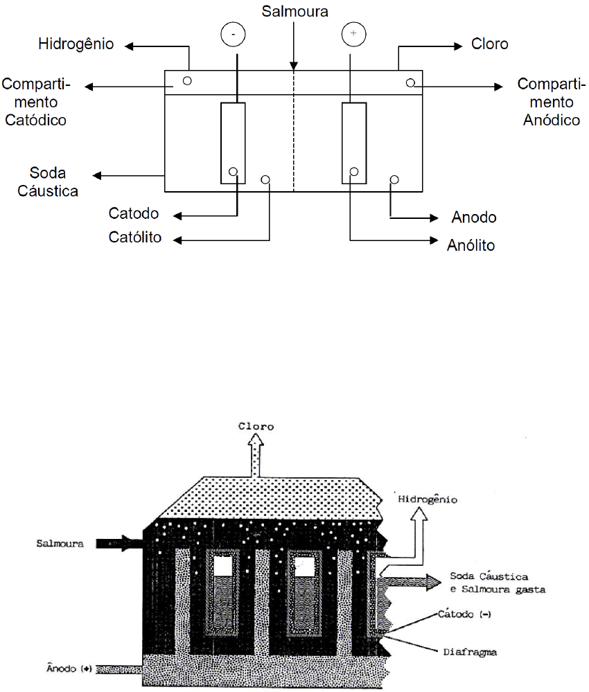 Produção de NaOH por Métodos Eletrolíticos Operações e processos de fabricação Células eletrolíticas As células eletrolíticas de maneira geral são dispositivas para decomposição de salmoura mediante a energia elétrica usando corrente contínua. Este fenômeno é denominado eletrólise. Os produtos da eletrólise de salmoura são o cloro, soda cáustica e hidrogênio. As células são compostas de uma câmara catódica, onde é gerada a soda cáustica e o hidrogênio e de uma câmara anódica, onde é produzido o cloro. Estas câmaras devem ser mantidas separadas com uma barreira que pode ser um diafragma poroso ou uma membrana. No caso das células de mercúrio, estas são compostas de duas partes, um eletrolizador onde é gerado o cloro, e um decompositor onde são gerados a soda cáustica e hidrogênio. Células de diafragma As células de diafragma caracterizam-se, como o nome indica, pela presença de um diafragma que separa o compartimento anódico do catódico. O diafragma,consistindo basicamente de asbesto, permite a passagem dos íons por migração elétrica, mas reduz a difusão dos produtos. O diafragma permite o escoamento da salmoura do compartimento anódico para o catódico e, desta forma, diminui muito, ou impede, as reações secundárias (por exemplo, a formação de hipoclorito de sódio). O escoamento é mantido constante mediante uma diferença de nível entre o compartimento anódico e o catódico. Uma célula de diafragma típica será ilustrada na figura abaixo. As principais reações que ocorrem na célula de diafragma são: A principal reação anódica é: O cloro formado no anodo satura o anólito, estabelecendo-se o seguinte equilíbrio: A principal reação catódica é: Processamento da Soda Cáustica No caso das células de diafragma, o licor das células que contém cerca de 10 – 12% NaOH e sal não eletrolizado deve ser submetido à evaporação. Aqui o licor é evaporado em evaporadores de 2 ou 3 efeitos, com separadores de sal, e passa depois por um filtro lavador. O sal assim recuperado é usado para constituir nova salmoura. Os evaporadores usam tubos de níquel para reduzir a corrosão dos equipamentos. A soda cáustica obtida da evaporação possui concentração de 50% em peso e 1% de sal residual. Este teor corresponde à solubilidade do sal na soda cáustica a 50% depois do resfriamento. A soda cáustica assim produzida é comercializada em vagões – tanque e carros – tanque. Células de mercúrio A célula de mercúrio consiste essencialmente de duas partes: oeletrolizador e o decompositor. No eletrolizador, duas camadas líquidas fluem por gravidade de uma extremidade da célula à outra. A camada inferior é de mercúrio, agindo como catodo. Sobre esta camada flue uma solução saturada de água e cloreto de sódio (salmoura), na qual estão imersos os anodos de titânio recobertos com óxidos de metais do grupo da platina. Durante a eletrólise, cloro é liberado nos anodos, enquanto que íons sódio são atraídos ao catodo de mercúrio onde são descarregados formando sódio metálico. O sódio dissolve-se no mercúrio formando um amálgama. O amálgama sendo líquido flue para o decompositor, localizado fora da célula, onde é reagido com água desmineralizada formando soda cáustica, hidrogênio e regenerando o mercúrio que retorna para a célula. A característica mais importante deste processo é a produção de soda cáustica concentrada (50% NaOH) com baixo teor de cloreto de sódio, sem necessidade de purificação posterior, exceto a remoção de traços de mercúrio dissolvidos no produto. Esta soda cáustica pode ser usada em processos que exigem um produto com baixos teores de cloretos. Célula de mercúrio: Processamento da Soda Cáustica A soda cáustica produzida nas células de mercúrio já possui concentração de 50%, sendo submetida a uma filtração para remoção de mercúrio e grafite eventualmente arrastados do decompositor. Esta soda cáustica possui baixíssimos teores de cloreto de sódio e mercúrio, sendo adequada para todas as aplicações onde se exige um produto industrial de alta pureza. Esta soda também é conhecida como “grau rayon”. Processo de células de Membrana Células de membrana A célula de membrana é um desenvolvimento novo na tecnologia de fabricação de cloro e soda cáustica. A célula, em alguns aspectos é similar à célula de diafragma exceto que o amianto é substituído por um flúor – polímero que é impermeável aos íons cloreto. Similarmente à soda cáustica produzida na célula de mercúrio, a soda da célula de membrana tem um teor muito baixo desal. A concentração da soda cáustica produzida é de 28 – 35% m NaOH. A figura abaixo mostra esquematicamente o funcionamento de uma célula de membrana. A célula de membrana opera alimentando-se salmoura especialmente purificada ao compartimento anódico. O cloro gás gerado é liberado no anodo e deixa o compartimento anódico junto com a salmoura gasta. Os íons sódio e alguma água são transportados através da membrana semi – permeável ao compartimento catódico. A membrana de troca iônica essencialmente impede a passagem de íons cloreto ao compartimento catódico. Água é eletrolizada no catodo formando hidrogênio gasoso e íons hidroxila. Estes íons combinam- secom os íons sódio para formar hidróxido de sódio. Uma solução de reciclo de soda cáustica é alimentada ao compartimento catódico onde sua concentração é elevada à concentração desejada antes de sair da célula. Este reciclo de soda cáustica estabiliza a concentração do produto e uniformiza as temperaturas das células presentes na sala de células. Processamento da Soda Cáustica A soda cáustica produzida nas células de membrana possuem concentração inicial de cerca 35%, podendo ser usada nessa condição se desejado. No entanto, prefere-se submeter o produto a evaporação para elevar sua concentração