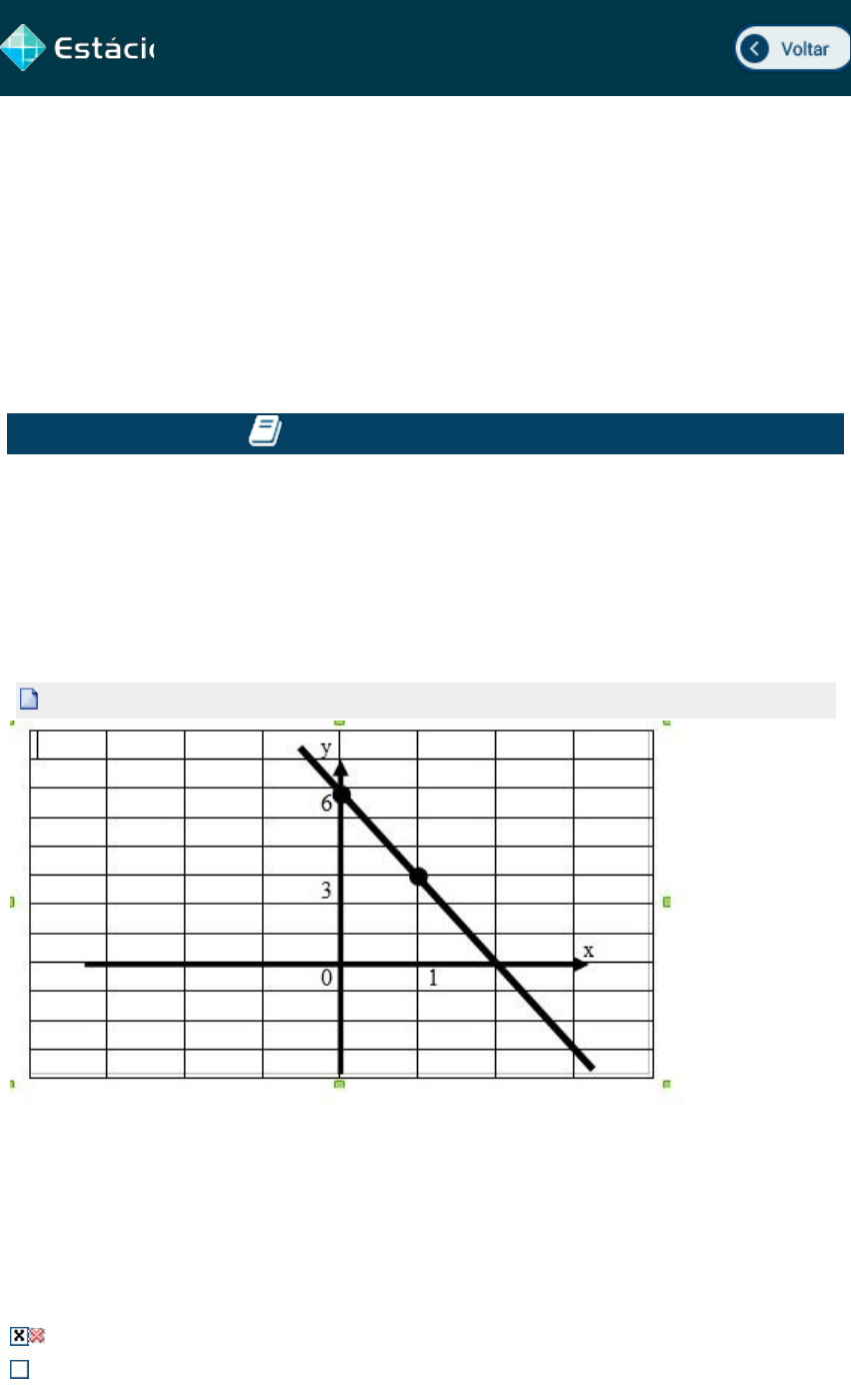 Parte superior do formulário ROSIMERY TINOCO DE MACEDO 201802152318 EAD CAMPOS DOS GOYTACAZES - RJ ANÁLISE DAS VARIAÇÕES Avaliando Aprend.: CCE1428_SM_201802152318 V.1 Aluno(a): ROSIMERY TINOCO DE MACEDO Matrícula: 201802152318 Desemp.: 0,2 de 0,5 18/05/2018 16:31:24 (Finalizada) 1a Questão (Ref.:201804993881) Pontos: 0,0 / 0,1 Assinale a ÚNICA alternativa correta quanto à função apresentada no gráfico acima: A função é afim. A função é crescente A função é quadrática. A função é constante. A função é decrescente. 2a Questão (Ref.:201805079741) Pontos: 0,0 / 0,1 Considere que uma cidade tenha uma população de 20000 habitantes e que, a partir de um determinado ano, passe a crescer a uma taxa de 12% ao ano. Apresente o valor aproximado da população 10 anos após o momento inicial: 43287 77920 129926 57893 67117 3a Questão (Ref.:201805077082) Pontos: 0,0 / 0,1 A figura a seguir apresenta a variação da taxa de fecundidade por mulher no Brasil no período de 1940 a 2010: (extraído de http://g1.globo.com/brasil/noticia/2012/10/taxa-de-fecundidade-e-menor-entre-mais-jovens-e-instruidas-diz-ibge.html, acesso em 26 de abril de 2018). Assinale a ÚNICA alternativa que apresenta a região em que houve a MAIOR REDUÇÃO da taxa de fecundidade no país entre os anos de 1940 e 2010. Centro Oeste Norte Sul Sudeste Nordeste 4a Questão (Ref.:201804993883) Pontos: 0,0 / 0,1 Assinale a ÚNICA alternativa que apresenta uma característica da função descrita no gráfico: A função é quadrática. A função é constante. A função é decrescente. A função é crescente. A função é afim. 5a Questão (Ref.:201804993884) Pontos: 0,0 / 0,1 Considerando que as linhas horizontais (e verticais) equidistam de d = 1 unidade de medida, assinale a ÚNICA alternativa que apresenta um par ordenado que NÃO pertence à função descrita no gráfico: (0,1) (0,0) (2,5) (-1, -1) (1,3) 6a Questão (Ref.:201805076543) Pontos: 0,0 / 0,1 Sendo (a + b)3 = a3 + k.a2b + m.ab2 + b3 para todos a e b reais, os valores de k e m são, respectivamente: 3 e -3 3 e 3 -3 e -3 -3 e 3 0 e 0 7a Questão (Ref.:201805076545) Pontos: 0,1 / 0,1 Assinale a única alternativa que apresenta a fatoração de (a + b).x + 3 (a + b) (a - b) (x + 3) n.r.a (a + b) (x + 3) (a - b) (x - 3) (a + b) (x - 3) 8a Questão (Ref.:201804413080) Pontos: 0,1 / 0,1 Uma caixa de bombom possui 250g de peso líquido e 300g de peso bruto. Qual é a razão do peso líquido para o peso bruto? 5/6 4/8 4/6 5/9 3/4 9a Questão (Ref.:201804413189) Pontos: 0,1 / 0,1 Dentre as alternativas abaixo, a que apresenta o número decimal mais próximo do produto 4,32 x 1,42 é: 6,163 6,111 5,742 6,159 5,893 10a Questão (Ref.:201805076553) Pontos: 0,1 / 0,1 A razão entre as formas fatoradas dos polinômios ax + 6a - 4x - 24 e a2 - 8a + 16 é: (x + 6) (x + 6)/(a - 4) (a - 4)(x + 6)/(a - 4)2 (a - 4) (a - 4)(x - 6)/(a - 4)2 Parte inferior do formulário