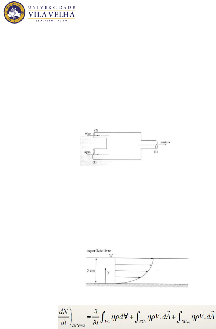 Curso: Engenharia Mecânica Data: 05/06/2018 Disciplina: Mecânica dos Fluidos I Tema: Noções Fundamentais e Estática Obs: Todos os exercícios deverão possuir desenhos/croquis LISTA DE EXERCÍCIOS Um tubo admite água (ρ=1000 kg/m³) em um reservatório com uma vazão de 20L/s. No mesmo reservatório é trazido óleo (ρ=800 kg/m³) por outro tubo com uma vazão de 10L/s. A mistura homogênea formada é descarregada por um tubo cuja seção tem uma área de 30cm². Determinar a massa específica da mistura no tubo de descarga e sua velocidade. O esquema a seguir corresponde à seção longitudinal de um canal de 25 cm de largura. Admitindo escoamento bidimensional e sendo o diagrama de velocidades dado por v=30y—y² (y em cm; v em cm/s), bem como o fluido de peso específico: 0,9 N/L e viscosidade cinemática: 70 cSt e g=10m/s, determinar: - O gradiente de velocidade para y=2 cm; - A máxima tensão de cisalhamento na seção (N/m²) - A velocidade média na seção em cm/s - A vazão em massa na seção Dê a interpretação física de cada um dos termos do TEOREMA DE TRANSPORTE DE REYNOLDS, apresentado abaixo: Considere o escoamento permanente de água em uma junção de tubos, conforme mostrado no diagrama. As áreas das seções são: A1 = 0,2 m², A2 = 0,2 m² e A3 = 0,15 m². O fluido também vaza para fora do tubo através de um orifício em (4) com uma vazão volumétrica estimada em 0,1 m³/s. As velocidades médias nas seções (1) e (3) são V1 = 5 m/s e V3 = 12 m/s, respectivamente. Determine a velocidade do escoamento na seção (2). O fluido em contato direto com uma fronteira sólida estacionária tem velocidade zero; não há deslizamento na fronteira. Então, o escoamento sobre uma placa plana adere-se à superfície da placa e forma uma camada-limite, como esquematizado a seguir. O escoamento a montante da placa é uniforme com velocidade 𝑉 ⃗=𝑈𝑖 ̂; U = 30 m/s. A distribuição de velocidade dentro da camada-limite (0≤𝑦≤𝛿) ao longo de cd é aproximada por 𝑢/𝑈=2(𝑦/𝛿)−(𝑦/𝛿)². A espessura da camada-limite na posição d é 𝛿=5𝑚𝑚.O fluido é ar com massa específica = 1,24 kg/m³. Supondo que a largura da placa perpendicular ao papel seja w = 0,6 m, calcule a vazão em massa través da superfície bc do volume de controle abcd. Um tanque, com volume de 0,05 m³, contém ar a 800 kPa (absoluta) e 15°c. Em t = 0, o ar começa a escapar do tanque através de uma válvula com área de escoamento de 65 mm². O ar passando através da válvula tem velocidade de 300 m/s e massa específica de 6 kg/m³. Determine a taxa instantânea de variação da massa específica do ar no tanque em t = 0. O tanque abaixo (circular) está sendo completado com água por duas entradas. Ar está preso no topo do tanque. O nível de água é indicado por “h”. Encontre uma expressão para a mudança de altura em relação ao tempo 𝑑ℎ/𝑑𝑡 Calcule 𝑑ℎ/𝑑𝑡 se 𝐷1=1", D2=3", 𝑉1=3 𝑝é𝑠⁄𝑠, 𝑉2=2 𝑝é𝑠⁄𝑠 𝑒 𝐴𝑡=2 pé𝑠² (assuma água a 20°C). A água sai de um bocal estacionário e atinge uma placa plana, conforme mostrado. A água deixa o bocal a 15 m/s; a área do bocal é 0,01 m2. Considerando que a água é dirigida normal à placa e que escoa totalmente ao longo da placa, determine a força horizontal sobre o suporte. Água de um canal aberto escoa sob uma comporta. Compare a força horizontal da água sobre a comporta (a) quando a comporta está fechada e (b) quando a comporta está aberta (considerando escoamento permanente, conforme mostrado). Considere que o escoamento nas seções (1) e (2) seja incompressível e uniforme e que (visto que as linhas de correntes ali são retilíneas) as distribuições de pressão são hidrostáticas Uma correia transportadora horizontal, movendo-se a 3 ft/s, recebe areia de uma carregadora. A areia cai verticalmente sobre a correia com velocidade de 5 ft/s e vazão de 500 lbm/s (a massa específica da areia é de aproximadamente 2.700 libras-massa por jarda cúbica). A correia transportadora está inicialmente vazia e vai se enchendo gradativamente com areia. Se o atrito no sistema de acionamento e nos roletes for desprezível, determine a força de tração necessária para puxar a correia enquanto é carregada. Para um escoamento bidimensional no plano xy, a componente x da velocidade é dada por u = Ax. Determine uma possível componente y para escoamento incompressível. Quantas componentes y são possíveis para satisfazer a equação da continuidade? Sob que condições o campo de velocidade abaixo em que a1, b1,... = cte., representa um escoamento incompressível que conserva a massa? Um campo de escoamento incompressível é dado por: , onde A=2s-1, e B=5s-1, e as coordenadas são em metros. Encontre a magnitude e a direção da aceleração do fluido no ponto (x,y)=(4,6). Um amortecedor a gás na suspensão de um automóvel comporta-se como um dispositivo pistão-cilindro. No instante em que o pistão está L = 0,15 m afastado da extremidade fechada do cilindro, a massa específica do gás é uniforme em ρ = 18 kg/m3 e o pistão começa a se mover, afastando-se da extremidade fechada do cilindro com V = 12 m/s. Considere como modelo simples que a velocidade do gás é unidimensional e proporcional à distância em relação à extremidade fechada; ela varia linearmente de zero, na extremidade, a u = V no pistão. Encontre a taxa de variação da massa específica do gás nesse instante. Obtenha uma expressão para a massa específica média como uma função do tempo. Um líquido escoa para baixo sobre uma superfície plana inclinada em um filme laminar, permanente, completamente desenvolvido e de espessura h. Simplifique as equações da continuidade e de Navier-Stokes para modelar esse campo de escoamento. Obtenha expressões para o perfil de velocidades do líquido, a distribuição de tensões de cisalhamento, a vazão volumétric