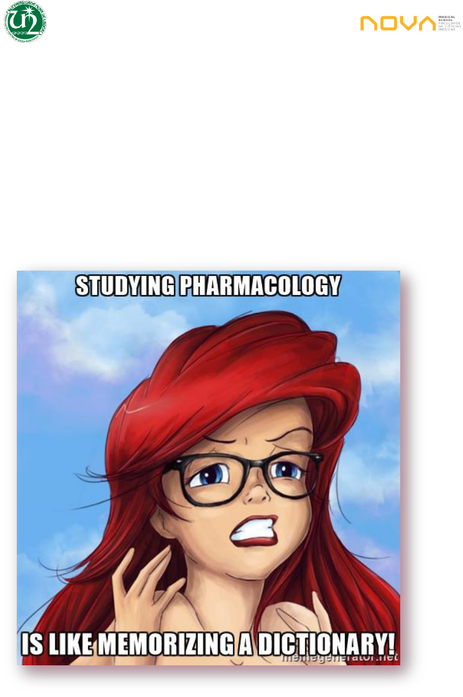 NOVA Medical School Mestrado Integrado em Medicina, 2º Ano Marta Simões, 2016/2017 1 Farmacologia Sebenta Teórica e Prática NOVA Medical School Mestrado Integrado em Medicina, 2º Ano Marta Simões, 2016/2017 2 Índice: Recomendações: Página 3. Agradecimentos: Página 4. Conteúdos: Página 4. Farmacologia Geral: Aulas 1 e 2: Farmacologia Geral. Conceitos Gerais Em Farmacologia. Da Origem Dos Fármacos À Sua Comercialização: O Ciclo De Vida Dos Medicamentos. – Páginas 6-9. Aulas 3 e 4: Farmacocinética Geral. Absorção. – Páginas 10-19. Aulas 5 e 6: Farmacocinética Geral. Distribuição. Metabolização. Excreção. – Páginas 20-24. Aulas 7 e 8: Farmacodinamia Geral I. – Páginas 25-31. Aulas 9 e 10: Farmacodinamia Geral II. – Páginas 32-34. Aulas 11 e 12: Fármacos Que São Proteínas: Propriedades Farmacodinâmicas E Farmacocinéticas. Genéricos E Biossimilares. – Páginas 35-45. Aulas 13 e 14: Farmacologia Geral Da Proliferação Celular. Antineoplásicos . – Páginas 46-51. Aulas 15 e 16: Farmacologia Geral Do Transporte Iónico. Anestésicos Locais. – Páginas 52-56. Aulas 17 e 18: Farmacologia Da Transmissão Gabaérgica E Glutamatérgica. Ansiolíticos E Antiepiléticos. – Páginas 57-64. Aulas 19 e 20: Farmacologia Geral Do Sistema Nervoso Vegetativo Adrenérgico E Colinérgico. – Páginas 65-75. Aulas 21 e 22: Farmacologia Geral Da Inflamação. Fármacos Anti-inflamatórios Não Esteroides. A Artrite Reumatoide. – Páginas 76-85. Aulas 23 e 24: Farmacologia Geral da Inflamação. Anti-inflamatórios Esteroides. Farmacologia Geral Da Histamina. Anti-histamínicos. – Páginas 86-99. Aulas 25 e 26: Farmacologia Da Transmissão Serotoninérgica. Antidepressivos e Ansiolíticos. – Páginas 100-107. Aulas 27 e 28: Anestésicos Gerais. Relaxantes Musculares. – Páginas 108-114. Aula 29: Bases Farmacológicas Da Medicina De Precisão. – Páginas 115-120. Aula 30: Mecanismos Gerais De Hepatotoxicidade E Nefrotoxicidade Induzida Por Fármacos. – Páginas 121-125. Testa-te: da página 126 à página 167. Resoluções: da página 168 à página 216. NOVA Medical School Mestrado Integrado em Medicina, 2º Ano Marta Simões, 2016/2017 3 Recomendações: A Farmacologia Geral é uma cadeira do primeiro semestre do segundo ano e, apesar de valer apenas 4 créditos, considero que é bastante importante para entendermos vários mecanismos fisiopatológicos de diferentes doenças e como podemos intervir de forma a tratá-las da maneira mais eficaz, sendo bastante útil futuramente na prática clínica. É também muito útil para conhecermos os princípios básicos das ciências farmacêuticas e para conhecermos os grupos farmacológicos que temos ao nosso dispor, para melhorar a vida dos nossos doentes. É ainda de extrema importância para percebermos as reações adversas medicamentosas e as interações medicamentosas e alimentares que podem ocorrer, de modo a garantirmos a segurança dos nossos pacientes e prevenirmos a não adesão à terapêutica. No meu ano letivo, ao longo do semestre, foram lecionadas aulas teóricas uma vez por semana de duas horas, que na minha opinião são extremamente úteis na sistematização das matérias, facilitando o nosso estudo e contribuindo para a nossa aprendizagem. Cada turma, por semana, teve também uma aula de cariz teórico-prático, de apenas 50 minutos, mas onde eram revistos os vários temas lecionados nas aulas teóricas prévias, e onde eram realizadas questões individuais de forma a avaliar qualitativa e quantitativamente o desempenho de cada aluno na cadei ra de Farmacologia. As aulas práticas eram bastante úteis e simples, mas deviam ser previamente preparadas. Quando tal acontecia, podem acreditar em mim, o trabalho refletia-se na nota prática final. As presenças nas aulas práticas também contavam para a nota prática final, por isso não faltem! São apenas 50 minutos semanais! Estas são as dicas que tenho para vos ajudar! Não sei se no vosso ano vai ser igual, mas ficam as recomendações. Aqui fica uma pequena “sebenta” (se assim se pode chamar 😊) onde coloquei os apontamentos que fiz ao longo do ano nas aulas teóricas e nas aulas práticas, completado em alguns temas com referências dos livros recomendados na bibliografia (o Golan e o Godman). Os meus conselhos em termos de estudo: para as aulas práticas, se revirem bem as aulas teóricas é suficiente. Para o exame aconselho o estudo pelas aulas teóricas e relativamente à bibliografia recomendo o Golan, o Godman e o Rang. Pessoalmente não gostei do Katzung, mas há quem adore. Espero ajudar alguém e que o meu gosto pela Farmacologia contribua de alguma forma para o vosso estudo! Se precisarem de alguma coisa podem contar a 200% comigo. Para quem não sabe quem sou, chamo-me Marta Simões, basta procurarem! 😉 Boa sorte! Vocês conseguem! Beijocas enormes! NOVA Medical School Mestrado Integrado em Medicina, 2º Ano Marta Simões, 2016/2017 4 Agradecimentos: Tenho de vos confessar que não sou muito formal e não gosto muito destas coisas! Mas alguns agradecimentos particulares têm de ser feitos. Tenho de agradecer aos meus colegas e amigos Nuno Leiria, Inês Marques, Carolina Gavancho, Mélissa Carvalho, Cleida Brito e Inês Gonçalves que me apoiaram a 100% quando decidi realizar uma sebenta sobre Farmacologia, uma cadeira que adorei, e eles sabem que sim. Para além disso, fizeram o excelente trabalho de rever esta sebenta com atenção (embora possa conter alguns erros, e, por isso, desde já, desculpem-nos), após a ter terminado e relido, mas, inevitavelmente, escaparam-me alguns defeitos. E tenho de agradecer também aos meus afilhados, ou aos meus “rebentos”, como gosto de lhes chamar, Carlota Henriques, Catarina Marrucho, Lara Mendes, Telma Lopes e Urmik, pois assim que lhes contei o que estava a fazer agradeceram-me com todas as suas forças 😊! Mas acima de tudo agradeço a todos aqueles que marcam