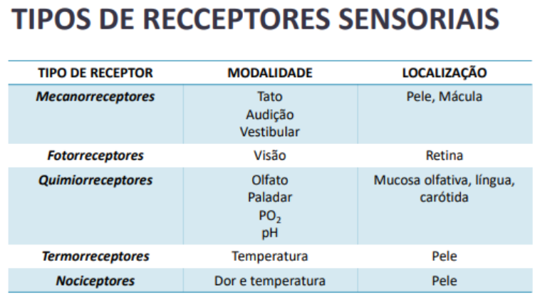 SENSAÇÕES SOMÁTICAS: TATO, PROPRIOCEPÇÃO, DOR E SENSÇÃO TÉRMICA Esses receptores sensoriais são classificados em cinco tipos básicos: ✓ Mecanorreceptores ✓ Termorreceptores; ✓ Nociceptores; ✓ Receptores eletromagnéticos; ✓ Quimiorreceptores. SENSAÇÕES SOMÁTICAS Podem ser classificadas em três tipos fisiológicos: Sensações somáticas mecanorreceptivas – tato e deslocamento do corpo (propriocepção); II. Sensações termorreceptivas – detectam frio e calor; III. Sensação da dor – ativada por fatores que lesionam os tecidos. Obs: Receptores (Estímulo*) – Altera Permeabilidade Canais – Potencial Gerador/Receptor* Potencial Gerador/Receptor* - Limiar – PA – SNC Outras classificações das sensações somáticas Sensações extrarorreceptivas – são provenientes da superfície do corpo. Sensações proprioceptivas – são as relacionadas com o estado físico do corpo, incluindo as sensações de posição, as sensações provenientes do musculo e tendões, as sensações de pressão na sola do pe e ate mesmo a sensação de equilíbrio. Sensações viscerais – são as provenientes das vísceras – órgãos internos. Sensações profundas – são as provenientes dos tecidos profundos, tais como fáscias, músculos e ossos, incluem principalmente a pressão profunda, a dor e a vibração. MECANORRECEPTORES (TATO E PROPRIOCEPÇÃO) Estão localizados na pele não pilosa e pele pilosa. Tato (receptores pele e logo abaixo) pressão (resulta geralmente da deformação dos tecidos profundos) vibração e o resultado da ocorrência de (sinais sensoriais repetitivos e rápidos), porém são usados alguns dos tipos receptores para o tato e pressão. Receptores táteis: Existem pelo menos seis tipos completamente diferentes de receptores táteis, mas existem outros muito similares a eles. 1° algumas terminações nervosas livres – encontradas em toda pele e em muitos outros tecidos, podem detectar pressão e tato. Ex : contato leve com a córnea do olho que não contem outro tipo de terminação nervosa além de terminações nervosas lives, pode mesmo assim desencadear sensações de tato e de pressão. 2° Corpúsculo de Meissner – tem grande sensibilidade. Terminação de fibra nervosa sensorial mielinizada grossa, alongada e encapsulada. Eles estão presentes na pele glabra e são particularmente abundantes nas pontas dos dedos, nos lábios e outras áreas da pele onde a capacidade de discriminar localizações especiais das sensações táteis muito desenvolvida. Eles adaptam em fração de segundos depois de serem estimulados. 3° Discos de Merkel - são agrupados no órgão receptor chamado receptor em cúpula de Iggo, que se projeta contra a parte inferior do epitélio da pele. O conjunto dos discos de Merkel e inervado por uma só fibra nervosa mielinizada e grossa. As pontas dos dedos e outras áreas que contem um grande numero de corpúsculos de meissner também contem grande numero de receptores táteis com terminações expandidas, e um desses tipos são os disco de merkel. ADAPTAÇÃO SENSORIAL A adaptação sensorial é um fenômeno que ocorre na maioria dos receptores sensoriais, resultado do declínio do potencial gerador mesmo na presença do estímulo. Cada receptor possui uma adaptação diferente. Todos os receptores sensoriais eles se adaptam, parcial ou completamente. Ou seja, quando um estimulo sensorial continuo e aplicado, o receptor responde incialmente com alta frequência de impulsos, seguida por frequência progressivamente menor e, finalmente, por frequência de potenciais de ação muito baixo ou, em geral, cessam os impulsos. Adaptação lenta – receptores tônicos (transmissão contínua dos estímulos) – vai transmitir impulso durante todo o tempo que o estimulo estiver presente. Os impulsos dos fusos musculares e dos aparelhos tendinosos de Golgi possibilitam que o sistema nervoso seja informado sobre o estado da contração muscular e da carga sobre o tendão a cada instante. Receptores da macula no aparelho vestibular Receptores da dor Barorreceptores do leito arterial Quimiorreceptores dos corpos carotídeo e aortico Adaptação rápida – receptores fásicos (transmitem os estímulos sempre após variação dos mesmos) Ler na pagina 593 do GUYTON os exemplos NOCICEPÇÃO (DOR) A dor é uma sensação que representa ao corpo agressão/destruição tecidual, resultando em reação do indivíduo para tirar o estímulo doloroso A dor e classificada e dois tipos principais: dor rápida : e sentida, dentro de 0,1 segundos, após a aplicação de um estimulo doloroso. A dor rápida também e conhecida como dor pontual, dor em agulhada, dor aguda e dor elétrica. Esse tipo de dor e sentida quando a agulha e introduzida na pele, quando a pele e cortada, choque eletrico ou quando a pele e agudamente queimada. Não e sentida nos tecidos mais profundos do corpo. E desencadeada por estímulos mecânicos e térmicos. dor lenta : ocorre após 1 segundo, e alguma vez dura ate minutos. E conhecida como dor em queimação, dor persistente, dor pulsátil, dor nauseante e dor crônica. Esta associado a destruição tecidual E estimulada por estímulos dolorosos mecânico, térmicos e quimicos Receptores para dor e sua estimulação: Os receptores para a Dor são terminações nervosas livres Existem dispersos na camada superficial da pele, bem como em certos tecidos interno, como o priosteo, as paredes das artérias, as superfícies articulares e a foice e o tentorio da abóbada craniana. São estimulados por estímulos dolorosos mecânicos, térmicos e químicos. Substancias que excitam o tipo químico: Bradicinina Serotonina Histamina Ions potássio Acidos Acetilcolina Enzimas proteolíticas As Prostaglandinas e a substancia P aumentam a sensibilidade das terminações nervosas, mas não excitam diretamente essas terminações. Nociceptores térmicos ou mecânicos - Dor rápida (fibras nervosas aferentes pouco mielinizad