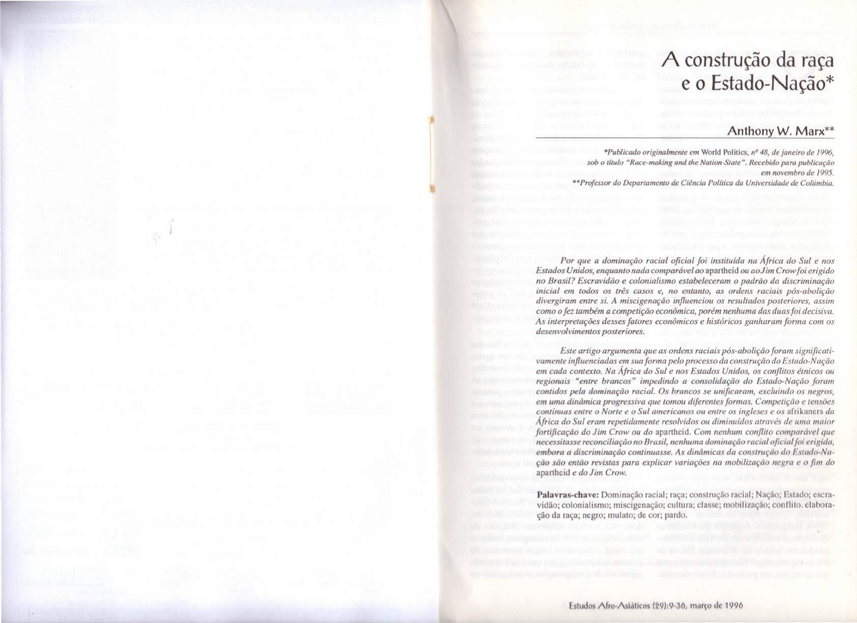 A construção da raça e o Estado-Nação* Anthony W. Marx** *Publicado originalmente em World Politics, li" 48, de janeiro de 1996, sob o título "Race-making and lhe Nation-State", Recebido para publicação em novembro de 1995. **Professor do Departamento de Ciência Polltica da Universidade de Colúmbia. Por que a dominação racial oficial foi instituída na África do Sul e nos Estados Unidos, enquanto nada comparável ao apartheid ou ao Jim Crow foi erigido no Brasil? Escravidão e colonialismo estabeleceram o padrão da discriminação inicial em todos os três casos e, no entanto, as ordens raciais pós-abolição divergiram entre si. A miscigenação influenciou os resultados posteriores, assim como o fez também a competição econômica, porém nenhuma das duas foi decisiva. As interpretações desses fatores econômicos e históricos ganharam forma com os desenvolvimentos posteriores. Este artigo argumenta que as ordens raciais pós-abolição foram significati- vamente influenciadas em sua forma pelo processo da construção do Estado-Nação em cada contexto. Na África do Sul e nos Estados Unidos, os conflitos étnicos ou regionais "entre brancos" impedindo a consolidação do Estado-Nação foram contidos pela dominação racial. Os brancos se unificaram, excluindo os negros, em uma dinâmica progressiva que tomou diferentes formas. Competição e tensões contínuas entre o Norte e o Sul americanos ou entre os ingleses e os afrikaners da África do Sul eram repetidamente resolvidos ou diminuídos através de uma maior fortificação do Jim Crow ou do apartheid. Com nenhum conflito comparável que necessitasse reconciliação no Brasil, nenhuma dominação racial oficial]oi erigida, embora a discriminação continuasse. As dinâmicas da construção do Estado-Na- ção são então revistas para explicar variações na mobilização negra e o fim do apartheid e do Jim Crow. Palavras-chave: Dominação racial; raça; construção racial; Nação; Estado; escra- vidão; colonialismo; miscigenação; cultura; classe; mobilização; conflito. elabora- ção da raça; negro; mulato; de cor; pardo. I si lidos Afro-Asiátlcos (2<)):<) 36, março de 1 <)<)6 A construção da raça e o Estado-Nação Anthony W. Marx na esteira da escravidão. Tanto na África do Sul como nos Estados Unidos, o resultado foi - com diferenças significativas - o es- tabelecimento de ideologia racial oficial, ca- tegorias de segregação e conflito impostas e o desmonte apenas recente da discriminação legal. O Brasil pós-abolição, ao contrário, evi- tou distinções legais baseadas na raça, proje- tando uma imagem de democracia racial. Embora o racismo fosse comum e a desigual- dade contínua, não se aprovou nada equiva- lente ao apartheid ou a Jim Crow", Esses resultados diferenciados apresentam um quebra-cabeça interessante para uma análise comparativa. Neste texto, avalio inicialmente as ex- plicações que foram dadas à construção da raça, sob a alegação de que se baseava em diferenças entre os tipos de escravidão, cul- tura, governo colonial, miscigenação e desenvolvimento econômico. Essas influên- cias devem ser incorporadas à presente aná- lise, mas questiono o argumento que afirma que esses legados e interesses predispuseram uma ordem racial mais tolerante no Brasil. Os brasileiros podem ter reinterpretado re- trospectivamente seu passado, reforçando, assim, uma imagem de tolerância racial, mas, na verdade, o racismo se evidenciou tão cedo no Brasil como nos Estados Unidos ou na África do Sul (embora de forma diferente), de modo que a desigualdade persistiu. Nos Estados Unidos e na África do Sul, diferen- temente, a discriminação passada foi assu- mida e usada para justificar a segregação e a exclusão. Essa diferença de tipo não se ex- plica por graus comparáveis de discrimina- ção ou exploração. Os projetos oficiais de Jim Crow nos Es- tados Unidos e do apartheid na África do Sul gorizados e submetidos a uma dominação específica em função da raça, provocando conflito ou não? Proponho-me analisar as causas e con- seqüências da construção da raça por meio de uma análise comparativa entre África do Sul, Estados Unidos e Brasil, casos mais destacados em que colonos europeus domi- naram os nativos e escravizaram populações de origem africana.' Em todas essas grandes potências regionais, as mensurações sociais e econômicas indicam disparidades signifi- cativas e persistentes entre negros e brancos, baseadas na herança da escravidão. No en- tanto, os diferentes contextos deixam evi- dente, entre os três casos, uma distância que os torna úteis para um estudo comparativo sobre a dinâmica da dominação racial oficial. Os holandeses, britânicos e portugueses le- varam diversas práticas, religiões e tradições para suas colônias, o que explica os cami- nhos divergentes adotados nos respectivos desenvolvimentos econômicos e na consoli- dação do Estado. Ao contrário da África do Sul, os Estados Unidos sempre prometeram direitos iguais em sua Constituição, à qual os afro-america- nos podiam recorrer, e de fato recorriam. A demografia também era diferente: as pessoas de origem africana sempre foram minoria nos Estados Unidos, enquanto os africanos nativos sempre constituíram a maioria na África do Sul e, no Brasil, o número de pessoas com antepassados africanos e euro- peus passou a ser praticamente igual. A discriminação racial foi onipresente no início da história da África do Sul, ao passo que nos Estados Unidos e no Brasil as polí- ticas estatais pós-abolição codificaram or- dens raciais muito diferentes. À época da consolidação do Estado emergente, todos os três casos enfrentaram longos momentos de relativa indeterminação e um desafortunado repertório de configurações raciais possíveis ~~oproblema da linha de cor" foi descrito por W. E. B. Du Bois como preocupação central deste século. De fato, 