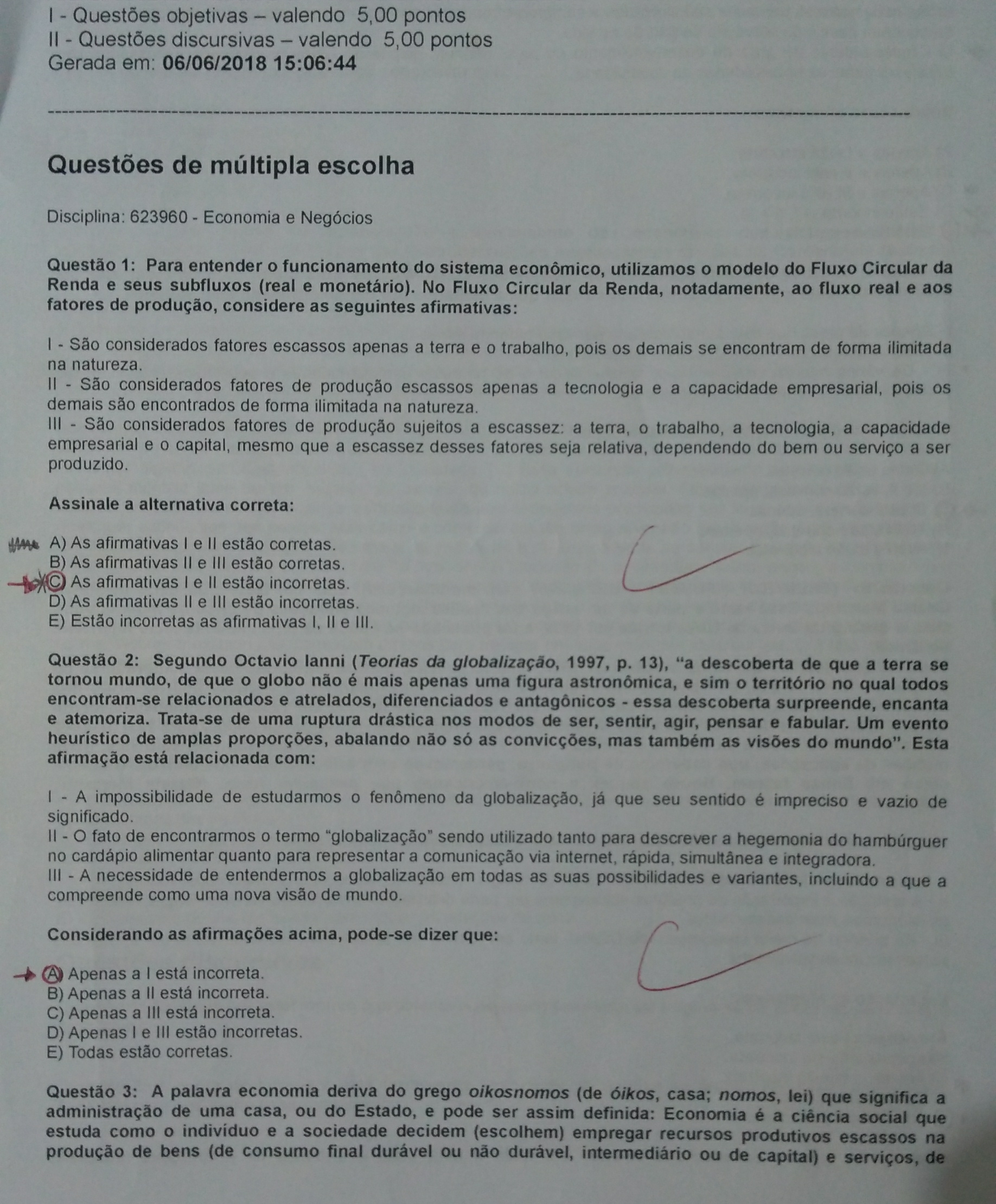 ECONOMIA E NEGÓCIOS - questionário I unip