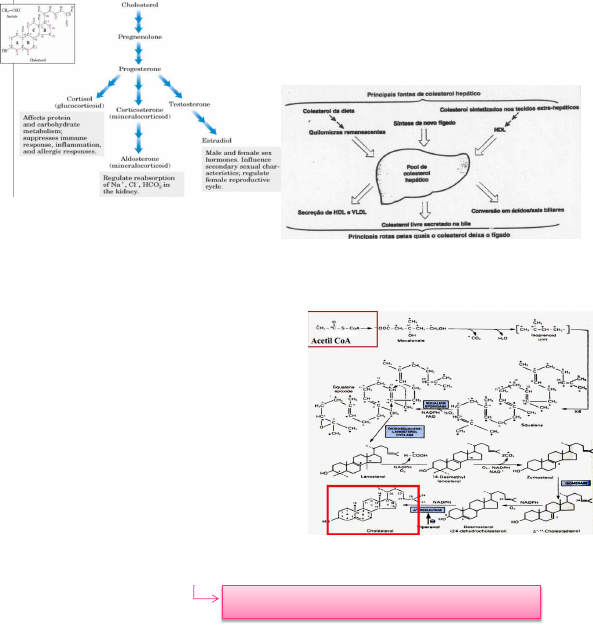 Tayná Monteiro M3 2014.2 taynamonteiros@gmail.com TRANSCRIÇÃO PROVA 2 – PCI ENDÓCRINO Metabolismo e Transporte de Colesterol: Biossíntese de Hormônios Esteroides O colesterol é a molécula lipídica que dá origem aos hormônios esteroides. É importante para a manutenção das membranas celulares, dos microdomínios lipídicos (função de sinalização celular, local entrada de vírus, cavéolas), contribuindo para uma maior resistência (menos fluidez) nesses domínios. A principal função do colesterol é montar as membranas, temos síntese, mas pode ser insuficiente por isso há necessidade de uma ingestão diária. O corpo obtém colesterol através da alimentação (carne, gordura animal, gema de ovo e frutos do mar) e através da síntese. O fígado precisa manter um nível de colesterol. O fígado faz a conversão para a secreção do colesterol na bile e principalmente, organiza o colesterol em lipoproteínas HDL e VLDL (VLDL vai para o plasma para poder distribuir o colesterol de acordo com as necessidades dos tecidos extra-hepáticos). A biossíntese do colesterol é muito complexa, ele é formado a partir de acetil CoA – que vem da glicólise (forma piruvato e acetil CoA). O colesterol é um lipídio, logo precisa de insulina para sua biossíntese, ou seja, sua biossíntese acontece em um período pós prandial. Sintetiza-se então AG e colesterol. A insulina é responsável por sinalizar a principal enzima para que a biossíntese deslanche. Da mesma maneira, glucagon inibe a biossíntese de colesterol, a epinefrina, cortisol e ACTH também ( situação de estresse -> degrada lipídeo). Além do metabolismo dos AGs, o glucagon e a epinefrina podem regular a biossíntese do colesterol. O acetil CoA é a molécula que vai doar seus carbonos para formar o colesterol. O acetil CoA vem da glicólise, logo para produzir colesterol, precisa comer carboidratos. Às vezes pessoas com uma dieta boa e peso normal têm colesterol alto – não poderíamos mudar a dieta dessas pessoas, ou então de crianças que se encontram nesse caso, de modo que precisaríamos usar drogas para melhorar a situação – estatinas. Estatina é uma droga que inibe uma enzima importante para a produção de colesterol, a HMG-CoA redutase, reduzindo a biossíntese de colesterol. Como esses hormônios de fato interagem com a enzima HMG-CoA redutase? O glucagon e a epinefrina inibem a enzima através da PKA, fosforilando; e a insulina ativa através de uma desfosforilação por uma fosfatase. As estatinas são moléculas que se ligam à enzima, causando uma inibição alostérica. HMG-CoA redutase é a uma enzima regulada da produção de colesterol que constitui o único ponto de regulação. Fisiologicamente, os hormônios insulina e glucagon são os responsáveis pela regulação da biossíntese de colesterol, uma vez que eles regulam essa enzima (HMG-CoA redutase). Obs: o colesterol está sendo relacionado às diversas patologias, inclusive o HIV. Certos vírus quando chegam à célula, “escolhem” justamente as cavéolas (regiões ricas em colesterol) para ser o local de entrada do vírus, dessa maneira, o colesterol pode implicar uma forma de sinalização celular. Obs²: No exercício físico, glucagon e adrenalina diminuem a produção de colesterol, e por isso uma melhora geral do quadro metabólico. A aveia tem uma propriedade de se ligar ao lipídeo e ser excretado. Existem maneiras alternativas de diminuir o colesterol, que não seja usar estatinas. Nas gorduras (lipídeos) que ingerimos, sempre há uma quantidade de colesterol e de triacilglicerol. Geralmente, há até mais triacilglicerol que colesterol. O triacilglicerol é degradado pelas lipases intestinais –produzida no pâncreas- (quebra o triacilglicerol em ácidos graxos, que serão absorvidos pelo intestino). O xenical age na lipase e impede que o triacilglicerol seja hidrolisado em ácidos graxos, dessa maneira o triacilglicerol será excretado nas fezes – não há efeitos colaterais, exceto uma anemia carencial em usos prolongados. O intestino absorve o lipídio (apolar), mas como ele vai passar para o fígado se ele precisa passar pelo plasma (polar)? Os lipídios precisam de uma molécula para ser transportados => o intestino organiza esses lipídios sobre a forma de quilomícrons. Quilomícrons são lipoproteínas, transportam lipídios (TAGs principalmente e também o colesterol) da “mesma maneira” que a albumina transporta proteínas e a hemoglobina transporta o heme. Os quilomícrons são sintetizados no intestino a partir da dieta. Existe a remoção dos AGs (pela lipoproteína lipase) e o quilomícron remanescente é remanescente do metabolismo dos tecidos. O fígado é capaz de quebrar esses quilomícrons remanescentes e utilizar esses lipídios e ácidos graxos para a síntese de outras lipoproteínas. Todas as lipoproteínas têm um núcleo composto principalmente de lipídios altamente hidrofóbicos (ex.: triacilglicerol) e na sua porção externa, que vai ficar em contato com o ambiente aquoso, temos moléculas carregadas, ou seja, mais hidrofílicas. Temos basicamente então no interior de uma lipoproteína um triacilglicerol e nas suas extremidades, um éster de colesterol. Lipoproteínas lipase – como elas estão inseridas no metabolismo celular? Ela vai ser degradada no fígado, ele recebe os lipídios da alimentação através desses quilomícrons remanescentes (que não foram utilizados pelos tecidos periféricos). Só existe UM colesterol, que está associado à uma proteína. O LDL é a lipoproteína, e não o “colesterol ruim ou bom”. LDL: A parte amarela representa a parte proteica da lipoproteína e um núcleo lipídico – dentro desse núcleo temos lipídios mais hidrofóbicos, que são os triacisgliceróis e os colesteróis esterificado e por fora desse núcleo, temos os lipídios mais hidrofílicos, os fosfolipídios. Existem várias classes de lipoproteínas, o quilomícron - c