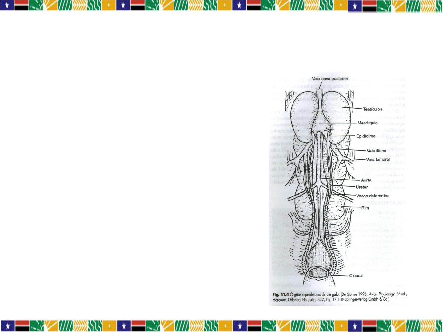 SISTEMA REPRODUTOR MASCULINO O sistema reprodutor masculino das aves é composto por: Testículos Produção de hormônios e Gametas Células de Sertoli Células de Leyding 1 FONTE: DUKES, 2006 2 Histologia Fonte:www.ufrgs.br/auladeembrio/ppts/gametog.pdf Células de Sertoli Histologia 3 Fonte:www.ufrgs.br/auladeembrio/ppts/gametog.pdf Epidídimo Órgão pequeno complexo Possui labirintos e ductos Os ductos ligam-se ao tubo deferente Ducto deferente distal conduz sêmen à cloaca 4 5 Ductos Secretores FONTE: DUKES, 2006 Sêmen Possui pequeno volume porém uma alta concentração de espermatozoides. Anatomia das aves com ausência de glândulas bulbouretrais, próstata ou glândulas vesiculares 6 Cruzamento Aves não possuem pênis verdadeiro Cruzamento ocorre por contato cloacal Macho libera líquido semelhante linfa durante a excitação 7 FONTE:elnacional.com.do/estudian-copula-inversa-de-las-aves/ Espermatogênse 8 FONTE:www.ufrgs.br/auladeembrio/ppts/gametog.pdf Espermatozóide (Galo) São menores que os dos mamíferos Possuem cabeças longas e filamentosas Não possuem gota citoplasmática 9 FONTE:www.uff.br/fisiovet/Reprod_aves.pdf