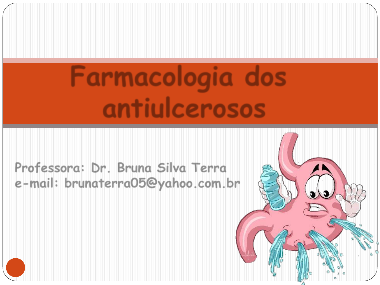 Professora: Dr. Bruna Silva Terra e-mail: brunaterra05@yahoo.com.br Farmacologia dos antiulcerosos 1 “quaisquer lesões superficiais em tecido cutâneo ou mucoso” Úlcera Ruptura do epitélio, de modo a haver exposição de tecidos mais profundos 2 3 4 5 Histamina – Receptor H2 Acetilcolina (AChE) – Receptor M3 Gastrina – CCK2 Fatores que controlam a secreção gástrica Somastatina – Receptor CCK2 6 7 Defesa da secreção ácida Estimulado pelas Prostaglandinas E2 e I2 – Receptor EP3 Produção de uma camada de muco - retenção de HCO3 - 8 ECL – células enterocromafins 1. Infecção por H. Pilori 2. Uso prolongado por AINES 3. Secreção excessiva de HCl 4. Tumor secretor de Gastrina (Síndrome de Zollinger-Ellison) 9 Principais causas de doenças ácido-pépticas 10 H. pylori 11 12 secreção HCl secreção de HCO3 - secreção de muco vascularização da mucosa PGE2 PGI2 13 Tipos de Ulcerações 14 ECL – células enterocromafins 15 Supressão ácida Antagonista receptores H2 Inibidores de bomba de prótons Antiácidos Proteção da mucosa Agentes de barreira Prostaglandinas e análogos Fármacos empregados 16 Antagonistas receptores H2 Age como antagonista da ação da histamina. Este fármaco inibe a secreção basal de ácido gástrico, e reduz tanto o volume quanto o conteúdo de ácido (HCl) e de pepsina. 17 Antagonistas receptores H2 Exemplos Receptor H2 Receptor H2 histamina ranitidina Antagonistas receptores H2 Impede que a histamina se ligue ao receptor H2 Mecanismo de ação 19 Antagonistas receptores H2 Mecanismo de ação 20 Efeitos colaterais De modo geral são bem tolerados pelos pacientes Pode causar: Diarreia, cefaleia, sonolência, fadiga, dor muscular e constipação Interação medicamentosa Cimetidina: inibe CP450 -> aumenta o nível dos fármacos que são metabolizados por essas enzimas -> quase não é utilizada Ranitidina: afinidade de apenas 10% com CP450 Redução na absorção do cetoconazol por aumento do pH intragástrico. Antagonistas receptores H2 Tratamento de úlcera não complicada, quando necessário uso contínuo de AINE – dose terapêutica Prevenção de úlceras duodenais – dose dupla é efetiva para prevenir úlceras gástricas e duodenais por uso crônico de AINE Úlcera ativa, doença do refluxo gastresofágico, esofagite erosiva, dispepsia funcional. Antagonistas receptores H2 Indicações 22 Inibidores de Bomba de prótons Inibem a H+, K+-ATPase gástrica, diminuindo a produção diária de ácido (basal e estimulada) em 80-95%; São os supressores mais potentes. 23 Inibidores de Bomba de prótons 24 Inibidores de Bomba de prótons Mecanismo de ação 25 Inibidores de Bomba de prótons Mecanismo de ação São pró-fármacos: precisam ser ativados em meio ácido H+ Enzima da bomba de prótons Inibição irreversível 26 Inibidores de Bomba de prótons Efeitos colaterais De modo geral são bem tolerados pelos pacientes Pode causar: Náusea, dor abdominal, flatulencia, diarreia e constipação Hipergastrinemia: mais frequente com iBPs do que com antagonias H2 • Níveis de gastrina muito elevado • Hipersecreção de rebote de HCl • Pode promover o crescimento de tumores gastrintestinais 27 Inibidores de Bomba de prótons Interação medicamentosa Os inibidores de bomba de prontons são metabolizados pela CP450 -> interfere na eliminação de outros fármacos. Omeprazol diminui a depuração de dissulfiram, fenitoína Omeprazol aumenta a depuração de imipramina, antipsicóticos, teofilina Omeprazol aumenta toxicidade de clorazepato. Omeprazol e lansoprazol reduzem a concentração de vários antirretrovirais. Omeprazol aumenta o efeito de citalopram, com aumento do intervalo Q-T (arritmias). Omeprazol aumenta o efeito de varfarina. Omeprazol e reduzem efeito de clopidogrel – aumento do risco de trombose. Indicações Úlceras gástricas e duodenais ativas e não complicadas – 1ª escolha Alto risco de complicações ulcerosas induzidas por AINEs – 1ª escolha Incluir em regimes terapêuticos para úlcera recentemente diagnosticada ou recorrente por H. pylori ou por uso de AINEs Doença do refluxo gastresofágico Síndrome de Zollinger-Ellison – omeprazol 20-160 mg/dia, lansoprazol 30-165 mg/dia. Inibidores de Bomba de prótons Antiácidos Muito utilizados pelos pacientes Compostos básicos que neutralizam o HCl Exemplos: NaHCO3 NaCO3 CaCO3 Mg(OH)2 Al(OH)3 Antiácidos Mecanismo de ação 31 Antiácidos Efeitos colaterais Secreção ácida de rebote -> administração mais frequente; Podem elevar o pH urinário; Antiácidos com Al3+, Ca2+ e Mg2+ são menos absorvidos que Na+; Al3+ -> pode contribuir para osteoporose, encefalopatia e o miopatia; Ca2+ -> hipercalcemia transitória; Alteram o pH do estomago -> interfere na absorção de outros fármacos administrados concomitantes. 32 Supressão ácida Antagonista receptores H2 Inibidores de bomba de prótons Antiácidos Proteção da mucosa Agentes de barreira Prostaglandinas e análogos Fármacos empregados 33 Agentes de barreira São fármacos gastro protetores Estimula a produção local de prostaglandinas e fator de crescimento epidérmico Inibe a hidrólise das proteínas da mucosa pela pepsina Formam polímero viscoso e pegajoso que adere as células epiteliais e as crateras das úlceras 34 Agentes de barreira Sucralfato Sal de sacarose complexado com Al(OH)3 Ativado em pH ácido Forma um gel que protege a mucosa Composto de bismuto Subsalicilato de bismuto 35 Agentes de barreira Mecanismo de ação - sucralfato 36 Agentes de barreira Medicamento Ação Efeito colateral Sulcratato • Gel protetor da mucosa • Estimula a síntese de PG Constipação Subsalicilato de bismuto • Reveste a base da lesão ulcerosa • Estimulada a produção de mucina e bicarbonato • Efeito antimicrobiano frente H. pylori Náusea, vômitos diarreia, tonturas, cefaléia Sulcralato: pouco utilizado devido as efeitos colaterais e a baixa adesão do paciente (administração 4x