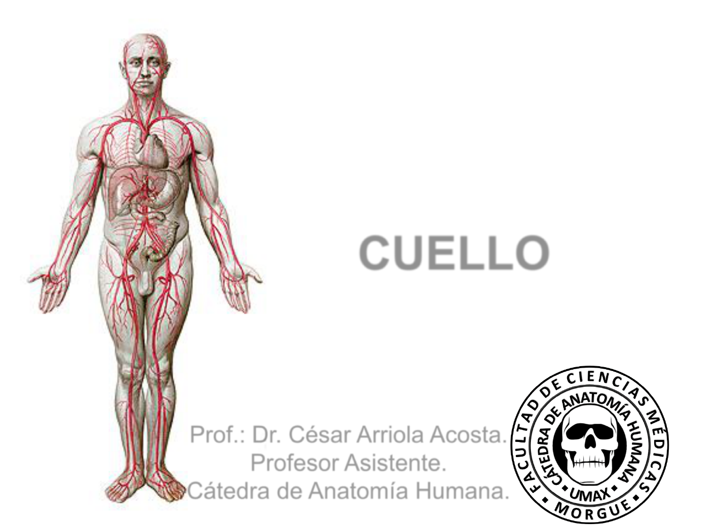 * Prof.: Dr. César Arriola Acosta. Profesor Asistente. Cátedra de Anatomía Humana. CUELLO * Esqueleto óseo de la cabeza y el cuello * Hioides * Hioides Hueso impar, medio, simétrico, situado en la parte anterior del cuello. Convexo por delante, cóncavo por detrás, adopta forma de herradura. Se le considera un cuerpo y cuatro astas. 1º Cuerpo: presenta dos caras (anterior y posterior) y dos bordes (superior e inferior) 2º Astas mayores: se dirigen horizontalmente hacia fuera y atrás. Termina en un vértice, libre para el ligamento tirohioideo lateral. 3º Astas menores: se dirigen de abajo-arriba, de dentro-afuera y de delante-atrás. Su vértice es para el ligamento estilohioideo. * * Músculos del cuello 1º Región lateral: platisma esternocleidomastoideo escalenos 2º Región hioidea: * suprahioideos: digástrico - milohoideo estilohoideo - genihioideo * infrahioideos: esternohioideo - esternotiroideo omohioideo - tirohioideo 3º Región prevertebral: - recto anterior mayor de la cabeza - recto anterior menor de la cabeza - largo del cuello * Musculo platisma * estilohioideo Vientre posterior digástrico Vientre anterior digástrico milohioideo esternocleidomastoideo trapecio * Triangulos del cuello omohioideo Triangulo occipital Triangulo supraclavicular omohioideo Triangulo digástrico Triangulo carotídeo Triangulo muscular * Triangulo carotídeo omohioideo Vientre posterior del digástrico esternocleidomastoideo * Triangulo muscular * Triangulo submentoniano o suprahioideo Triangulo submaxilar o digástrico * milohioideo Musculos suprahioideos Mnemotecnia Diga esto mi general Diga: Digástrico Esto: estilohioideo Mi: milohioideo General: geniohiodeo Vientre anterior digástrico * milohioideo Vientre anterior digástrico Musculos suprahioideos * Musculos suprahioideos * milohioideo Vientre anterior digástrico Vientre posterior digástrico Musculos suprahioideos Musculos infrahioideos * Musculos infrahioideos * Musculos hioideos - acción * Nervios supraclaviculares Contenido del triangulo posterior * Glándula tiroides y paratiroides * Glándula tiroides y paratiroides * Glándula tiroides y paratiroides * Glándula tiroides y paratiroides * Arterias del cuello y cabeza * Mnemotecnia: Ti-li-fa-fa-oc-aupai-te-ma Arteria carótida externa * Ramas de la arteria carótida externa Arteria tiroidea superior Arteria lingual Arteria facial Arteria faríngea ascendente Arteria occipital Arteria auricular posterior Arteria temporal superficial Arteria maxilar interna * * Arteria tiroidea superior Rama infrahioidea Rama esternomastoidea Rama laríngea superior Rama cricotiroidea Ramas glandulares * * Arteria lingual Porciones posterior, profunda y anterior al músculo hiogloso Rama suprahioidea Ramas dorsales de la lengua Rama sublingual Rama profunda de la lengua (ranina) * * Arteria facial Rama palatina ascendente Rama tonsilar Ramas glandulares submaxilares Rama submentoniana Rama labial inferior Rama labial superior Rama nasal externa Rama angular * A. facial * Arteria occipital Porciones: anterior, profunda y posterior al esternocleidomastoideo. Ramas esternomastoideas Ramas menígeas Ramas occipitales * Arteria auricular posterior Ramas parotídeas Ramas esternomastoideas Ramas auriculares Ramas mastoideas * Nervio hipogloso * Arteria temporal superficial Rama transversa de la cara Ramos articulares Ramos auriculares anteriores Ramos frontal y parietal * Arteria temporal superficial * Arteria maxilar interna Porciones y ramas: 1º maxilar; 2º pterigoidea; 3º pterigopalatina Porción maxilar auricular profunda timpánica anterior meníngea media meníngea menor dentaria inferior Porción pterigoidea temporal profunda anterior temporal profunda posterior maseterina bucal pterigoideas Porción pterigopalatina palatina descendente dentaria superior infraorbitaria vidiana faríngea (pterigopalatina) esfenopalatina * Arteria maxilar interna Mnemotecnia: La dentista tia Me-Me busca mas Te-Te para paladear el dentífrico de la infanta Violeta Fariña Dentista: dentaria inferior TIA : timpánica anterior – auricular profunda ME-ME : meníngea media – meníngea menor Busca: bucal Mas: maseterina TE-TE: temporal profunda anterior – temporal profunda posterior Para: pterigoideas Paladear: palatina superior o descendente Dentífrico: dentaria posterosuperior Infanta: infraorbitaria Violeta: vidiana o del conducto pterigoideo Fariña: faríngea o pterigopalatina * Arteria maxilar interna * Arteria maxilar interna * Arteria maxilar interna * Arteria subclavia Arteria vertebral Arteria mamaria interna Tronco costocervical Tronco tirobicervicoescapular Arteria escapular posterior INDIO VER TRES CIERVOS, DE UN TIRO DOS ESCAPAR Y UNO MATAR IN: tronco intercostal superior. VER: arteria vertebral. 3 CIERVOS: 3 arterias cervicales: ascendente, transversa y profunda. 1 TIRO: 1 tiroidea: arteria tiroidea inferior. 2 ESCAPAR: dos arterias escapulares: supraescapular y escapular posterior. 1 MATAR: Una mamaria: arteria mamaria interna. * * Nervio frénico Plexo braquial Musculos escalenos * Musculos prevertebrales *