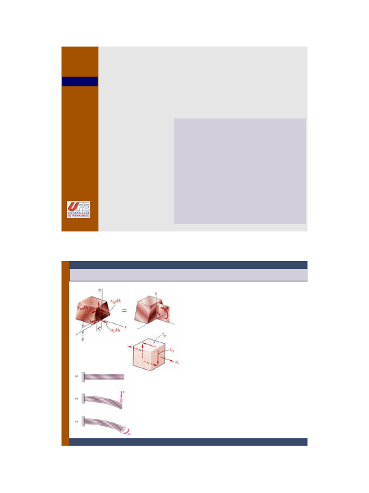 16/02/2010 1 RESISTÊNCIA DOS MATERIAIS CAPITULO Notas de Aula: Prof. Gilfran Milfont As anotações, ábacos, tabelas, fotos e gráficos contidas neste texto, foram retiradas dos seguintes livros: -RESISTÊNCIA DOS MATERIAIS- Beer, Johnston, DeWolf- Ed. McGraw Hill-4ª edição-2006 - RESISTÊNCIA DOS MATERIAIS-R. C. Hibbeler-Ed. PEARSON -5ª edição- 2004 -MECÂNICA DOS MATERIAIS-James M. Gere-Ed. THOMSON -5ª edição-2003 -MECÂNICA DOS MATERIAIS- Ansel C. Ugural-Ed. LTC-1ª edição-2009 -MECÂNICA DOS MATERIAIS- Riley, Sturges, Morris-Ed. LTC-5ª edição-2003 5 Vigas: Carregamento Transversal. RESISTÊNCIA DOS MATERIAIS AULAS PROF. GILFRAN MILFONT Introdução 1 - 2 00 0 00 xzxzz xyxyy xyxzxxx yMdAF dAzMVdAF dAzyMdAF • A distribuição dessas tensões satisfazem as condições: • Cargas transversais aplicadas em barras, produzem tensões normais e de cisalhamento nas diversas seções transversais. • Quando tensões de cisalhamento atuam nas faces verticais de um elemento, tensões iguais devem atuar nas faces horizontais, para que haja o equilíbrio • Tensões de cisalhamento longitudinal devem atuar em qualquer elemento submetido a cargas transversais. 16/02/2010 2 RESISTÊNCIA DOS MATERIAIS AULAS PROF. GILFRAN MILFONT Cisalhamento na Face Horizontal de Uma Viga 1 - 3 • Considere a viga primática • Para o equilíbrio do elemento: D +D> A CD A CDx dAy I MM H dA=0HF 0 I QV q I QV I Q dx dM dx dH Q I M H dAyQ A . . D D • Observe que, Logo: q = fluxo de cisalhamento (N/m) RESISTÊNCIA DOS MATERIAIS AULAS PROF. GILFRAN MILFONT Exemplo 5.1 46 2 3 12 1 3 12 1 36 m1020,1 ]m060,0m100,0m020,0 m020,0m100,0[2 m100.0m020.0 m10120 m060.0m100.0m020.0 + + I yAQ 1 - 4 Uma viga é construída de três pranchas de madeira fixadas atravé de pregos. Sabendo-se que o espassamento entre os pregos é de 25mm e que o esforço cortante vertical na viga é V = 500 N, determine a força de corte em cada prego. SOLUÇÃO:Determine a força horizontal por unidade de comprimento, ou fluxo de cisalhamento q na superfície inferior da prancha superior. m N3704 m1016.20 )m10120)(N500( 46- 36 I VQ q • Calcule a correspondente força cortante em cada prego para o espassamento de 25mm. mNqF 3704)(m025.0()m025.0( N6,92F 16/02/2010 3 RESISTÊNCIA DOS MATERIAIS AULAS PROF. GILFRAN MILFONT Exemplo 5.2 mN I QV q /6920 1087,13 10801200. 6 6 1 - 5 Uma viga caixão, quadrada, de madeira é construída de quatro pranchas de madeira, fixadas através de pregos, conforme figura ao lado. Sabendo que o espaçamento entre os pregos é de 30mm e que a viga está submetida a um esforço cortante vertical V = 1200N, determine a força de corte em cada prego. 8020 20 20 120 Dimensões em mm. 36 _ 108005,008,002,0 myAQ Para prancha superior: Para a seção da viga como um todo: 464 12 14 12 1 1087,1308,012,0 mI Fluxo de cisalhamento ao longo de cada borda da prancha superior: Em cada face, atua um fluxo de q/2 = 3460N/m, Logo: F = (0,30 m) (3460 N/m) = 103,8N SOLUÇÃO: RESISTÊNCIA DOS MATERIAIS AULAS PROF. GILFRAN MILFONT Determinação da Tensão de Cisalhamento nas Vigas 1 - 6 • A tensão média de cisalhamento na face horizontal do elemento é obtida pela divisão do esforço cortante no elemento pela área da sua face. I.t xVQxqH DDD V.Q xtIAA med D D D • Na superfície superior e inferior da viga, yx= 0. Isto implica em xy= 0 na parte superior e inferior da seção transversal. • Se a largura da viga é bem maior que sua altura, a tensão de cisalhamento em D1 e D2 é significativamente maior que em D. 16/02/2010 4 RESISTÊNCIA DOS MATERIAIS AULAS PROF. GILFRAN MILFONT Distribuição das Tensões xy em Tipos Comuns de Vigas 1 - 7 • Para uma viga retangular, A V c y A V Ib VQ xy 2 3 1 2 3 max 2 2 • Para perfis I e W (abas largas) alma med A V It VQ max RESISTÊNCIA DOS MATERIAIS AULAS PROF. GILFRAN MILFONT 122,2mm 110mm 19,6mm 132mm 264mm Exemplo 5.3 1 - 8 O perfil laminado W250 x 101 está submetido a uma força cortante vertical de 220 KN. Determinar as tensões horizontais de cisalhamento no ponto a da aba superior do perfil, situado a 110mm da borda da viga. SOLUÇÃO: • Para a área sombreada: 341064,21222,00196,011,0 mQ • A tensão de cisalhamento em a, 0196,010164 1064,210220 6 43 It VQ MPa07,18 Da tabela de perfis, encontramos I = 164 x 10-6 m4 16/02/2010 5 RESISTÊNCIA DOS MATERIAIS AULAS PROF. GILFRAN MILFONT Distribuição das Tensões Em Uma Viga Retangular 1 - 9 2 2 1 2 3 c y A P xy I Pxy x + • Considere uma viga retangular, estreita, em balanço, submetida a uma carga P em sua extremidade livre: • A tensão de cisalhamento independe da distância do ponto de aplicação da carga. • A tensão normal e a deformação normal não são afetadas pela tensão de cisalhamento. • Pelo princípio de Saint-Venant, o efeito do modo de aplicação da carga pode ser desprezado, exceto nas vizinhanças do ponto de aplicação da mesma. • Para vigas submetidas a carregamento distribuído, a força cortante varia ao longo da viga, variando também a tensão de cisalhamento em uma certa fibra, distante de “y” do eixo neutro. RESISTÊNCIA DOS MATERIAIS AULAS PROF. GILFRAN MILFONT Cisalhamento Em Uma Seção Longitudinal Arbitrária 1 - 10 • Examinamos a distribuição das componentes verticais xy em uma seção transversal de uma viga. Queremos agora, considerar as componentes horizontais xz das tensões. • Considere uma viga primática com um elemento definido pela superfície CDD’C’. +D a dAHF CDx 0 • Exceto pela integração, isto é o mesmo obtido antes, onde: I VQ x H qx I VQ H D D DD 16/02/2010 6 RESISTÊNCIA DOS MATERIAIS AULAS PROF. GILFRAN MILFONT Cisalhamento Em Elementos de Paredes Finas 1 - 11 • Considere um segmento de um perfil de abas largas de uma viga, submetida a um esforço cortante V. • A força cortante longitudinal no elemento é: x I VQ H DD It VQ xt H xzzx D D • A correspondente tensão de cisalhamento é: • NOTA: 0xy 0xz nos flanges na alma 