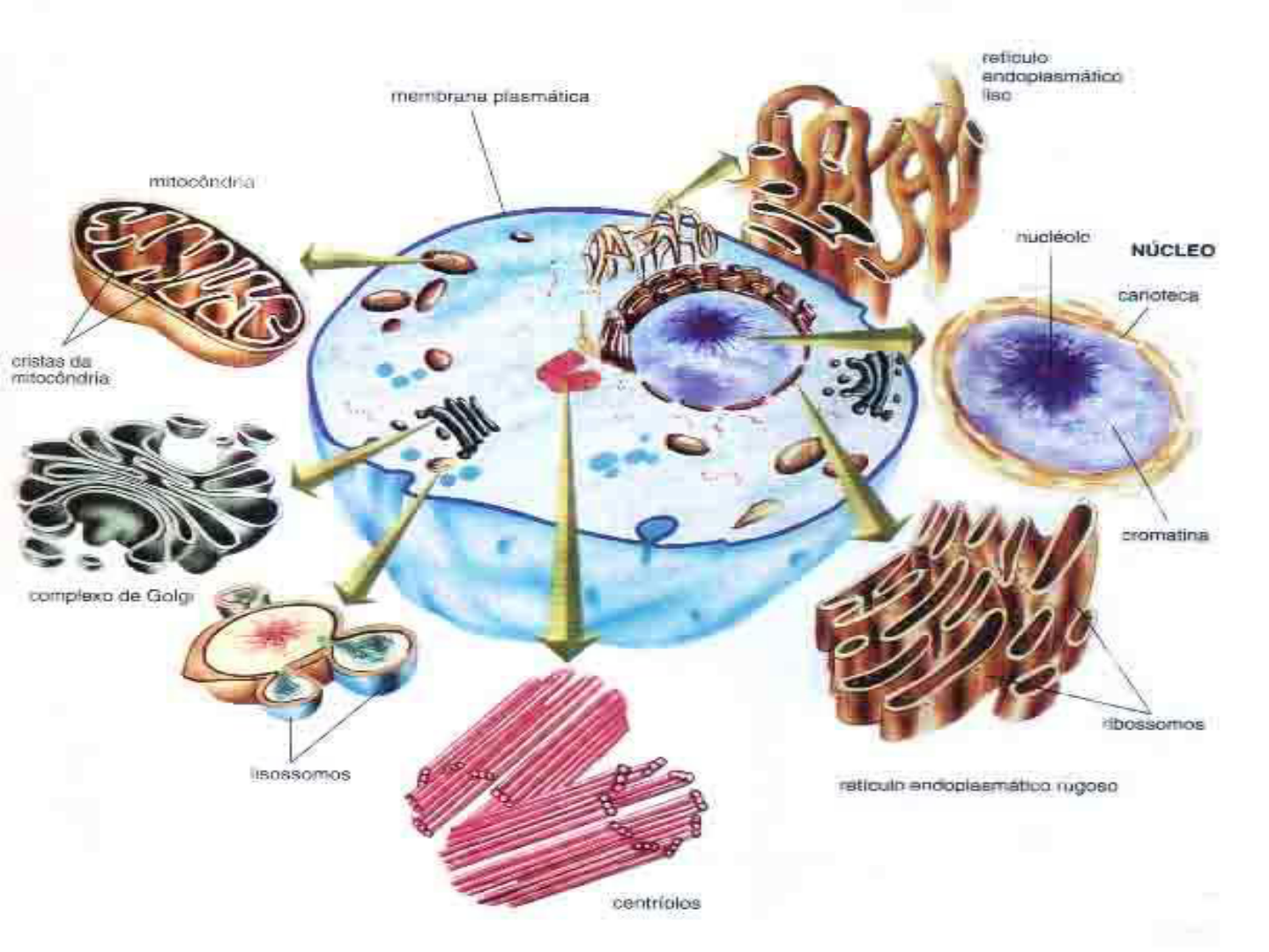 CITOPLASMA É a região entre a membrana plasmática e a carioteca. Formado por um líquido gelatinoso, viscoso e semitransparente, o citosol. CITOPLASMA Ocorre a maioria do metabolismo Produção da maior parte das substâncias necessárias para o funcionamento das células. CITOPLASMA O citoplasma de células procarióticas têm organização mais simples que as células eucarióticas. Basicamente possui: - ribossomos - molécula de DNA Não possui membranas internas. CITOPLASMA Como as células eucarióticas são bem mais complexas que as células procarióticas, o citoplasma possui diversas organelas. RETÍCULO ENDOPLASMÁTICO GRANULOSO RETÍCULO ENDOPLASMÁTICO GRANULOSO Também chamado ergatoplasma ou R.E.R. Rede de tubos e bolsas achatadas interligados. Apresenta grânulos (ribossomos) aderidos à sua superfície. RETÍCULO ENDOPLASMÁTICO GRANULOSO Atua na produção, transporte e modificação de proteínas. Algumas dessas proteínas são enzimas lisossômicas que atuam na digestão intracelular. As proteínas são “exportadas” (secretadas) para atuar fora da célula. RETÍCULO ENDOPLASMÁTICO NÃO-GRANULOSO RETÍCULO ENDOPLASMÁTICO NÃO-GRANULOSO Atua na síntese de ácidos graxos, de fosfolipídios e de esteróides. É muito abundante nas células do fígado (hepatócitos). RETÍCULO ENDOPLASMÁTICO NÃO-GRANULOSO Há enzimas que alteram as moléculas de certas substâncias tóxicas como álcool, pesticidas e outras drogas, inativando-as e facilitando sua eliminação do corpo. RETÍCULO ENDOPLASMÁTICO NÃO-GRANULOSO As células das gônadas apresentam REL bem desenvolvido, pois é nele que os hormônios esteróides são sintetizados. As células musculares possuem o REL especializado no armazenamento de íons Ca+2 que promovem a contração muscular quando são liberados no citosol. COMPLEXO GOLGIENSE É constituído por 6 a 20 bolsas membranosas achatadas (cisternas), empilhadas umas sobre as outras. Nas células vegetais são denominados de dictiossomos ou de golgiossomos. Nas células animais se localizam próximo ao núcleo e aos centríolos. COMPLEXO GOLGIENSE Ocorrem processos modificadores de proteínas com adição de glicídios (glicosilação de proteínas). Ocorre síntese de carboidratos. Nas vesículas do CG ocorre com as proteínas: modificação, separação, empacotamento e exportação para fora da célula. COMPLEXO GOLGIENSE Os citologistas dizem que as cisternas do CG possuem face cis e face trans. Face Cis ou Face Formativa = estão voltadas para o retículo granuloso. Face Trans ou Face de Maturação = é a face em que brotam as vesículas contendo proteínas modificadas e selecionadas de acordo com o seu destino. COMPLEXO GOLGIENSE É responsável pela produção dos lisossomos. Desempenha importante papel na produção de espermatozóides dos animais, originando o acrossomo. Acrossomo = vesícula repleta de enzimas digestivas, ocupa o topo da “cabeça” do espermatozóide têm a função de perfurar as membranas do óvulo. ESPERMATOZÓIDE LISOSSOMOS LISOSSOMOS Bolsas membranosas que contêm um conjunto de mais de 80 tipos de enzimas digestivas, capazes de digerir grande variedade de substâncias ogânicas. Contém nucleases (digerem DNA e RNA) Proteases (digerem proteínas); Fosfatases (removem fosfatos de nucleotídios e de fosfolipídios) LISOSSOMOS FUNÇÃO HETEROFÁGICA Digerem material capturado do exterior por fagocitose ou por pinocitose. FUNÇÃO AUTOFÁGICA Digerindo partes desgastadas da própria célula. Fagocitose - Clasmocitose PEROXISSOMOS Organelas membranosas que contém enzimas que utilizam o O2 para oxidar substâncias orgânicas. Sua principal função é a oxidação de ácidos graxos. São abundantes nas células do fígado e dos rins. VACÚOLO DIGESTIVO É formado pela união de um fagossomo ou de um pinossomo com o lisossomo. VACÚOLO DE SUCO CELULAR A CITOESQUELETO A MICROTÚBULOS São constituídos pela proteína – tubulina. Definem a direção do crescimento da célula. São responsáveis pelos movimentos dos cromossomos durante as divisões celulares. CENTRÍOLOS É um pequeno cilindro oco constituído por nove conjuntos de microtúbulos, mantidos juntos por proteínas adesivas. Possuem capacidade de autoduplicação. Atua na formação dos cílios e flagelos. Não estão presentes em fungos e plantas. CÍLIOS Estrutura filamentosa móvel, curtos e numerosos. Principal função é locomoção celular. Nossa traquéia é formada por células ciliadas que limpam o muco que lubrifica as vias respiratórias, no muco ficam presas bactérias e partículas de poeira. FLAGELOS Estrutura filamentosa móvel, longos e pouco numerosos. Principal função é a locomoção celular. Ajudar na obtenção de alimento por protozoários. MITOCÔNDRIAS Organelas com forma de bastonete. Podem variar de dezenas a centenas em cada célula. É nas mitocôndrias que ocorre a respiração celular – produzindo ATP (trifosfato de adenosina). Possuem genes próprios e têm capacidade de autoduplicação. MITOCÔNDRIAS A CIRANDA, CIRANDINHA Versão biológica: Prof. Marcelo Mitocôndria, mitocôndria É quem faz respiração Ribossomo sintetiza Proteínas de montão O Complexo de Golgi Armazena secreção Lisossomo tem enzimas Prá fazer a digestão O retículo apresenta A função de transportar O centríolo participa Da divisão celular PLASTOS São organela presentes apenas em plantas e em algas. Há três tipos principais de plastos: Cloroplastos Cromoplastos Leucoplastos PLASTOS Cloroplastos: Apresenta cor verde devido presença do pigmento clorofila. Ocorre processo de fotossíntese. Cromoplastos: Não apresentam clorofila, mas sim outros pigmentos. Responsáveis pelas cores de frutos, flores e folhas Leucoplastos: Não possuem pigmento. Estão presentes em raízes, caules tuberosos. Sua função é armazenar amido. PLASTOS