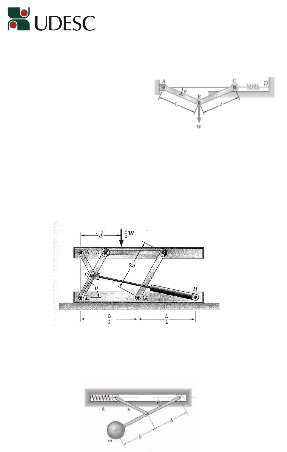 UNIVERSIDADE DO ESTADO DE SANTA CATARINA Centro Foz do Itajaí Engenharia de Petróleo Programa da Disciplina: ESTÁTICA Semestre: 2018/01 LISTA DE EXERCÍCIOS 05 01. Um Peso W de 600 N é aplicado no ponto B. A mola CD tem constante elástica de 2,5 kN/m e está relaxada quando AB e BC estão na horizontal. Despreze os pesos das barras. Sabendo que l = 300 mm, determine o valor do ângulo que corresponde ao equilíbrio. 02. Uma mesa elevatória hidráulica é usada para levantar um caixote de 1000 kg. A mesa consiste em uma plataforma e dois acoplamentos idênticos, sobre os quais os cilindros hidráulicos exercem forças iguais. (Somente um acoplamento e um cilindro são mostrados na FIGURA 4). Os elementos EBC e CG têm, cada qual comprimento 2a, e o elemento AD está preso por pino ao ponto médio de EBD. Se o caixote é colocado na mesa, de modo que a metade de seu peso é apoiada pelo sistema mostrado na figura, determine a força exercida por cada cilindro no momento de levantar o caixote para θ = 60°, a = 0,70 m e L = 3,20 m. 03. Para o dispositivo mostrado, a mola não estaria esticada na posição ϴ = 0. Especifique a rigidez “k” da mola que estabelecerá uma posição de equilíbrio ϴ no plano vertical. A massa das conexões é desprezível comparada com m. UNIVERSIDADE DO ESTADO DE SANTA CATARINA Centro Foz do Itajaí Engenharia de Petróleo Programa da Disciplina: ESTÁTICA Semestre: 2018/01 04. Uma plataforma automática de carga, projetada para a traseira de um caminhão, está mostrada na figura. A posição da plataforma é controlada pelo cilindro hidráulico, que aplica força em C. As conexões são articuladas à estrutura do caminhão em A,B e F. Determine a força P fornecida pelo cilindro pra sustentar a plataforma na posição mostrada. A massa de plataforma e das conexões pode ser desprezada em comparação com a massa do caixote de 250 kg com centro de massa G. 05. O cilindro hidráulico OA e a barra OB estão combinados para controlar a inclinação da carga, que tem massa m e centro de massa em G. O cano inferior C é livre para rolar horizontalmente, quando o sistema articulado do cilindro se alonga. Determinar a força P, exercida pelo cilindro, necessária para manter o equilíbrio em um dado ângulo θ. 06. As duas conexões uniformes, cada uma com massa “m”, estão no plano vertical, estão unidas e têm seu movimento restrito como mostrado. Conforme o ângulo ϴ entre as conexões aumenta com a aplicação da força horizontal P, a barra leve, que está conectada em A e passa por uma bucha articulada em B, comprime a mola com rigidez “k”. Se a mola está sem compressão na posição em que ϴ = 0, determine a força P que produzirá equilíbrio no ângulo ϴ. UNIVERSIDADE DO ESTADO DE SANTA CATARINA Centro Foz do Itajaí Engenharia de Petróleo Programa da Disciplina: ESTÁTICA Semestre: 2018/01 07. A mola de constante elástica igual a 1000 lb/ft está relaxada para θ = 45°. Determine o ângulo θ para equilíbrio se cada um dos cilindros pesa 50 lb. Despreze o peso das barras. (Não é necessária a conversão de valores. Resolva com as próprias unidades indicadas na figura). 08. Se uma força P = 100 N for aplicada ao braço de alavanca da prensa articulada, determine a força de aperto desenvolvida no bloco quando ϴ = 45º. Despreze o peso do bloco. 09. Uma mesa de servir uniforme com 5 kg é apoiada em cada lado por pares ligações idênticas, AB e CD, e molas CE. Se a tigela tem uma massa de 1 kg, determine o ângulo ϴ onde a mesa está em equilíbrio. As molas têm uma rigidez k = 200 N/m cada uma e estão livres quando ϴ = 90º. Despreze a massa das ligações. 10. Determine os ângulos ϴ para haver equilíbrio do cilindro de 50 kg e investigue a estabilidade em cada posição. A mola está livre quando ϴ = 60º. UNIVERSIDADE DO ESTADO DE SANTA CATARINA Centro Foz do Itajaí Engenharia de Petróleo Programa da Disciplina: ESTÁTICA Semestre: 2018/01 11. A ligação uniforme AB tem massa de 3 kg e está conectada nas duas extremidades por meio de pinos. A barra BD, com peso desprezível, passa por um bloco giratório em C. Se a mola tem uma rigidez k = 100 N/m e está livre quando ϴ = 0º, determine o ângulo ϴ para o equilíbrio e investigue a estabilidade na posição de equilíbrio. Despreze o tamanho do bloco giratório. 12. Determine a força Q necessária para manter o mecanismo em equilíbrio. 13. A mola conectada ao mecanismo tem um comprimento livre quando ϴ = 90º. Determine a posição ϴ para o equilíbrio e investigue a estabilidade do mecanismo nessa posição. O disco A é conectado por pino à estrutura em B e tem um peso de 100 N. 14. Um aparelho usado para exercícios consiste de 04 barras conectadas, cada qual com comprimento L e uma mola de constante elástica k, cujo comprimento não alongado é a (a < L). Se forças horizontais F são aplicadas de forma a diminuir o ângulo θ, determine: (a) a força P que mantém o equilíbrio; (b) o ângulo que torna o P máxima.