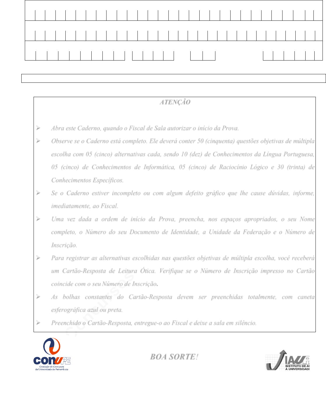 pcimarkpci MDAwMDowMDAwOjAwMDA6MDAwMDowMDAwOmZmZmY6YmZiYjo5ZjVj:RnJpLCAwOCBKdW4gMjAxOCAxNDo0NDo1MiAtMDMwMA== SECRETARIA DE ADMINISTRAÇÃO DO ESTADO DE PERNAMBUCO COMPANHIA PERNAMBUCANA DE SANEAMENTO - COMPESA CONCURSO PÚBLICO DADOS DE IDENTIFICAÇÃO DO CANDIDATO Não deixe de preencher as informações a seguir: Prédio Sala Nome Nº de Identidade Órgão Expedidor UF Nº de Inscrição ASSISTENTE DE SANEAMENTO E GESTÃO / TÉCNICO OPERACIONAL ELETRÔNICA ATENÇÃO Abra este Caderno, quando o Fiscal de Sala autorizar o início da Prova. Observe se o Caderno está completo. Ele deverá conter 50 (cinquenta) questões objetivas de múltipla escolha com 05 (cinco) alternativas cada, sendo 10 (dez) de Conhecimentos da Língua Portuguesa, 05 (cinco) de Conhecimentos de Informática, 05 (cinco) de Raciocínio Lógico e 30 (trinta) de Conhecimentos Específicos. Se o Caderno estiver incompleto ou com algum defeito gráfico que lhe cause dúvidas, informe, imediatamente, ao Fiscal. Uma vez dada a ordem de início da Prova, preencha, nos espaços apropriados, o seu Nome completo, o Número do seu Documento de Identidade, a Unidade da Federação e o Número de Inscrição. Para registrar as alternativas escolhidas nas questões objetivas de múltipla escolha, você receberá um Cartão-Resposta de Leitura Ótica. Verifique se o Número de Inscrição impresso no Cartão coincide com o seu Número de Inscrição. As bolhas constantes do Cartão-Resposta devem ser preenchidas totalmente, com caneta esferográfica azul ou preta. Preenchido o Cartão-Resposta, entregue-o ao Fiscal e deixe a sala em silêncio. BOA SORTE! www.pciconcursos.com.br pcimarkpci MDAwMDowMDAwOjAwMDA6MDAwMDowMDAwOmZmZmY6YmZiYjo5ZjVj:RnJpLCAwOCBKdW4gMjAxOCAxNDo0NDo1MiAtMDMwMA== 2 CONHECIMENTOS DA LÍNGUA PORTUGUESA Texto 1 para as questões de 01 a 03. A água é vida Marco Aurélio A água é vida e não pode faltar A hora é essa, vamos economizar Feche a torneira quando os dentes escovar Preste atenção, minha gente, quando o carro for lavar Lavar calçada é muito errado, você sabe Limpando com a vassoura, a coisa pode melhorar Tomando banho demorado, gotejando as torneiras Esbanjando água limpa, não vai dar Lavando a louça de uma vez, enxaguando de uma vez Usando certo, a água não vai acabar Disponível em: http://www.radio.uol.com.br/#/letras-e-musicas/projeto-educando-cantando/a-agua-e-vida/1891701 Adaptado. 01. Em relação ao texto, o que se pode afirmar? I. Faz uma homenagem à água por estar próximo o dia da sua comemoração. II. Existem nele várias instruções sobre o modo correto de se utilizar a água. III. Aponta alternativas para se evitar a escassez da água. IV. Ironiza os usuários da água, mostrando como evitar a falta desse bem tão essencial a todos os seres vivos. Estão CORRETOS os itens A) I e II. B) II e III. C) II e IV. D) I e III. E) III e IV. 02. Com este texto, o autor A) relata fatos que ocorreram com a água em um determinado tempo e lugar. B) narra a história fictícia de um recurso natural, a água, que merece atenção especial. C) expõe conhecimentos formais e científicos sobre o bem precioso, a água. D) instrui, mostrando os passos que devem ser tomados para que a água não venha a faltar. E) expressa sua opinião, por meio de argumentos, sobre a história da água. 03. Sobre fonemas, analise as proposições abaixo: I. No termo “enxaguando”, a letra x tem o mesmo som – chê – das letras ch do termo “Feche”. II. No termo “Usando”, a letra s apresenta o mesmo som da letra Z do termo “economizar. III. No termo “gotejando”, a letra g apresenta o mesmo som do termo “gente”. Está CORRETO o que se afirma em A) I, II e III. B) I e II. C) II e III. D) III. E) I e III. Texto 2 para as questões 04 e 05. Disponível em: http://ler-com-prazer.blogspot.com.br/2012/03/dia-mundial-da-agua-dia-22-de-marco.html www.pciconcursos.com.br pcimarkpci MDAwMDowMDAwOjAwMDA6MDAwMDowMDAwOmZmZmY6YmZiYjo5ZjVj:RnJpLCAwOCBKdW4gMjAxOCAxNDo0NDo1MiAtMDMwMA== 3 04. Fazendo uma leitura da imagem, qual afirmativa abaixo NÃO condiz com ela? A) Há nela cenas opostas, ou seja, falta e presença de água. B) Nela existe uma informação sobre a data de se fazerem honras à água. C) A água tem, em cada canto do mundo, uma data diferente para ser homenageada. D) Cabe a todos nós a manutenção da água, evitando, assim, a sua escassez. E) Conservar a água, recurso natural precioso, em nosso planeta é tarefa de todos os seus usuários. 05. Nesse texto, observamos que o autor se inclui na fala quando utiliza o termo nós. Por essa razão, o verbo se encontra no plural, concordando com o seu sujeito, nós. Em qual alternativa abaixo, a Concordância Verbal está INCORRETA? A) O grupo de usuários de água da cidade do Recife não sabem como utilizá-la. B) Em um futuro próximo, sou eu que chorarei pela falta d’água. C) Tu e ele ficareis prejudicados se não houver economia d’água. D) Há meses, não chove em várias regiões do nosso Estado. E) Precisam-se de medidas urgentes para saciar a sede dos nossos irmãos do Sertão. Texto 3 para as questões de 06 a 10. As Pontes da União Dois irmãos que moravam em fazendas vizinhas, separadas apenas por um riacho, entraram em conflito. Foi a primeira grande desavença em toda uma vida de trabalho lado a lado. Mas agora tudo havia mudado. O que começou com um pequeno mal entendido finalmente explodiu numa troca de palavras ríspidas, seguidas por semanas de total silêncio. Numa manhã, o irmão mais velho ouviu baterem à sua porta. - Estou procurando trabalho, disse um homem. Talvez você tenha algum serviço para mim. - Sim, disse o fazendeiro. Claro! Vê aquela fazenda ali, além do riacho? É do meu vizinho. Na realidade, do meu irmão mais novo. Nós brigamos e não posso mais suportá-lo. Vê aquela pilha de madeira ali no celeiro? Pois use para construir uma cerca bem alta. - Acho que entendo a situação, disse o carpint
