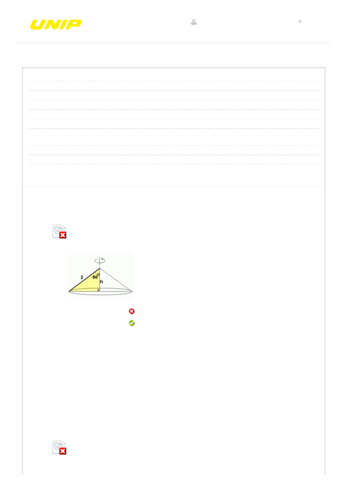 27/06/2018 Revisar envio do teste: ATIVIDADE TELEAULA II – 6150-60_... https://ava.ead.unip.br/webapps/assessment/review/review.jsp?attempt_id=_6079058_1&course_id=_15169_1&content_id=_231612_1&return_c… 1/3 Revisar envio do teste: ATIVIDADE TELEAULA IIGeometria Espacial 6150-60_15402_R_20181 CONTEÚDO Usuário samanta.silva @unipinterativa.edu.br Curso Geometria Espacial Teste ATIVIDADE TELEAULA II Iniciado 27/06/18 22:47 Enviado 27/06/18 22:47 Status Completada Resultado da tentativa 0 em 0 pontos Tempo decorrido 0 minuto Autoteste O aluno responde e o resultado do aluno não é visível ao professor. Resultados exibidos Todas as respostas, Respostas enviadas, Respostas corretas, Comentários, Perguntas respondidas incorretamente Pergunta 1 Resposta Selecionada: d. Respostas: a. b. c. d. e. A hipotenusa de um triângulo retângulo mede 2 cm e um dos ângulos mede 60 graus. Girando-se o triângulo em torno do cateto menor, obtém-se um cone. Qual é o seu volume? 10 π cm³ π cm³ 3 π cm³ 4 π cm³ 10 π cm³ 12 π cm³ Pergunta 2 Resposta Selecionada: Considere um prisma cuja base é um hexágono regular de 10 cm de lado e altura de 3 cm. No centro da peça, existe um furo cilíndrico de 2 cm de raio. Qual é a quantidade de ferro, em volume, utilizada na confecção da peça? CONTEÚDOS ACADÊMICOS BIBLIOTECAS MURAL DO ALUNO TUTORIAISUNIP EAD 0 em 0 pontos 0 em 0 pontos samanta.silva @unipinterativa.edu.br 5 27/06/2018 Revisar envio do teste: ATIVIDADE TELEAULA II – 6150-60_... https://ava.ead.unip.br/webapps/assessment/review/review.jsp?attempt_id=_6079058_1&course_id=_15169_1&content_id=_231612_1&return_c… 2/3 e. Respostas: a. b. c. d. e. cm3 cm3 cm3 cm3 cm3 cm3 Pergunta 3 Resposta Selecionada: d. Respostas: a. b. c. d. e. O poliedro da �gura (uma invenção de Leonardo da Vinci utilizada modernamente na fabricação de bolas de futebol) tem como faces: 20 hexágonos e 12 pentágonos, todos regulares. O número de vértices do poliedro é: 72 64 90 60 72 56 Pergunta 4 Oscar Niemayer era um arquiteto brasileiro, considerado um dos nomes mais in�uentes na arquitetura moderna internacional. Ele contribuiu, através de uma doação de um croqui, para a construção do planetário da UFSM, um marco arquitetônico importante da cidade de Santa Maria. Suponha que a cobertura da construção seja uma semiesfera de 28 m de diâmetro, vazada por 12 partes iguais, que são aproximadas por semicírculos de raio 3 m. Sabendo que uma lata de tinta é su�ciente para pintar 39 m2 de área, qual a quantidade mínima de latas de tinta necessária para pintar toda a cobertura do planetário? (Use π = 3) 0 em 0 pontos 0 em 0 pontos 27/06/2018 Revisar envio do teste: ATIVIDADE TELEAULA II – 6150-60_... https://ava.ead.unip.br/webapps/assessment/review/review.jsp?attempt_id=_6079058_1&course_id=_15169_1&content_id=_231612_1&return_c… 3/3 Quarta-feira, 27 de Junho de 2018 22h47min41s BRT Resposta Selecionada: a. Respostas: a. b. c. d. e. 20 20 26 40 52 60 ← OK