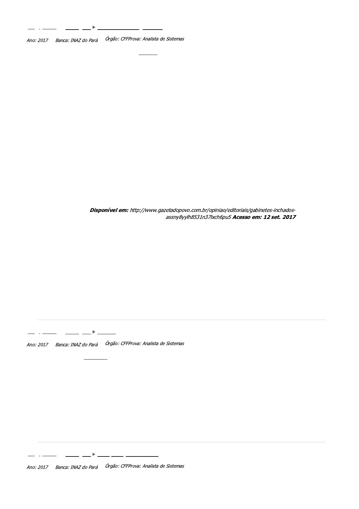 16/05/2018 https://www.qconcursos.com/questoes/imprimir?ano_publicacao=2009 2010 2011 2012 2013 2014 2015 2016 2017 2018&esfera=… https://www.qconcursos.com/questoes/imprimir?ano_publicacao=2009%20%202010%20%202011%20%202012%20%202013%20%202014%20%202015%20% Ano: 2017 Banca: INAZ do Pará Órgão: CFFProva: Analista de Sistemas a) O texto não obedece aos padrões da norma culta, uma vez que é constituído por erros gramaticais. b) O texto utiliza de linguagem informal e, por isso, enquadra-se aos padrões estabelecidos pela norma culta. c) O texto não pode se enquadrar nos padrões da norma culta, visto que também se utiliza de linguagem coloquial. d) O texto não utiliza marcas de concordância e, por isso, não pode ser encarado como um texto que preza pela norma culta. e) O texto se enquadra aos padrões da norma culta, pois obedece ao conjunto de normas da escrita formal. Ano: 2017 Banca: INAZ do Pará Órgão: CFFProva: Analista de Sistemas a) A ganância e a ambição corrompe o estado democrático brasileiro. b) Faz três anos que a Escócia decidiu pela não independência do país em relação ao Reino Unido. c) Prefeito, governador e presidente prestaram suas condolências aos familiares das vítimas. d) Emirados Árabes Unidos estão planejando construir uma minicidade em Marte. e) Fará o acordo o banqueiro e os empresários envolvidos no esquema de corrupção. Ano: 2017 Banca: INAZ do Pará Órgão: CFFProva: Analista de Sistemas 01 Q855450 Português Problemas da língua culta Analise o texto abaixo e marque a alternativa correta quanto ao uso da norma culta. Gabinetes inchados O inchaço estrutural dos Legislativos oferece inúmeras oportunidades para desperdício, acertos nada republicanos e até mesmo corrupção. A Câmara Municipal de Curitiba se vê às voltas com denúncias contra vereadores que estariam embolsando parte dos salários de seus assessores: são pelo menos quatro parlamentares às voltas com investigações internas da Câmara ou inquéritos do Ministério Público. Independentemente da veracidade das denúncias específicas, a ocasião serve como um alerta para um aspecto que muitas vezes passa despercebido quando o tema é o funcionamento dos Legislativos. Muita energia tem sido gasta para criticar – não sem razão – os salários dos vereadores, deputados e senadores; em 2015, a mobilização popular chegou a impedir aumentos absurdos, de até 100%, em cidades do interior do Paraná. Mas a estrutura montada em torno de cada parlamentar se mostra ainda mais custosa: auxílios dos mais diversos tipos, verbas postais, para combustível, para fotocópias, veículos de uso exclusivo (em Curitiba são 47, para 38 vereadores), sem falar nos cargos de assessores. Cada vereador curitibano pode contratar até sete pessoas, cujos salários, somados, não podem ultrapassar R$ 51,5 mil mensais – membros da Mesa Diretora têm direito a ainda mais assessores. Esse inchaço estrutural oferece inúmeras oportunidades para desperdício, acertos nada republicanos e até mesmo corrupção. É preciso analisar até que ponto há justificativa para tantos gastos, especialmente com pessoal. Ainda que o setor público, em todo o país, não estivesse vivendo uma crise que clama pelo corte de despesas, o uso racional do dinheiro do contribuinte é uma obrigação básica. Disponível em: http://www.gazetadopovo.com.br/opiniao/editoriais/gabinetes-inchados- assny8yylh8531n37lxch6pu5 Acesso em: 12 set. 2017 02 Q855451 Português Sintaxe Assinale a alternativa incorreta quanto ao emprego da concordância verbal. 03 Q855452 Português Interpretação de Textos O labrador e as raposas BETA 16/05/2018 https://www.qconcursos.com/questoes/imprimir?ano_publicacao=2009 2010 2011 2012 2013 2014 2015 2016 2017 2018&esfera=… https://www.qconcursos.com/questoes/imprimir?ano_publicacao=2009%20%202010%20%202011%20%202012%20%202013%20%202014%20%202015%20% a) Ter destaque na sociedade e ser reconhecido através dos meios de comunicação. b) Não menosprezar a importância de se ter uma boa vida financeira. c) Os valores éticos e morais implícitos no comportamento de cada ser humano. d) Enfrentar inesperadas aventuras como situações corriqueiras. e) As possibilidades de se obter benefícios com o status de ídolo nacional. Ano: 2017 Banca: INAZ do Pará Órgão: CFFProva: Analista de Sistemas No fim das contas, a gente mete os pés pelas mãos por não conseguir dimensionar o que é valioso de verdade Nada mais redundante do que dizer que se é fã de Gustavo Kuerten. Quem não é? Um garoto catarinense, até então desconhecido, foi a Paris e venceu três vezes um dos maiores torneios internacionais de tênis, o Roland Garros, isso aos 20 e poucos anos. Em vez de retornar com o peito inflado por ser o novo herói nacional, tratou tudo como se fosse uma inesperada aventura – sem jamais esquecer de agradecer a seu treinador e sua família. A partir daí, intensificou sua responsabilidade social, promovendo o esporte entre crianças e adolescentes. Deveria ser regra, mas até hoje esse comportamento é tratado como exceção. Guga é um campeão nato: já começou dando certo por sua maneira de encarar a vida. Claro que teve que ralar muito até chegar aonde chegou, nada foi de mão beijada, nunca é. Mas não se tornou um obcecado. Ele tem dito, em entrevistas, que não tinha noção da grandiosidade de Roland Garros quando derrotou os maiores do mundo. Sorte dele. A ausência de deslumbramento e a manutenção do foco costumam ser o segredo de gente vencedora. Impossível não recordar de um vídeo que tem circulado nas redes sociais, a de um técnico de basquete da Lituânia que dispensou uma das estrelas do seu time para que fosse assistir ao parto da esposa, mesmo estando em meio às eliminatórias de um campeonato. Quando um jornalista, durante uma coletiva, questionou a atitude do técnico, recebeu uma situada: títulos não são tão importantes, não diante de algo