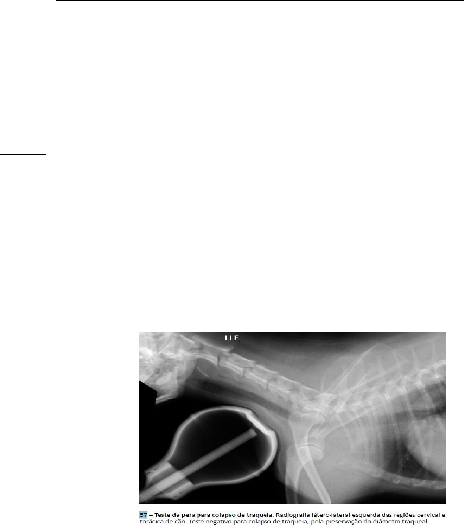 RADIOGRAFIA E ULTRASSONOGRAFIA TORÁCICA Indicações para exames de imagem do tórax: tosse, engasgo, dispneia, sopro cardíaco, ruídos pulmonares, intolerância ao exercício, síncope, traumatismos, pesquisa de metástases (comum metástases pulmonares em casos de neoplasia mamária) OBS: raio-x é um exame com limitações em grandes animais Estruturas avaliadas nos exames de imagem do tórax: traqueia, esôfago, parede torácica (costela, esterno, coluna vertebral), diafragma, mediastino, espaço pleural, coração e vasos pulmonares, pulmão. Importante que os membros do animal estejam esticados podendo ser usado uma espuma entre o animal e a folha de raio-x para ajustar a postura RAIO-X DE TÓRAX: Quilovoltagem alta: estruturas tem grande espessura Deve ser maior na projeção ventro-dorsal do que na latero-lateral Baixo tempo de exposição: o ideal é que se dispare rápido (tempo de uma respiração) Disparar na inspiração para aumentar o contraste entre as estruturas Traqueia A projeção de preferência é a lateral, pois a projeção ventro-dorsal tem sobreposição com a coluna e dificulta a visualização. Realizar projeções na inspiração e na expiração para melhor avaliação Colapso de traqueia na região cervical: visualizado na inspiração Colapso de traqueia na região torácica: visualizado na expiração Projeção com compressão traqueal evidencia o colapso Animal normal: ocorre desvio da traqueia sem colabamento Animal com colapso: ocorre desvio e estreitamento do lúmen Achados no raio-x para colapso: observa-se desvio e estreitamento; pode encontrar corpo estranho Esôfago Se localiza dorsal à traqueia Melhor avaliado em projeção lateral O raio-x deve ser preferencialmente contrastado Permite avaliação de distensão e corpo estranho Persistência do arco aórtico direito: Megaesôfago Parede torácica Avaliar anomalias de formação, lesões traumáticas, enfisema subcutâneo. Diafragma Avaliar integridade: pressionar os órgãos abdominais sobre a cavidade torácica e observar se ocorre deslocamento dorsal da traqueia Pode ser utilizado ultrassom para auxiliar a diferenciar as estruturas e as alterações de opacidade Mediastino Avaliar presença de massas Ultrassom pode ser utilizado para confirmação (massa e líquido tem o mesmo aspecto radiográfico) ou punção guiada. Espaço Pleural Entre o pulmão e a parede torácica Avaliação de presença de massas, líquido ou gás Efusão pleural Pneumotórax Coração e Vasos Pulmonares Raio-x auxilia na avaliação do contorno, forma e tamanho Posição dorso-ventral é ruim pois o estômago se desloca em direção ao diafragma. Doppler permite melhor avaliação das câmaras ÍNDICE CARDÍACO VERTEBRAL: Traça uma linha da região da carina ao ápice do coração e outra linha perpendicular Transfere as duas linhas para a coluna a partir de T4 Conta o número de vértebras de cada linha Valor normal: de 8,5 a 10,5 (acima de 10,5 se suspeita de cardiomegalia) Pulmão Raio-x pode ser realizado em posição ventro-dorsal ou lateral Avaliação é melhor sempre do lado mais distante do filme. Ex: decúbito direito avalia melhor o pulmão esquerdo pois esse se expande mais Ultrassom: avaliação pulmonar limitada; bom para diagnostico de edema pulmonar precoce Tomografia: maior sensibilidade e menor sobreposição de estruturas Padrões pulmonares: Padrão Alveolar: Causa principal é o edema pulmonar Aumento de radiopacidade com broncograma aéreo: marcações de brônquios por conta de acúmulo de líquido alveolar Padrão Intersticial: O padrão intersticial nodular é o mais comum – presente em neoplasias Pneumonia bacteriana/fúngica: radiopacidade miliar difusa; padrão intersticial não-estruturado; marcações lineares não vasculares Padrão bronquial: Comum na bronquite crônica Sinal em donuts