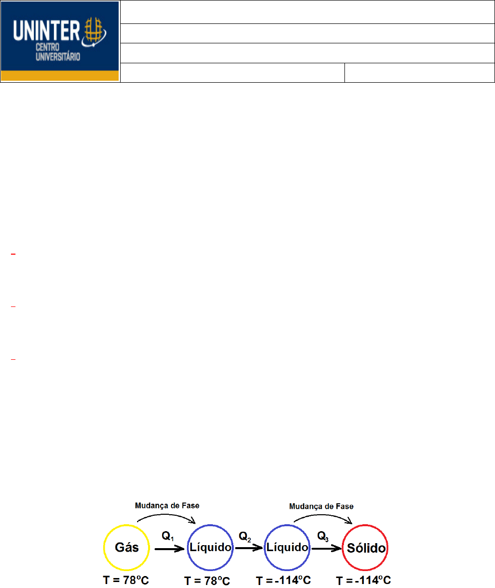 Exercícios Aula 4 – Termodinâmica Professor: Cristiano Cruz Disciplina: Física Termodinâmica e Ondas Curso: Engenharias Modalidade: EAD 1 – Os materiais A,B e C são sólidos que estão em suas temperaturas de fusão. O material A requer 200 J para derreter 4 Kg, o material B requer 300 J para derreter 5 Kg e o material C requer 300 J para derreter 6 Kg. Classifique os materiais de acordo com seus calores de fusão (Lf), do maior para o menor. Sendo o calor latente dado pela equação: Q = m . Lf Calculando para cada material e já colocando na ordem do maior calor latente de fusão (Lf) para o menor, teremos. 1o) Material B: 300 = 5 . Lf Lf = 60 J/kg 2o) Material A: 200 = 4 . Lf Lf = 50 J/kg 2o) Material C: 300 = 6 . Lf Lf = 50 J/kg 2 - O álcool etílico possui temperatura de ebulição igual a 78 oC, e a temperatura de congelamento igual a -114 oC. O calor de vaporização LV = 879 KJ/Kg, e o calor de fusão de Lf = 109 KJ/Kg. Sendo o calor especifico c = 2,43 KJ/Kg.K, quanta energia deve ser removida de 0,510 Kg de álcool etílico, que é inicialmente um gás a 78 oC, de modo que ele se torne sólido a – 114 oC? Primeira mente devemos lembrar de realizar a mudança da escala de temperatura de graus Celsius (oC) para Kelvin (escala absoluta). Para temperatura inicial do gás TC = 78 oC TK = TC + 273 TK = 78 + 273 = 351 K Para temperatura final do sólido TC = - 114 oC TK = TC + 273 TK = - 114 + 273 = 159 K Neste exercício temos inicialmente a substancia álcool etílico presente no estado gasoso a determinada temperatura T = 78 oC = 351 K, devemos retirar calor desta substancia para que a temperatura dela seja reduzida a ponto de realizar duas mudanças de fase, primeiro para o estado líquido (liquefação) e depois para o estado sólido (solidificação). A quantidade de energia (calor) que deve ser retirada está representada na figura acima, inicialmente devemos retirar uma quantidadde de calor Q1 para que ocorra a mudança de fase do estado gasoso para o estado líquido, quando ocorre a mudança de fase a temperatura da substânica não é alterada, permanecendo o líquido na temperatura de 78 oC. Finalisada esta mudança devemos continuar a retirar calor para que ocorre mudança na temperatura, resfriando o líquido de 78 oC até sua temperatura atingir – 114 oC = 159 K, essa quantidade de calor é representada por Q2. Ao atingir – 114 oC irá ocorrer outra mudança de fase, fazendo a substância passar do estado líquido para o estado sólido, lembre-se durante a mudança de fase não ocorre variação de temperatura, esta quantidade de calor é representada por Q3. A energia total (calor) que deve ser removida (Qt) é igual a somatória das quantidades de calor Q1; Q2; Q3 necessárias para realizar a mudança de fase, sendo: Q1 = m . Lv Q1 = 0,510 . - 879 x 103 Q1 = - 448 x 103 J Q2 = m . c. ΔT Q2 = 0,510 . 2,43 x 103 . (159 – 351) Q2 = - 238 x 103 J Q3 = m . Lf Q3 = 0,519 .- 109 x103 Q3 = - 55,6 x 103 J A energia total é dada pelo somatório. Qt = Q1 + Q2 + Q3 = - 448 x 103 - 238 x 103 - 55,6 x 103 = - 742 x 103 J = - 742 KJ O sinal negativo na quantidade de calor significa apenas que o corpo perdeu energia térmica. 3 – A passagem da fase sólida para líquida de 200 g de uma substância em função do calor Q absorvido, é representada no gráfico abaixo. Qual os calores específicos dessa substância, nas fases sólida e líquida? Para identificar no gráfico onde encontra-se a representação da fase líquida, o momento da mudança de fase, e a fase sólida. Partimos do princípio que a mudança de fase sempre ocorre a temperatura constante, veja no gráfico que isso ocorre quando a temperatura atinge 10 oC, portanto a substância mudou de fase neste momento. A fase líquida está antes deste momento, no aquecimento na fase líquida a temperatura varia de – 10 oC a 10 oC e o calor fornecido nesta variação é de 3,2 kcal. Então, pela equação: 𝑄 = 𝑚 . 𝑐 . ∆𝑇 3,2 × 103 = 200 . 𝑐 . (10 − (−10)) O calor específico c na fase líquida será: 𝑐 = 3,2 × 103 200. 20 = 0,8 𝑐𝑎𝑙 𝑔℃ A fase sólida encontra-se depois do momento da mudança de fase. Na fase sólida a variação de temperatura é de 10 ºC a 50 ºC e o calor fornecido é 1,6 kcal: 𝑄 = 𝑚 . 𝑐 . ∆𝑇 1,6 × 103 = 200 . 𝑐 . (50 − 10) O calor específico c na fase sólida será: 𝑐 = 1,6 × 103 200. 40 = 0,2 𝑐𝑎𝑙 𝑔℃ 4 - A temperatura de 96,8ºF corresponde a que temperatura em ºC? Pela equação de conversão entre as escalas Fahrenheit e Celsius, 𝑇𝐶 5 = 𝑇𝐹 − 32 9 Substituindo a temperatura Fahrenheit TF = 96,8 oF e isolando e calculando a temperatura Celsius TC, temos: 𝑇𝐶 5 = 96,8 − 32 9 = 36 ℃ 5 - Suponha que, numa escala de temperatura oJ, a água ferva a 50ºJ e congele a 10ºJ. Qual o valor de 34ºC, na escala oJ? Obtendo a equação de conversão entre as escalas pela média pondrada. 𝑇𝐽 − 10 50 − 10 = 𝑇𝐶 − 0 100 − 0 Simplificando: 𝑇𝐽 − 10 40 = 𝑇𝐶 100 Sendo Tc = 34 ºC 𝑇𝐽 − 10 40 = 34 100 𝑇𝐽 = 34 . 40 100 + 10 𝑇𝐽 = 23,6 𝐽 𝑜 6 - Uma xícara de alumínio com capacidade de 100 cm3 é completamente cheia com glicerina a 22 oC. Quanto de glicerina, caso isto aconteça, transbordará para fora da xicara se a temperatura tanto da xícara quanto da glicerina for aumentada para 28oC? (O coeficiente de expansão volumétrica da glicerina é 5,1 x 10-4 oC-1) Para determinar se ocorre o transbordamento devemos comparar a expansão volumétrica da xícara de alumínio e da glicerina para mesma variação de temperatura. Sendo o coeficiente de dilatação linear do alumínio Al = 2,3 x 10-5 oC-1, temos o volume expandido da xícara é dado por; VAl = 100 . 3 . 2,3 x 10-5 . (28 – 22) + 100 = 100,04 cm3 O volume expandido da glicerina, será: VGl = 100 . 5,1 x 10-4. (28 – 22) + 100 = 100,30 cm3 O volume que irá transbordar será dado por; Vtransbor