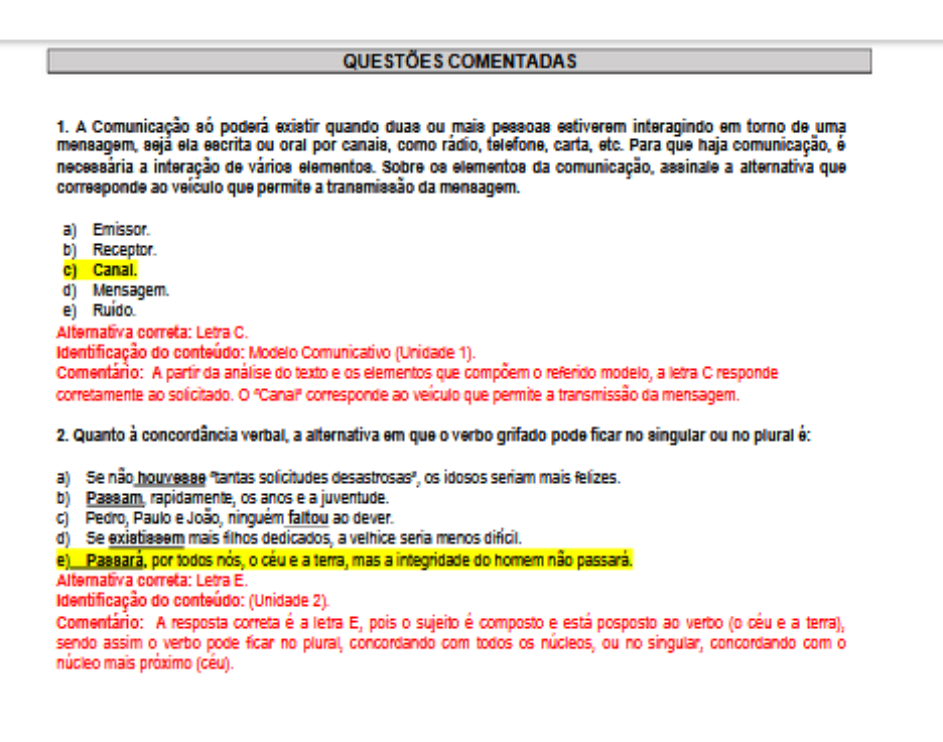 3. Leia o texto abaixo: Asa branca, composição de Luiz Gonzaga e Humberto Teixeira, é uma das canções mais conhecidas da história da música brasileira. Transcrevemos dela a quarta estrofe, procurando “imitar” a pronúncia das palavras na gravação do próprio Luiz Gonzaga: Hoje longe muitas légua, Numa triste solidão, Espero a chuva caí de novo, Pra mim vortá pro meu sertão. Em algumas gravações mais recentes, porém, os intérpretes de Asa branca preferiram alterar a variante linguística empregada por Luiz Gonzaga, cantando: Hoje longe muitas léguas, Numa triste solidão, Espero a chuva cair de novo, Para eu voltar para o meu sertão. Comparando os dois textos e considerando que o narrador de Asa branca é um típico retirante nordestino, podemos inferir que: a) A gravação de Luiz Gonzaga se vale de registros linguísticos incompatíveis com a situação de comunicação apre - sentada na canção. b) A versão mais formal da letra da canção é mais persuasiva, já que respeita o padrão culto da língua e por isso atinge mais falantes. c) Ambas as versões de Asa branca produzem os mesmos efeitos, já que essas sutilezas gramaticais não interferem na produção do sentido. d) A gravação de Luiz Gonzaga emprega uma variante linguística mais coerente com o tema da canção. e) A segunda versão da letra se vale de uma variante linguística típica de alguém que está diante do problema da seca no nordeste. Alternativa correta: Letra D. Identificação do conteúdo: A questão apresentava o contexto das variedades linguísticas, assim como a língua padrão e, sobretudo as transformações da língua (Unidades 3 e 4). Comentário: A letra D responde corretamente, já que a gravação original de “Asa Branca”, ao empregar uma variante linguística tipicamente popular produz um efeito de aproximação com o universo social dos retirantes nordestinos. Assim, a versão “original” da letra é mais coerente com o tema da canção. Comentário: De acordo com o texto temos: V – “Nenhuma outra (...) se iguala a nossa em termos de sobrevivência e proliferação”; F – Não há menção para essa observação. Há que se inferir, deduzir, de acordo com a leitura; V – Viver fora do ecossistema só poderia nos dar a capacidade de sobrevivência; F – O processo de seleção não limita, mas sim nos dá condição de mobilidade e sociabilidade; V – No texto: “E tudo s e deve à agricultura” e F – O processo de seleção é o principal resultado da não-extinção da espécie. Alternativa correta: Letra B. Identificação do conteúdo: A questão apresentava o contexto das situações reais de comunicação e li nguagem e, sobretudo as transformações da língua/linguagem, assim como a construção de sentido fazendo as devidas interseções com os pressupostos das Linguagens Verbais e Não Verbais (Unidades 1, 2 e 3). Comentário: Estão corretas as proposições II e III, já que a Linguagem Verbal, ne ste caso, é necessária para o entendimento do texto (proposição I) e o cartum não é uma crítica ao poema, ele estabelece intertextualidade com o poema (proposição IV). Alternativa correta: Letra C. Identificação do conteúdo: A partir da leitura e análise crítica da tirinha e das proposições, fazendo as devidas interseções com os pressupostos da Interpretação de Texto, assim como Coesão e Coerência (Unidades 3 e 4). ANALISAR E INTERPRETAR TEXTOS, TEMAS E SITUAÇÕES DO COTIDIANO DE FORMA CRÍTICA, ESTABELECENDO SUA RELAÇÃO COM A REALIDADE E OS PROCESSOS DE COMUNICAÇÃO). Comentário: A alternativa certa é a letra C, já que explicita a perspectiva da relação da tirinha e sua const rução de sentido.