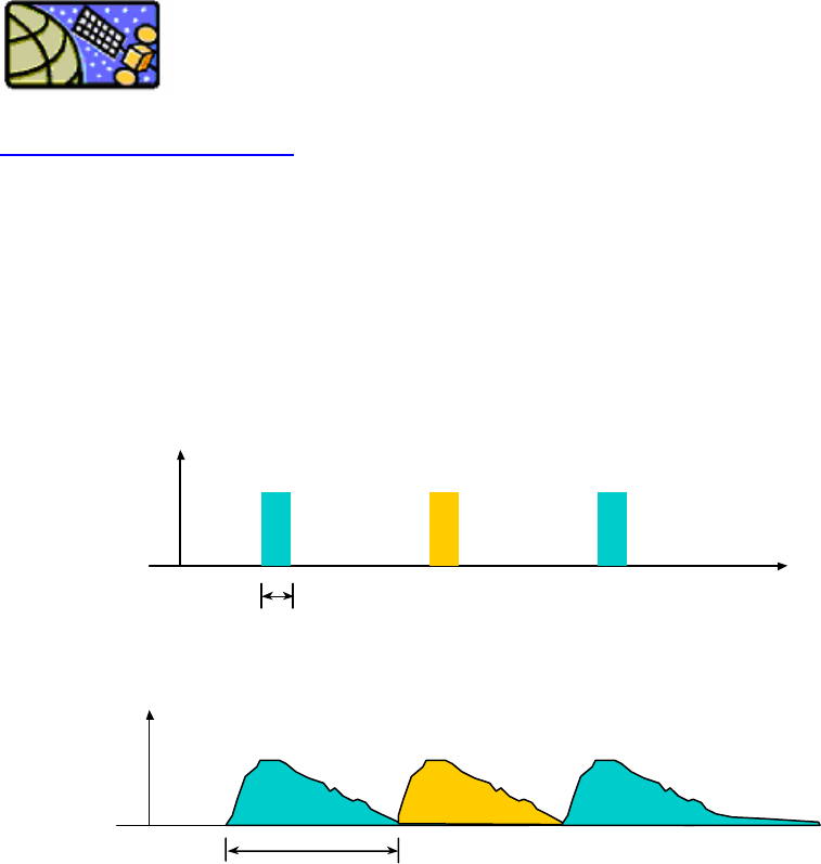 Inter Symbol Interference(ISI) and Root-raised Cosine (RRC) filtering 1 Intuitive Guide to Principles of Communications www.complextoreal.com Inter Symbol Interference (ISI) and raised cosine filtering Inter-symbol interference (ISI) is an unavoidable consequence of both wired and wireless communication systems. Morse first noticed it on the transatlantic telegraph cables transmitting messages using dots and dashes and it has not gone way since. He handled it by just slowing down the transmission. Time Amplitude Symbol Time (a) Time Amplitude Delay Spread (b) Fig 1 - (a) What was sent, (b) What was received. During these early attempts at transmission, it was noticed is that the received signals tended to get elongated and smeared into each other. A short pulse to represent a dot was received as a much-smeared version of the same thing. The problem appeared to be related to the properties of the medium used and the distance of signal travel. To counter this undesired effect, intermediate repeating stations were established and ways had to be devised to reduce this smearing. How does this actually affect us now? Fig 2 shows a data sequence, 1,0,1,1,0, which we wish to send. This sequence is in form of square pulses. Square pulses are nice as an abstraction but in practice they are hard to create and also require far too much bandwidth. So we shape them as shown in the dotted line. The shaped version looks essentially like a square pulse and we can quickly tell what was sent even visually. Advantage of (an arbitrary) shaping at this point is that it reduces bandwidth requirements and can actually be created by the hardware. Copyright 2002 Charan Langton www.complextoreal.com Inter Symbol Interference(ISI) and Root-raised Cosine (RRC) filtering 2 Symbol 1 2 3 4 5 Time Amplitude Fig 2 - Sequence 101101 to be sent, the dashed line is the shape that is actually sent. Fig 3 shows each symbol as it is received. We can see what the transmission medium creates a tail of energy that lasts much longer than intended. The energy from symbols 1 and 2 goes all the way into symbol 3. Each symbol interferes with one or more of the subsequent symbols. The circled areas show areas of large interference. Time 1 2 3 4 5 Interference into Symbol 3 from symbols 1 and 2 Interference into Symbol 4 from symbols 2 and 3 Amplitude Fig 3 - Each symbol is spread by the medium Fig. 4 shows the actual signal seen by the receiver. It is the sum of all these distorted symbols. Compared to the dashed line that was the transmitted signal, the received signal looks quite indistinct. The receiver does not actually this signal, it sees only the little dots, the value of the amplitude at the timing instant. Notice that for symbol 3, this value is approximately half of the transmitted value, which makes this particular symbol is more susceptible to noise and incorrect interpretation and this phenomena is the result of this symbol delay and smearing. Time 1 2 3 4 5 Amplitude Fig 4 - Received signal vs. the transmitted signal Copyright 2002 Charan Langton www.complextoreal.com Inter Symbol Interference(ISI) and Root-raised Cosine (RRC) filtering 3 This spreading and smearing of symbols such that the energy from one symbol effects the next ones in such a way that the received signal has a higher probability of being interpreted incorrectly is called Inter Symbol Interference or ISI. ISI can be caused by many different reasons. It can be caused by filtering effects from hardware or frequency selective fading, from non-linearities and from charging effects. Very few systems are immune from it and it is nearly always present in wireless communications. Communication system designs for both wired and wireless nearly always need to incorporate some way of controlling it. What can you do about ISI? The main problem is that energy, which we wish to confine to one symbol, leaks into others. So one of the simplest things we can do to reduce ISI is to just slow down the signal. Transmit the next pulse of information only after allowing the received signal has damped down, as shown below. The time it takes for the signal to die down is called delay spread, whereas the original time of the pulse is called the symbol time. If delay spread (see Fig. 1) is less than or equal to the symbol time then no ISI will result, otherwise yes. Slowing down the bit rate was the main way ISI was controlled on those initial transmission lines. Then faster chips came and allowed us to do signal processing controlling ISI and transmission speeds increased accordingly. In our march for ever higher bit rates, slowing down the data rate is an easy but an unacceptable solution. What else can we do to counter ISI that does not require reducing the bit rate? The main tool used to counter ISI is pulse shaping. How can pulse shaping help control ISI? The secret lies in the digital demodulation process used. When the timing pulse slices the signal to determine the value of the signal at that instant, it does not care what the signal looked like before or after it. So if there was some way we could keep the symbols from interfering in such a way that they do not affect the amplitude at the slicing instant, we can counter ISI successfully. Look at the wildly bouncing signal in Fig. 5.However, the receiver only sees the points at the timing pulses (shown below the signal) and rest of the variation has no effect. So as long at these points, we can reduce the effect of adjacent symbols, that’s all we need to do to mitigate the effect. Copyright 2002 Charan Langton www.complextoreal.com Inter Symbol Interference(ISI) and Root-raised Cosine (RRC) filtering 4 Time 1 2 3 4 5 Amplitude Signal 1 Signal 2 Transmitted signal Slicing pulses Fig 5 - We only care about what the signal does at the moment of sampling. What it does in between is not important. Using a square pulse shape We will start by looking at the use of a square pulse. It is an intuitive shape and we want to see wha