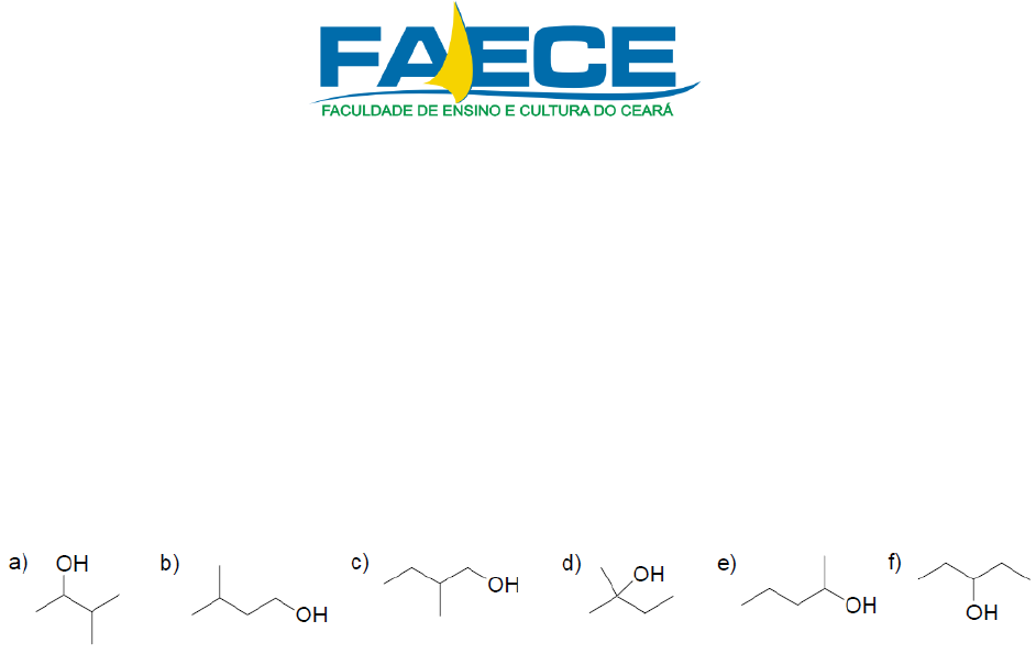 FACULDADE DE ENSINO E CULTURA DO CEARÁ CURSO DE FARMÁCIA DISCIPLINA: Química Orgânica PROFESSOR: João Vito 4ª LISTA DE EXERCÍCIOS – ESTEREOQUÍMICA 1. Qual a diferença entre isômero constitucional e estereoisômero? 2. Todas as moléculas abaixo possuem a fórmula molecular C5H12O? 3. Desenhe a conformação cadeira mais estável das seguintes moléculas: a) trans-1-cloro-3-metilciclo-hexano b) cis-1-bromo-4-etilciclo-hexano c) cis-1-etil-2-metilciclo-hexano d) cis-1-tert-butil-4-etilciclo-hexano 4. Desenhe o 1,3,5-trimetilciclo-hexano usando um hexágono regular para representar o anel. Quantos estereoisômeros cis-trans existem? Qual estereoisômero é mais estável? 5. Qual a diferença entre conformação e configuração? 6. Qual a diferença entre enantiômeros e diastereoisômeros? 7. Ordene em ordem decrescente de prioridade cada série de grupos substituintes abaixo: a) Metila; bromometila; etila. b) 2-metilpropila; 1-metiletila; ciclo-hexila. c) Butila; 1-metilpropila; 2-metilpropila; 1,1-dimetiletila. d) Etila; 1-cloroetila; 1-bromoetila; 2-bromoetila 8. Quais compostos abaixo contêm estereocentros? a) 2-cloropentano; b) 3-cloropentano; 3-cloro-1-penteno; d) 1,2-dicloropropano. Mostre as fórmulas tridimensionais e as projeções de Fischer dos estereoisômeros destes compostos e determine a configuração absoluta. 9. Quais das estruturas a seguir apresentam quiralidade: 2-metil-hexano; 3-metil-hexano; isopropil-benzeno; orto metil-etil benzeno; trans-1,3-dimetil ciclo-hexano; cis-1,3-dimetlcicloexano; 1-etilciclo-hexanol; 1-bromo-4-clorobutano, 1-bromo-3-cloro-butano 10. Um cicloalcano monossubstituído pode ser quiral? E um 1,4-dissubstituído? 11. Dê a configuração absoluta para as seguintes moléculas. Desenhe a projeção de Fisher para cada molécula. 12. Estão mostrados a seguir as projeções de Newman para o (R,R)-, (S,S)- e (R,S)- 2,3-diclorobutano. a) Correlacione as projeções com as respectivas configurações absolutas. b) Qual fórmula é um composto meso? 13. Qual é a configuração absoluta das moléculas abaixo: 14. Desenhe todos os estereoisômeros do 2,4-dibromo-3-cloropentano. 15. Quais são as relações estereoquímicas (idênticos, enantiômeros ou diasteroisômeros) das quatro moléculas abaixo? Determine a configuração absoluta de cada centro estereogênico. 16. Os aminoácidos isoleucina e aloisoleucina estão representados abaixo em suas conformações alternadas. Escreva as projeções de Fischer de cada molécula. Estes compostos são enantiômeros ou diasteroisômeros? 17. Quais alcenos abaixo possuem isomeria cis-trans? Para aqueles que possuem tal isomeria, desenhe o isômero trans. a) 2-Penteno; b) 2-Metil-2-penteno; c) 3-Metil-2-penteno 18. A epinefrina natural, [α]D = -50° é utilizada na medicina. Seu enantiômero é medicinalmente inútil e, na verdade tóxico. Suponha que você recebeu uma solução cujo rótulo diz conter 1g de epinefrina em 20 mL de solução, mas cuja pureza óptica não é especificada. Quando você coloca em um polarímetro (tubo de 10 cm) e obtém uma leitura de – 2,5°. Qual é a pureza óptica da amostra? Ela é segura para uso medicinal? 19. Quais das seguintes designações E, Z estão corretas, e quais estão incorretas? 20. A solução de uma substância desconhecida (3,0 g da substância em 20 mL de solução), quando colocada no tubo do polarímetro de 2,0 dm de comprimento, obteve uma rotação do plano da luz polarizada de 1,8° no sentido anti-horário. Qual a rotação específica da substância? 21. Indique se cada um dos pares de substâncias a seguir são idênticos ou enantiômeros, diasteroisômeros , ou isômeros constitucionais: H CO2H Z H H Br NH NH2 NC NE Z E Br Z HO O CO2H O E Z Z