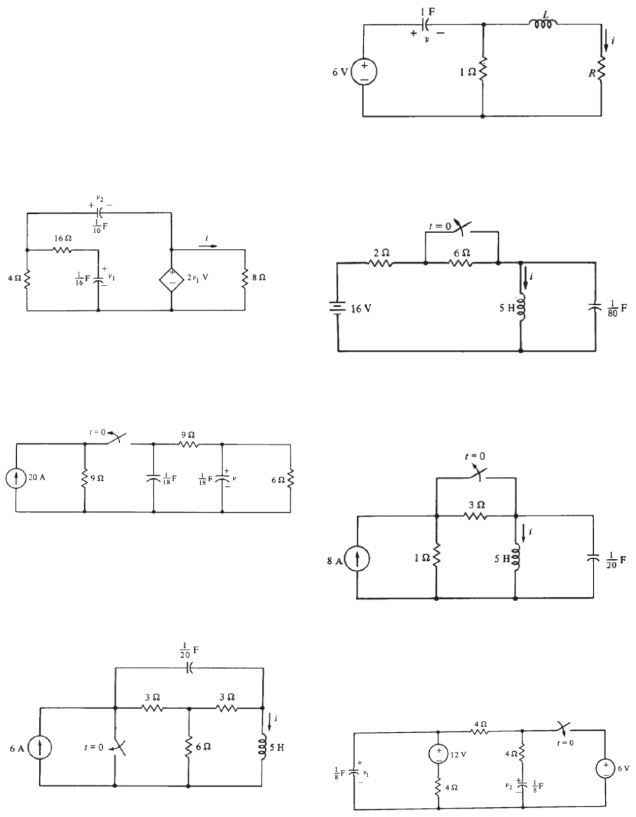 Lista de exercícios - 2ª ordem. 1- Calcule i para t > 0, se V1(0) = V2(0) = 4V.R: (1+4t)e^-2tA. 2 - Calcule V para t>0, se o circuito está em regime permanente em t = 0. R:54e^-2t - 9e^-6tV 3 - Calcule i para t>0, se o circuito está em regime permanente em t = 0-. R:(4+2t)e^-2tA. 4 - Calcule i para t>0, se V(0) = 2V, i(0) = 1A, e (a) L = 1H e R = 1Ω, (b) Vg = 10e^-2tV, e (c) Vg = 5e^-tV. R: (a) e^-t(cost+4sent)A (b) (1+3t)e^-2tA (c) 3e^-3t/2 - 2e^-2tA. 5 - Calcule i para t>0, se o circuito está em regime permanente em t = 0-. R: 8e^-2t - 2e^-8t +2A. 6 - Calcule i para t>0, se o circuito está em regime permanente em t=0.R: 8e^-t - 2e^-4t + 2A. 7 - Calcule V1 e V2 para t>0, se o circuito está em regime permanente em t = 0-. R: 3e^-4t + 9V, 6e^-2t + 6V. 8 - Calcule V para t>0, se o circuito está em regime permanente em t=0-. 9 - Calcule i, t>0, se não há energia inicial armazenada e (a) C = 1/12F, (b) C = 1/16F e (c) C = 1/32 F. R:5,29 e^-1,16t - 4,29e^- 5,16tA. 10 - Calcule i para t>0, se Ig = 10A e o circuito está em regime permanente em t=0-.R:(6+12t)e^- 2t + 4A. 11 - Calcule vpara t>0. R: - (4+24)e^-2t + 4V 12 - Calcule v para t>0. (b) Substitua as fontes de corrente e de tensão por 2cos 2tA e 6cos2tV, respectivamente, com as mesmas polaridadese calcule v para t>0 se não existir nenhuma energia inicial armazenada.R:(a) (2-12t)e^- 2t -2V. (b) (4-6t)e^-2t - 4cos 2t - sen 2tV. 13 - Referente ao circuito abaixo. Calcule: (a) IL(0+), Vc(0+), e Vr(0+) (b) dIL(0+)/dt, dVc(0+)/dt, e dVr(0=)/dr (c) IL(∞), Vc(∞) e Vr(∞). R: (a) 0A, -10V, 20V, (b) 0A/s, 0 V/s, 0V/s (c) 0,4A, 6V, 16V. 14 - No circuito abaixo encontre: (a) V(0+) e i(0+) (b) dV(0+)/dt e di(0+)/dt (c) V(∞) e i(∞) 15 - A equação diferencial que descreve a tensão em uma rede RLC é 16 - Se R = 20Ω, L = 0,6H, qual o valor de C em um circuito em série RLC: (a) superamortecido (b) Criticamente amortecido (c) subamortecido 16 - Encontre V(t) for t>0 se V(0) = 6V e i(0) = 2A no circuito abaixo. 17 - Calcule v(t) para t>0 no circuito abaixo. R:18e^-t - 2e^-9tV 18 - Encontre V(t) para t>0 no circuito abaixo. 19 - No circuito abaixo, calcule I0(t) e V0(t) para t>0. R: (24cos1,984t + 3,024sin1,984t)e^- t/4V 20 - Para o circuito abaixo encontre V(t) para t>0. R:50 - e^- 3t(62cos4t + 46,5sin4t)V 21 - Encontre V(t) para t>0 no circuito abaixo. R: 20-10e^-0,05tV 22 - Obtenha V(t) e i(t) para t>0 no circuito abaixo.R: 35 − (15 cos 0.6t + 20 sin 0.67t)e−0.8t V, 5 sin 0.6te−0.8t A 23 - Determine V(t) para t>0 no circuito abaixo.R:-6 + 6,02e^-0,16t - 2,01e^-47,83tV 24 - O interruptor do circuito abaixo é movido para a posição A para B em t = 0. Determine i(t) para t>0. R: (3 − 9t)e−5t A 25 - Para a rede abaixo, encontre i(t) para t>0. 26 - Dada a rede do circuito abaixo, encontre V(t) para t>0. R: −12 + (4 cos 4t + 3 sin 4t)e−3t V 27 - Dado o circuito abaixo, encontre i(t) e V(t) para t>0. R: −2(1 + t)e−2t A, (2 + 4t)e−2t V 28 - Determine i(t) para t>0 no circuito abaixo. R: 3t (3+9t)e^-2tA 29 - Para o circuito da figura abaixo,encontre i(t) para t>0. R: 9 + 2e−10t − 8e−2.5t A 30 - Para o circuito abaixo, encontre V(t) para t>0. Assumindo que V(0+) = 4V e i(0+) = 2A. R:7.45 − 3.45e−7.25t V, t > 0 31 - No circuito abaixo, encontre i(t) para t>0.R: (e^-15,125)/4 x (- 8cos(4,608t)+26,26sen(4,608)) + 2A.