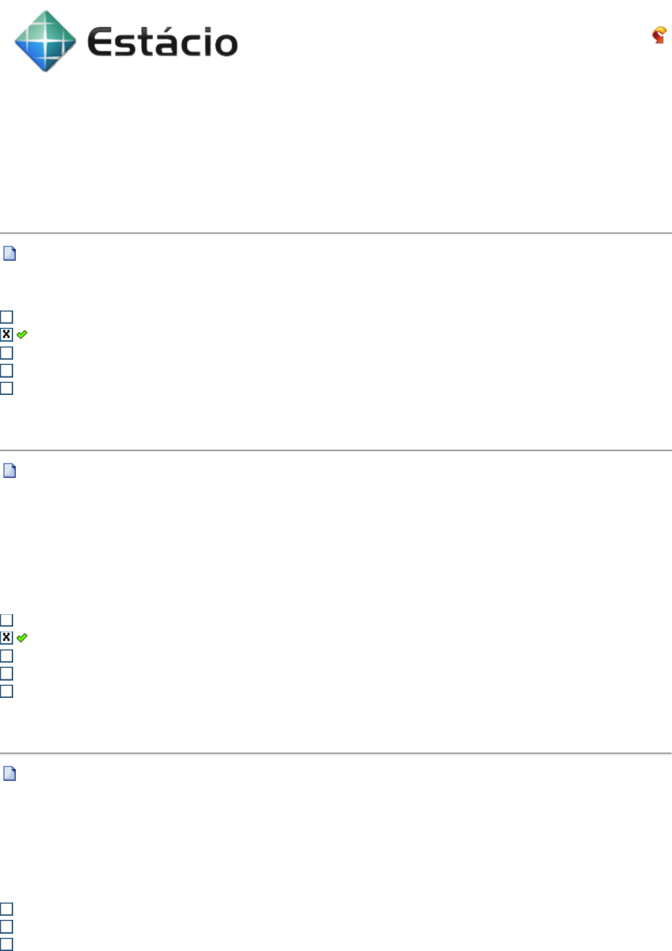 Parte superior do formulário Fechar Avaliação: NPG1505_AV_201801138265 » GESTÃO DO CONHECIMENTO E DA INOVAÇÃO EMPRESARIAL Tipo de Avaliação: AV Aluno: 201801138265 - CRISTIANO RAFAEL BRETTAS Professor: EDUARDO DE MOURA Turma: 9001/AA Nota da Prova: 6,0 Nota de Partic.: Av. Parcial Data: 20/05/2018 16:53:34 1a Questão (Ref.: 201801957792) Pontos: 0,6 / 0,6 O conjunto de técnicas e ferramentas que permite identificar, analisar e administrar, de forma estratégica e sistêmica, o ativo intelectual da empresa e seus processos associados, é a definição de gestão: de talentos. do conhecimento. de processos. de ativos. de competências. 2a Questão (Ref.: 201801957817) Pontos: 0,6 / 0,6 Leia as frases a seguir e julgue-as conforme as alternativas posteriores: I - O processo de educação dentro das organizações era considerado função do departamento de recursos humanos. À medida que cresce a consciência de que a educação é um processo contínuo e não um evento isolado (treinamento), a educação corporativa ganha força no cotidiano das organizações. II - O termo "treinamento" ainda é repetidamente empregado como sinônimo de educação corporativa. III - Treinamento é focalizado e guiado para questões pautadas no desempenho em curto prazo. IV - A educação corporativa é dirigida à ampliação das habilidades e competências do funcionário, oferecendo-lhe uma visão macro da empresa, com vistas ao aumento do capital intelectual da organização. Apenas as assertivas I, II e III estão corretas. Todas as assertivas estão corretas. Apenas a assertiva II está correta. Apenas as assertivas I, II e IV estão corretas. Apenas a assertiva I está correta. 3a Questão (Ref.: 201801957760) Pontos: 0,6 / 0,6 Na década de 80, o cenário mundial sofreu significativas transformações e a informação e o conhecimento aparecem como marco de uma nova etapa de acumulação econômica. Podemos entender esta nova ordem mundial como: I - Uma revolução que agrega novas capacidades a inteligência humana, mudando a forma de trabalhar e de viver. II - Resposta encontrada pelo sistema capitalista para o esgotamento de um padrão de acumulação baseado na produção em larga escala de cunho fordista. III - A informação e o conhecimento são recursos não materiais e tangíveis, portanto, inesgotáveis. IV - Exigência de novos formatos organizacionais enfatizando a descentralização, a terceirização e a interação interna e com parceiros de todos os tipos. As afirmativas I e II estão corretas. As afirmativas I e III estão corretas. As afirmativas II e IV estão corretas. As afirmativas I, II e IV estão corretas. As afirmativas I, II e III estão corretas. 4a Questão (Ref.: 201801940270) Pontos: 0,6 / 0,6 Quando se fala em gestão do conhecimento, pressupõe-se que exista um conceito bem definido do que venha a ser exatamente "conhecimento". Neste caso, assinale a opção que apresenta uma afirmação correta acerca do tema. Conhecimento não depende do contexto onde está inserido, nem é dinâmico. Conhecimento é implícito, orientado para a ação, mas não estando em constante mutação. O conhecimento tácito pode ser processado, armazenado e transmitido em textos, livros, apostilas e por computadores. Conhecimento pode ser definido como sendo de dois tipos, tácito (subjetivo) e explícito (objetivo). Conhecimento, dado e informação tem em síntese o mesmo significado. 5a Questão (Ref.: 201801957794) Pontos: 0,6 / 0,6 Na gestão das organizações, a criação do conhecimento se dá pela interação entre o conhecimento tácito e o conhecimento explícito. O diálogo e a reflexão coletiva são características do modo de interação do conhecimento tácito e explícito denominado de: Combinação. Rede Social. Internalização. Socialização. Externalização. 6a Questão (Ref.: 201801957781) Pontos: 0,6 / 0,6 A gestão do conhecimento apoia-se em um conjunto de processos relativos à geração, organização, desenvolvimento e distribuição de conteúdos relevantes a serem disponibilizados. Um dos principais problemas enfrentados, que o processo de desenvolvimento de conteúdos objetiva solucionar, é: o excesso de material disponível. a geração de conhecimento tácito. a resistência psicológica em compartilhar conhecimento. a falta de registro de conteúdos confidenciais. a falta de infraestrutura tecnológica. 7a Questão (Ref.: 201801957805) Pontos: 0,6 / 0,6 A noção de competência, no modo de pensar atual, está vinculada a duas dimensões: uma organizacional e outra gerencial. Qual das opções abaixo descreve corretamente estas dimensões? As competências organizacionais são coletivas e aparecem sob forma de processos de produção. As competências gerenciais são competências também coletivas, mas geram diferenciação. As competências organizacionais são uma dimensão corporativa de competências, enquanto As competências gerenciais são a dimensão coletiva da gerência média organizacional. As competências organizacionais são decorrentes dos treinamentos e representam a qualificação dos membros organizacionais; já as gerenciais são as competências seletivas que geram diferencial organizacional. As competências organizacionais podem ser seletivas e seguirem o mesmo princípio conceitual do Core Competence, enquanto as gerenciais são a mobilização e aplicação de conhecimentos e capacidades numa situação específica. As competências organizacionais devem contribuir para a expansão da empresa em caráter imediatíssimo, por isso são consideradas estratégicas, ao contrário das gerenciais, que são operacionais. 8a Questão (Ref.: 201802354057) Pontos: 0,6 / 0,6 Para muitos estudiosos, a gestão do conhecimento pode ser entendida como a geração, representação, estoque, transferência, transformação, aplicação, incorporação e proteção de conhecimento. A gestão do conhecimento está relacionada à/ao, EX