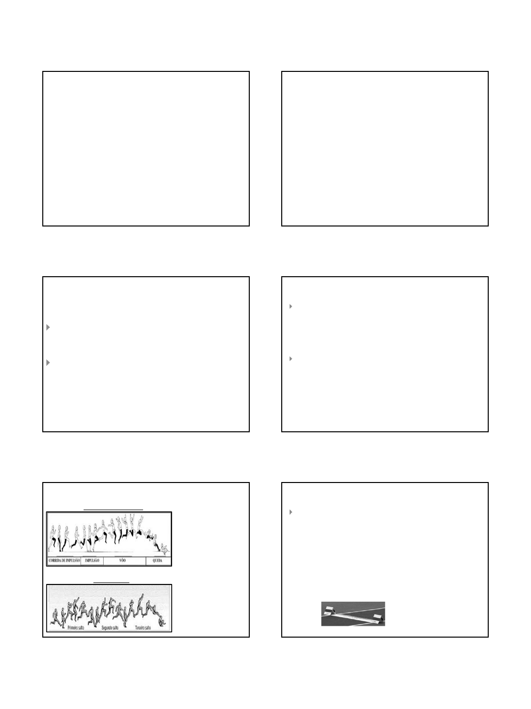 20/04/2018 1 Educação Física - Licenciatura Aula 02 Os saltos horizontais e verticais no atletismo Prof. Me. Túlio Bernardo Macedo Alfano Moura Objetivos Conhecer as provas de saltos horizontais e saltos verticais Compreender as diversas possibilidades de adaptação de materiais Movimento fundamental que ocorre quando o corpo é projetado no ar pela força gerada em uma ou em ambas pernas e corpo pousa sobre um ou ambos os pés (Payne e Isaacs, 2007) Apresenta formas variadas: Salto horizontal (ênfase para frente) Salto vertical (ênfase para cima) O salto Saltos horizontais Salto em distância Salto triplo Sucessão de movimentos eficazes: Corrida de aproximação - Ocorre de forma progressiva - Durante a aprendizagem, o professor pode optar por distâncias curtas Impulsão - Com um pé - O professor deve estimular a prática com ambos os lados Salto em distância 20/04/2018 2 Fase de voo Aterrissagem - Aproximação das mãos com os pés - Pé toca a areia primeiro Salto em distância Grupado Arco Passada no ar Ângulo de saída da tábua Linthorne, 2005 Uma das provas mais antigas no atletismo Utilização de objetos que auxiliavam na obtenção de maiores distâncias (Antiguidade) Histórico e evolução Halteres 2 a 9 Kg Feito em pedra http://arte.folha.uol.com.br/esport e/2016/03/22/olimpia-publish/ Histórico e evolução http://www.clicrbs.com.br/especi ais/jsp/default.jsp?newsID=a1792 634.htm&template=3847.dwt&se ction=Not%EDcias&espid=83 http://www.atribunamt.com.br/2013/08/mai s-esportes-89/ Vídeo Salto em distância Fonte: https://www.youtube.com/watch?v=9QGlOoutwLY Aprendizagem: - Professor não deve selecionar uma grande distância a ser percorrida na corrida de aproximação - Iniciar com atividades de salto de forma livre - Aumentar complexidade de acordo com a progressão da aprendizagem Aprendizagem do salto em distância 20/04/2018 3 Vídeo Salto em distância - T11 Fonte: https://www.youtube.com/watch?v=dMSjXQSoKek Tecnicamente, esta prova é mais complexa do que o salto em distância Altas cargas mecânicas devido ao segundo salto Vivência do saltar é o maior objetivo Salto triplo Salto triplo Fases: -Corrida de aproximação -Realização dos três saltos -Queda Corrida de aproximação possui as mesmas características do salto em distância Tábua de 13 metros para os homens e 11 para as mulheres Durante a aprendizagem, o professor deve adotar distâncias seguras Salto triplo Sequência de saltos Direita, direita e esquerda ou esquerda, esquerda e direita -Hop -Step -Jump Queda parecida ao salto em distância Salto triplo 20/04/2018 4 Jogos Olímpicos: 1896 James Connolly 13.71m Apenas durante os anos 90 para as mulheres Grande tradição olímpica no país Histórico e evolução Histórico e evolução https://en.wikipedia.org/wiki/ Adhemar_da_Silva http://globoesporte.globo.com/atletismo/notic ia/2015/10/voo-eterno-40-anos-depois- recorde-de-joao-do-pulo-emociona- tecnico.html http://www.jb.com.br/fotos-e- videos/galeria/2012/11/23/medalhista- olimpico-nelson-prudencio-morre-aos-68- anos/ Recorde masculino: 18.29 (Jonathan Edwards – ING) Recorde feminino: 15.50 (Inessa Kravets – Ucrânia) Histórico e evolução https://www.gettyimages.com/detail/news- photo/inessa-kravets-from-ukraine- performs-in-the-womens-olympic-news- photo/51976232 https://www.thesun.co.uk/sport/athletics/3456493/j onathan-edwards-paula-radcliffe-world-records- athletics/ Fase de classificação em competições com mais de 8 atletas Critério de desempate: segundo melhor salto Impulsão deve ser realizada preferencialmente sobre a tábua de impulsão. Principais regras Salto mortal não é permitido Medição da tábua: linha de medição da tábua até marca mais próxima da borda na areia Principais regras Vídeo Salto triplo Fonte: https://www.youtube.com/watch?v=G5oxSt3NcCw 20/04/2018 5 Descreva uma atividade alternativa para a apresentação do salto em distância e uma para o salto triplo, as quais podem ser colocadas em prática durante a aula de Educação Física Escolar. Atividade em Sala Saltos verticais Salto em altura Salto com vara Integra o programa olímpico desde 1896 (Atenas) Principais materiais: Dois postes, sarrafo e colchão Diferentes estilos de transposição do sarrafo foram desenvolvidos com o decorrer do tempo Salto em altura Recorde mundial - Homens: 2,45m (Javier Sotomayor) - Mulheres: 2,09m (Stefka Kostadinova) Recordes http://www.surtoolimpico.com.br/2015/07/as-lendas- do-pan-javier-sotomayor.html https://www.iaaf.org/athletes/athlet e=60986 Recomendado para início da aprendizagem Aprendido facilmente Passagem do sarrafo com a perna externa ao sarrafo Estilo tesoura http://www.moodleaguplec apalmeira.net Perna de impulsão será a mais próxima do sarrafo Perna livre é lançada com os braços para cima, sempre na posição de decúbito ventral Estilo de rolo ventral (californiano) http://files.efd321.webnode. com.br 20/04/2018 6 Apresentado por Dick Fosbury em 1968 (México) Corrida é mais rápida Salto com a perna externa ao sarrafo Giro no momento da elevação Estilo Fosbury Flop Vídeo Estilos técnicos Fonte: https://www.youtube.com/watch?v=QTkVfboHKsg Apenas um dos pés pode realizar a impulsão; Cada saltador tem direito a 3 tentativas por altura; A tentativa não será validada caso o sarrafo não permaneça nos suportes Principais regras O saltador poderá escolher a altura inicial; O primeiro critério de desempate será o número de realizadas por cada atleta na altura anterior; Principais regras Qual tipo de atividade pode ser realizada para desenvolver o salto em altura no contexto escolar. Qual estilo técnico é o mais indicado para a aprendizagem inicial? Dois postes, um colchão, um sarrafo e uma vara Colchão como fator de segurança Uma das provas mais complexas no atletismo Inicialmente de bambu Alumínio, aço e fibras de carbono Salto com vara 20/04/2018 7 Empunhadura, corrida de aproximação e preparação para o enca
