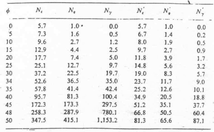 Tabela - Fatores de Capacidade de Carga de Terzaghi (obtidos em Bowles, 1968).