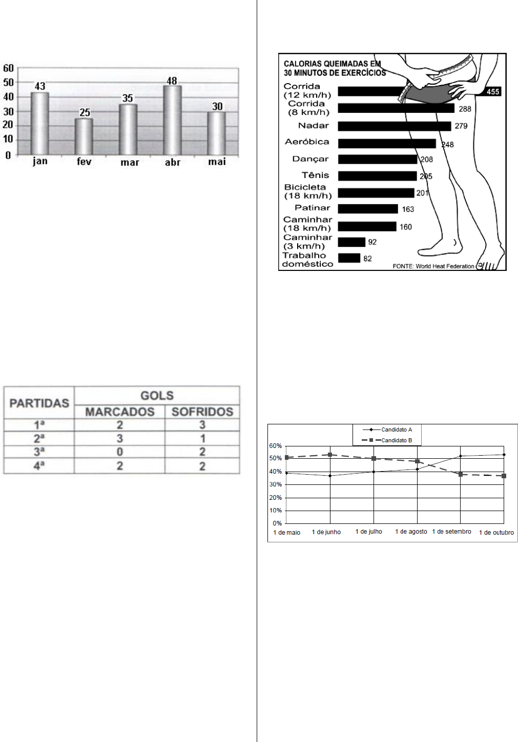D36 - Resolver problema envolvendo informações apresentadas em tabelas e/ou gráficos (Prova Brasil). O consumo de água em residências é medido em metros cúbico (m³). Observando no gráfico abaixo o consumo de água da casa de Carlos em 5 meses. (☻☻) Na casa de Carlos, os dois meses em que o consumo foi maior que 40 m³ são: (A) janeiro e abril. (B) janeiro e maio. (C) março e fevereiro. (D) abril e maio. ********************************************************* Sabendo que o saldo de gols corresponde à diferença entre o número de gols marcados e o número de gols sofridos, observe a tabela abaixo referente às quatro primeiras partidas de determinado time e responda: (☻☻) Para que após o quinto jogo desse time o saldo de gols seja +1, este deverá: (A) empatar com o time adversário. (B) perder o jogo por um gol de diferença. (C) vencer, marcando 1 gol a mais que o time adversário. (D) vencer, marcando 2 gols a mais que o time adversário. *************************************** O técnico de um atleta passa a seguinte série de exercícios: 1º - caminhar meia hora a 3 km/h; 2º - correr 12 km, a uma velocidade constante, em 1 hora; 3º - nadar durante 1 hora; 4º - andar 9 km de bicicleta, a uma velocidade constante, em meia hora. Baseando-se na tabela abaixo, quantas calorias o atleta queima na série de exercícios? (A) 1546 calorias. (B) 1846 calorias. (C) 1356 calorias. (D) 1761 calorias *************************************** O gráfico abaixo mostra a evolução da preferência dos eleitores pelos candidatos A e B. (☻☻) Em que mês o candidato A alcançou, na preferência dos eleitores, o candidato B? (A) Julho (B) Agosto (C) Setembro (D) Outubro ****************************************************** O gráfico abaixo mostra como a temperatura média no estado do Rio de Janeiro variou durante 50 horas seguidas. Registros desse tipo são continuamente obtidos pelo Instituto Nacional de Pesquisas Espaciais. (Adaptação). Segundo o gráfico acima, a temperatura mínima registrada nesse período foi de: (A) 14 ºC (B) 15 ºC (C) 16 ºC (D) 17 ºC *************************************** (PROEB). Uma rede de supermercados resolveu fazer uma pesquisa para saber qual horário as pessoas mais gostavam de ir ao supermercado. Foram entrevistadas 2000 pessoas e o resultado está no gráfico abaixo. (☻☻) Durante qual horário a maioria das pessoas entrevistadas preferem ir ao supermercado? (A) 8h às 12h. (B) 12h às 16 h. (C) 16h às 20 h. (D) 23h às 24h. ******************************************************** O gráfico mostra as vendas de televisores em uma loja: Pode-se afirmar que: (A) as vendas aumentaram mês a mês. (B) Foram vendidos 100 televisores até junho. (C) As vendas do mês de maio foram inferiores á soma das vendas de janeiro e fevereiro. (D) Foram vendidos 90 televisores até abril. ****************************************************** Um grupo foi ao zoológico e contou a quantidade de visitas que alguns animais receberam. Com os dados, construiu o gráfico abaixo. (☻☻) É correto afirmar que: (A) 120 pessoas visitaram os macacos e os tigres. (B) Os macacos e as onças foram os animais mais visitados. (C) Os animais mais visitados foram os tigres. (D) Os animais menos visitados foram às araras. ***************************************************** Uma pesquisa de opinião foi realizada para avaliar os níveis de audiência de alguns canais de televisão, entre 20h e às 21h, durante uma determinada noite. Os resultados obtidos estão representados no gráfico de barras abaixo: O número de residências ouvidas nessa pesquisa foi de aproximadamente: (A) 135 (B) 200 (C) 150 (D) 250 *************************************** A tabela mostra o número de carros vendidos, em certa concessionária, no primeiro trimestre do ano. (☻☻) É correto afirmar que: (A) Foram vendidos 31 carros do tipo X. (B) O melhor mês de vendas foi janeiro. (C) Foram vendidos 41 carros em fevereiro. (D) Em fevereiro foram vendidos mais carros do tipo Y. *************************************** A tabela abaixo indica o número de medalhas que alguns países receberam nas Olimpíadas de 1996. Analisando as informações da tabela, é correto afirmar que: (A) Os estados Unidos obtiveram 73 medalhas a mais que a França. (B) A França obteve exatamente o dobro de medalhas do Brasil. (C) A Alemanha ganhou 50 medalhas a mais que o Brasil. (D) O Brasil obteve 12 medalhas a menos que a França. *************************************** Ana é secretária de um médico. Ela registrou na agenda dele alguns atendimentos do dia, na parte da manhã. Veja o que ela fez. (☻☻) Quanto tempo dura uma consulta desse médico? (A) 45 minutos. (B) 60 minutos. (C) 30 minutos. (D) 15 minutos. ************************************** O gráfico, a seguir, mostra a quantidade de carros vendidos em uma loja nos meses de maio, junho, julho e agosto. De acordo com o gráfico, observa-se que: (A) em junho vendeu-se a mesma quantidade de carros que em agosto. (B) em maio venderam-se menos carros do que em agosto. (C) julho foi o mês no qual se venderam menos carros. (D) agosto foi o mês no qual se venderam mais carros. *************************************** Uma pesquisa da ONU estima que, já em 2008, pela primeira vez na história das civilizações, a maioria das pessoas viverá na zona urbana. O gráfico a seguir mostra o crescimento da população urbana desde 1950, quando essa população era de 700 milhões de pessoas, e apresenta uma previsão para 2030, baseada em crescimento linear no período de 2008 a 2030. De acordo com o gráfico, a população urbana mundial em 2020 corresponderá, aproximadamente, a quantos bilhões de pessoas? (A) 4,00 (B) 5,00 (C) 3,50 (D) 4,20 *************************************** Três restaurantes populares disputam a clientela numa região central do Rio de Janeiro nos finais de semana. Observe abaixo os pratos oferecidos. Qual restaurante serve 