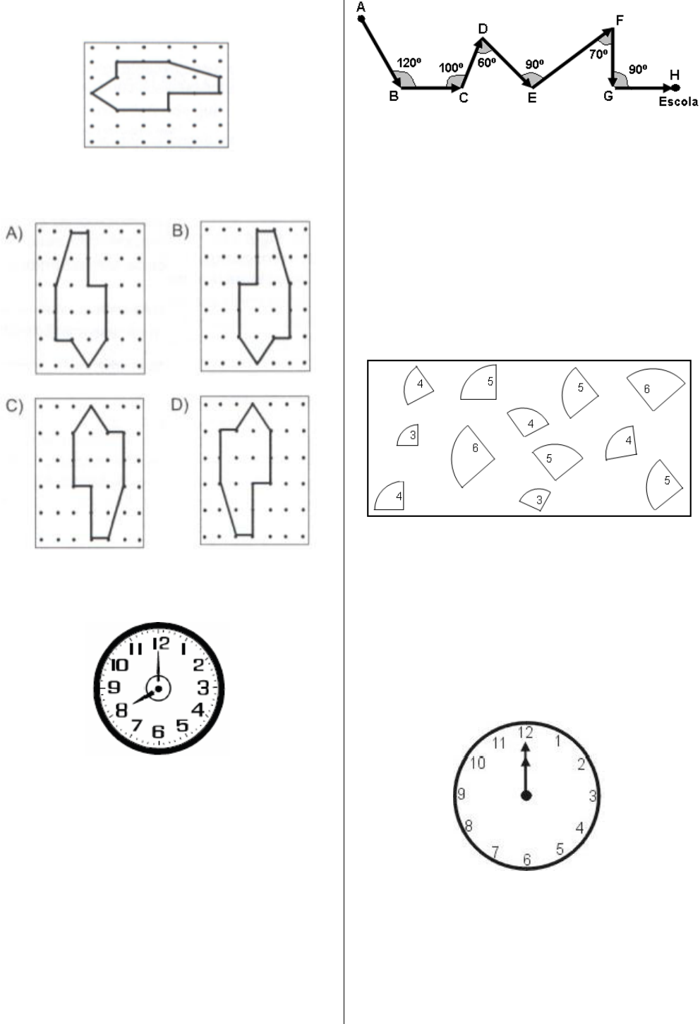 D6 - Reconhecer ângulos como mudança de direção ou giros, identificando ângulos retos e não retos (SAEGO). Observe a figura abaixo: Se realizarmos um giro de 90º nessa figura, no sentido horário, a figura que encontraremos será: Resposta: C **************************************** (Prova Brasil). Os 2 ângulos formados pelos ponteiros de um relógio às 8 horas medem (A) 60º e 120º (B) 120º e 160º (C) 120º e 240º (D) 140º e 220º **************************************** Para chegar à escola, Carlos realiza algumas mudanças de direção como mostra a figura a seguir: As mudanças de direção que formam ângulos retos estão representadas nos vértices: (A) B e G. (B) D e F. (C) B e E. (D) E e G. ************************************** Na figura abaixo, há um conjunto de setores circulares, cujos ângulos centrais são de 90º. Cada setor está com a medida do seu raio indicada. Agrupando, convenientemente, esses setores, são obtidos: (A) 3 círculos. (B) no máximo um círculo. (C) 2 círculos e 2 semicírculos. (D) 4 círculos. *************************************** Observe os ponteiros nesse relógio: Decorridas 3 horas, qual é o ângulo formado pelos ponteiros? (A) 15° (B) 45° (C) 90º (D) 180° *************************************** Um navio pirata faz as seguintes mudanças de direção como mostra a figura a seguir: (☻☻) As mudanças de direção que formam ângulos retos estão representadas nos vértices: (A) C e D. (B) A e D. (C) E e F. (D) D e F. *************************************** O menor ângulo formado pelos ponteiros de um relógio às 9 horas mede: (A) 120º (B) 15º (C) 270º (D) 90º **************************************** (PROEB). Luciana chegou à escola às 4 horas, conforme indica o desenho do relógio abaixo. Nesse momento, qual é a medida do ângulo entre esses dois ponteiros? A) 30º B) 60º C) 120º D) 240º ************************************** Ana toma um remédio de três em três horas. Ela tomou o remédio pela 1ª vez na hora indicada pelo relógio abaixo. Na próxima vez em que ela tomar o remédio, qual será o menor ângulo formado pelos ponteiros das horas A) 15º B) 90º C) 120º D) 180º ************************************** A roda gigante de um parque de diversões gira em torno de um eixo. Uma volta completa corresponde a um movimento de 360 graus ou 360°. Neste momento, quatro personagens estão posicionados na roda gigante. Em relação à posição indicada pela seta (_), o personagem que está a 270° é: **************************************** Observe a rosa dos ventos abaixo. O ponto de referência da rosa dos ventos que está a 90° do norte (N) é (A) S. (B) NO. (C) O. (D) SO. ************************************** Disponível em: http://www.diaadia.pr.gov.br. Acesso em: 28 abr. 2010. – Enem 2011 O polígono que dá forma a essa calçada é invariante por rotações, em torno de seu centro, de (A) 45°. (B) 60º (C) 90º (D) 120º **************************************** (Concurso publico – Eletrobrás). Considere o polígono abaixo: Analise as seguintes afirmativas sobre esse polígono: I – possui 11 lados; II – possui 11 ângulos internos; III – possui 5 ângulos internos obtusos (maiores que 90o). É/são verdadeira(s) somente: (A) I; (B) III; (C) I e II; (D) I, II e III. ************************************** (Saresp 2005). No desenho abaixo, o círculo deve ser ornamentado por meio de reflexões do mesmo motivo em torno das retas indicadas. A figura a ser desenhada em D é: ***************************************** (Saresp 2005). Considere o triângulo ABC abaixo. Realizando uma rotação de 90o no sentido horário em torno do vértice A, observaremos que: (A) as medidas de e α se mantêm. (B) a medida de se mantém mas a de α não. (C) a medida de α se mantém mas a de não. D) as medidas de e α irão alterar-se. ******************************************************* (Saresp 2007). O movimento completo do limpador do pára-brisa de um carro corresponde a um ângulo raso. Na situação descrita pela figura, admita que o limpador está girando em sentido horário. Calcule a medida do ângulo que falta para que ele complete o movimento completo. (A) 50º (B) 120º (C) 140º (D) 160º ******************************************** � PAGE �1� _1383416951.unknown _1383416907.unknown