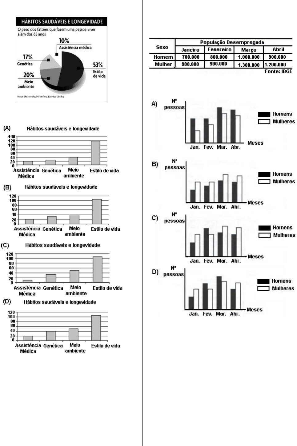 D37 - Associar informações apresentadas em listas e/ou tabelas simples aos gráficos que as representam e vice-versa Os alunos da 8ª série fizeram uma estimativa para 200 pessoas com base no estudo abaixo. Que gráfico de barras melhor representa o estudo? (☻☻) ************************************** (SIMAVE). A tabela abaixo mostra os dados de uma pesquisa sobre o número de pessoas desempregadas no Brasil, por sexo, de Janeiro a Abril de 2009. (Resp. B) O gráfico que melhor representa os dados dessa tabela é: ************************************** Qual é o gráfico que representa a variação da temperatura mínima nessa cidade, nessa semana? ************************************ (SAERS). Em uma pesquisa sobre atendimento médico, foi perguntado a um grupo de pessoas sobre o que eles fariam caso fossem mal atendidos em uma consulta médica. Os resultados estão registrados no gráfico de barras a seguir: (☻☻) De acordo com os dados desse gráfico, o quadro que representa essas informações é: *************************************** O gráfico abaixo mostra o resultado de uma pesquisa feita entre os visitantes de um zoológico sobre a preferência dos animais. (☻☻) A tabela que deu origem ao gráfico, é: **************************************** Foi realizada uma pesquisa sobre o local onde cada aluno da 5ª série A nasceu. Com as informações obtidas o professor construiu o seguinte gráfico de barras. A tabela que deu origem ao gráfico, é: *************************************** A tabela seguinte mostra os números de pares de calçados vendidos pela loja “Pise Bem”, durante os meses de janeiro a abril de 2010. O gráfico que melhor representa a tabela é: *************************************** Observe o gráfico de barras que mostra o número de helicópteros da frota brasileira, no período de 1997 a 2002. (☻☻) Das tabelas a seguir, qual corresponde aos dados apresentados nesse gráfico? ************************************** Melissa viu, em seu livro de Geografia, um quadro que mostra a área de Mata Atlântica que ainda está preservada em alguns estados brasileiros. Veja abaixo. Ao representar essas áreas em um gráfico, Melissa obteve **************************************** Para a final do Campeonato Estadual de Futebol estão classificados quatro times. Foi feita uma pesquisa entre os alunos da escola, com o objetivo de saber a preferência em relação a um deles. Cada aluno votou em um só time e os resultados estão no gráfico a seguir. Então, a tabela que corresponde aos dados desse gráfico é: ******************************************************* Qual gráfico corresponde a essa informação? (Resp. C) **************************************** (Concurso publico – Eletrobrás). Nos jogos Pan-Americanos de 2007 (PAN-2007), o Brasil obteve as seguintes medalhas: (Resp. C) O gráfico que representa a distribuição de medalhas obtidas pelo Brasil no PAN-2007 é: ****************************************************** (Saresp 2007). Para saber quais eram os tipos de revistas esportivas mais lidas, foi feita uma pesquisa em um determinado bairro. Qual o gráfico que representa os dados acima apresentados? ***************************************************** (Saresp 2003). Num campeonato de boliche, os pontos que Ana, Lia, Rui e Zeca marcaram aparecem na tabela abaixo: O gráfico que mostra a distribuição dos pontos é... ****************************************************** (Saresp 2005). Uma pesquisa foi respondida por 200 pessoas, que indicaram o local que mais freqüentam nos finais de semana. A distribuição das respostas está registrada na tabela seguinte: O gráfico de setores que representa o resultado dessa pesquisa pode ser: ******************************************************* � PAGE �7�