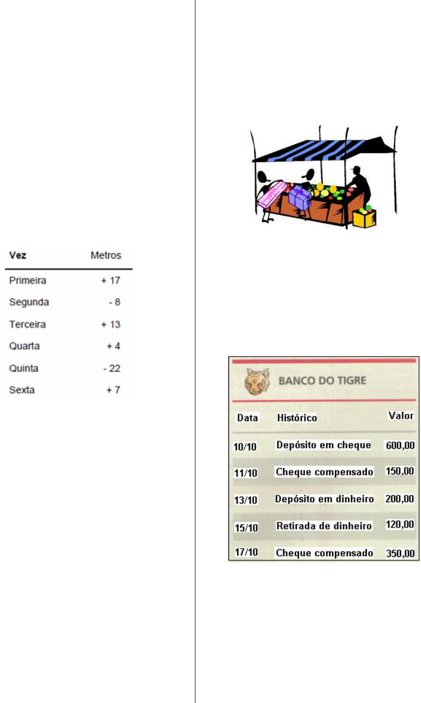 D20 - Resolver problema com números inteiros envolvendo as operações (adição, subtração, multiplicação, divisão e potenciação) (Prova Brasil). Na correção de uma prova de um concurso, cada questão certa vale +5 pontos, cada questão errada vale – 2 pontos, e cada questão não respondidas vale – 1 ponto. Das 20 questões da prova, Antônio acertou 7, errou 8 e deixou de responder as restantes. O número de pontos que Antônio obteve nessa prova foi: (A) 14 (B) 22 (C) 24 (D) 30 **************************************** (Prova brasil). Cíntia conduzia um carrinho de brinquedo por controle remoto em linha reta. Ela anotou em uma tabela os metros que o carrinho andava cada vez que ela acionava o controle. Escreveu valores positivos para as idas e negativos para as vindas. Após Cíntia acionar o controle pela sexta vez, a distância entre ela e o carrinho era de (☻☻) (A) – 11 m (B) 11 m (C) – 27 (D) 27 m **************************************** (Prova Brasil). Numa cidade da Argentina, a temperatura era de 12ºC. Cinco horas depois, o termômetro registrou – 7ºC. (☻☻) A variação da temperatura nessa cidade foi de: (A) 5 ºC (B) 7 ºC (C) 12 ºC (D) 19 ºC *************************************** Em uma cidade do Alasca, o termômetro marcou –15º pela manhã. Se a temperatura descer mais 13º, o termômetro vai marcar: (A) – 28º. (B) – 2º. (C) 2º. (D) 28º. *************************************** Um comerciante fez três vendas e teve prejuízo de R$ 16,00 na primeira venda, prejuízo de R$ 23,00 na segunda e lucro de R$ 45,00 na terceira. Podemos calcular o saldo resultante dos três negócios efetuados desta maneira: (A) –16 + (–23) + 45 = 6. (B) –16 – 23 – 45 = – 84. (C) 16 – 23 + 45 = 84. (D) –16 + 23 – 45 = – 38. *************************************** Veja o extrato que mostra a movimentação da conta bancaria de Gilda. Depois de todas essas informações, o extrato final da conta de Gilda é: (A) R$ 180,00 (B) R$ 780,00 (C) R$ 1420,00 (D) R$ 350,00 *************************************** Na figura abaixo faz parte de um trecho do extrato bancário de Sr. Carlos. Os valores dos saldos provisórios de A, B e C, são respectivamente: (☻☻) (A) 0,00; + 600,00 e 400,00. (B) 0,00; – 600,00 e – 400,00. (C) + 800,00; + 200,00 e + 400,00. (D) – 800,00; + 500,00 e 0,00. *************************************** Na figura podemos verificar a relação de altura entre um avião e um submarino em relação ao nível do mar. A distância entre o avião e o submarino é: (A) 900 metros. (B) – 900 metros. (C) 1500 metros. (D) – 1500 metros. **************************************** A parte da lua iluminada pelo Sol tem uma temperatura de + 110 graus e, a parte não iluminada, de – 130 graus. A variação de temperatura entre a parte iluminada e a não iluminada é: (A) 240 graus (B) 110 graus (C) 130 graus (D) – 30 graus. *************************************** O funcionário de um supermercado ficou gripado. Ele explicou que estava fazendo muito calor (33,5 ºC) e que, quando entrou na câmara frigorífica, a temperatura desceu 40 ºC. A temperatura dentro da câmara frigorífica é: (A) – 40 ºC. (B) – 7,5 ºC. (C) – 6,5 ºC. (D) 7,5 ºC. *************************************** Um depósito de bebidas recebeu 32 caixas de refrigerante da marca A e 25 caixas de refrigerantes da marca B. Cada caixa contém 12 unidades de refrigerante. Para o dono do deposito, cada refrigerante da marca A custa R$ 1,75 e o da marca B, R$ 2,10. O dono do deposito de refrigerante pagou pelas mercadorias foi de: (A) R$ 1.302,00. (B) R$ 108,50. (C) R$ 686,00. (D) R$ 950,00. ************************************** Na loja “Bom de bola“, o preço da bola oficial de vôlei está em promoção. Veja. Fonte: www.jogo.com.br Pedro aproveitou essa promoção e comprou uma bola. Ele pagou com uma nota de 50 Reais. Quanto Pedro recebeu de troco? A) R$ 10,25 B) R$ 11,55 C) R$ 28,45 D) R$ 50,00 *************************************** Para fazer uma receita, Regina precisa de 1 kg de carne. Ao tirar o pacote de carne da geladeira, vê que ele tem apenas 625 gramas. De quantos gramas de carne ela ainda precisa para fazer a receita? A) 375 gramas. B) 325 gramas. C) 425 gramas. D) 485 gramas. *************************************** As regras de um campeonato de futebol são: Ao término do campeonato, um time obteve os seguintes resultados: 3 vitórias, 1 derrota e 2 empates. Quantos pontos alcançou esse time? A) -2 B) 0 C) +3 D) +5 *************************************** Veja a expressão numérica abaixo. O resultado dessa expressão é A) +120 B) +80 C) -60 D) -160 ************************************* Uma rede oficial de vôlei é colocada a 2,43 metros de altura do chão. O jogador mais alto da equipe Verde-Mar mede 1,85 m. Qual é a diferença de altura entre esse jogador e a rede oficial de vôlei? A) 0,58 metro. B) 1,42 metro. C) 1,68 metro. D) 1,85 metro. ************************************* Ao passar na porta de segurança de um banco, Vítor fez acionar o alarme. Ele levava uma carteira com 14 moedas, umas de 25 centavos e outras de 50 centavos num total de 4 reais. Quantas moedas de 25 centavos Vítor levava em sua carteira? A) 2 B) 7 C) 10 D) 12 ************************************** No mar, um mergulhador profissional atingiu uma profundidade de 18,4m. A seguir, subiu 3,5m e, depois, desceu 5,8m. Qual a profundidade máxima que ele atingiu? (A) 16,8 m. (B) 17,9 m. (C) 18,9 m. (D) 20,7 m. *************************************** No inverno do Alasca, a temperatura pode variar de - 22º a - 45º. Em Nova York, as temperaturas, no inverno, variam de -2° a -10°. A menor dessas temperaturas é (A) -2°. (B) -10°. (C) -22°. (D) - 45°. *************************************** O saldo da conta de Eva estava negativo em R$ 75,00. Mesmo assim, ela pagou uma conta de R$ 123,00 usando esta conta corrente. O saldo atual da conta corrente de Eva