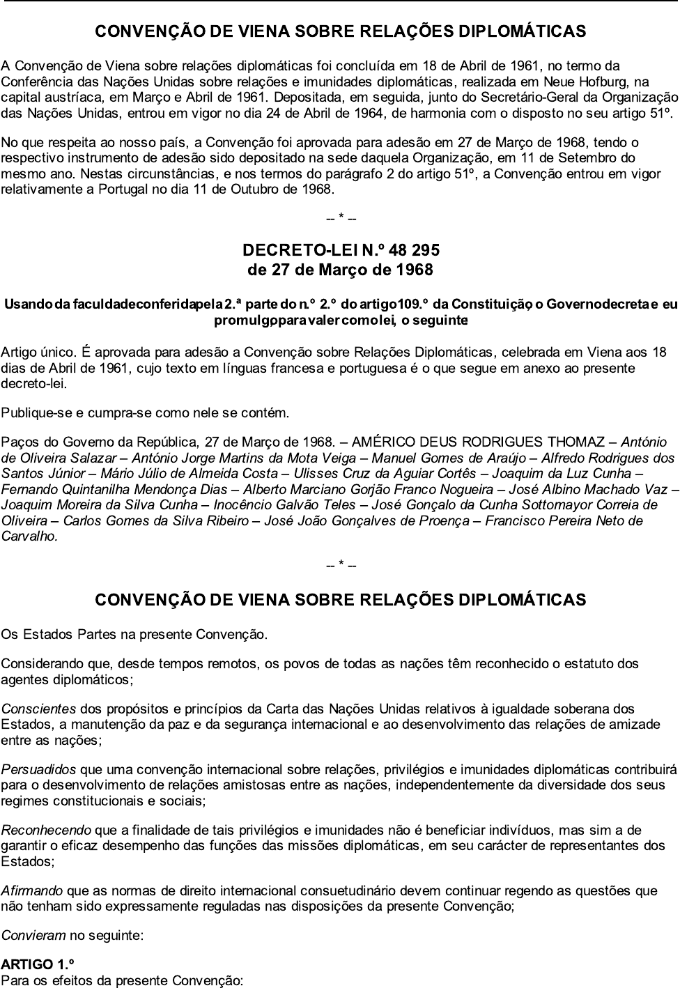 CONVENÇÃO DE VIENA SOBRE RELAÇÕES DIPLOMÁTICAS A Convenção de Viena sobre relações diplomáticas foi concluída em 18 de Abril de 1961, no termo da Conferência das Nações Unidas sobre relações e imunidades diplomáticas, realizada em Neue Hofburg, na capital austríaca, em Março e Abril de 1961. Depositada, em seguida, junto do Secretário*Geral da Organização das Nações Unidas, entrou em vigor no dia 24 de Abril de 1964, de harmonia com o disposto no seu artigo 51º. No que respeita ao nosso país, a Convenção foi aprovada para adesão em 27 de Março de 1968, tendo o respectivo instrumento de adesão sido depositado na sede daquela Organização, em 11 de Setembro do mesmo ano. Nestas circunstâncias, e nos termos do parágrafo 2 do artigo 51º, a Convenção entrou em vigor relativamente a Portugal no dia 11 de Outubro de 1968. ** * ** DECRETO�LEI N.º 48 295 de 27 de Março de 1968 Usandoda faculdadeconferidapela2.ª partedon.º 2.º doartigo109.º da Constituição, o Governodecretae eu promulgo, paravalercomolei, o seguinte: Artigo único. É aprovada para adesão a Convenção sobre Relações Diplomáticas, celebrada em Viena aos 18 dias de Abril de 1961, cujo texto em línguas francesa e portuguesa é o que segue em anexo ao presente decreto*lei. Publique*se e cumpra*se como nele se contém. Paços do Governo da República, 27 de Março de 1968. – AMÉRICO DEUS RODRIGUES THOMAZ – António de Oliveira Salazar – António Jorge Martins da Mota Veiga – Manuel Gomes de Araújo – Alfredo Rodrigues dos Santos Júnior – Mário Júlio de Almeida Costa – Ulisses Cruz da Aguiar Cortês – Joaquim da Luz Cunha – Fernando Quintanilha Mendonça Dias – Alberto Marciano Gorjão Franco Nogueira – José Albino Machado Vaz – Joaquim Moreira da Silva Cunha – Inocêncio Galvão Teles – José Gonçalo da Cunha Sottomayor Correia de Oliveira – Carlos Gomes da Silva Ribeiro – José João Gonçalves de Proença – Francisco Pereira Neto de Carvalho. ** * ** CONVENÇÃO DE VIENA SOBRE RELAÇÕES DIPLOMÁTICAS Os Estados Partes na presente Convenção. Considerando que, desde tempos remotos, os povos de todas as nações têm reconhecido o estatuto dos agentes diplomáticos; Conscientes dos propósitos e princípios da Carta das Nações Unidas relativos à igualdade soberana dos Estados, a manutenção da paz e da segurança internacional e ao desenvolvimento das relações de amizade entre as nações; Persuadidos que uma convenção internacional sobre relações, privilégios e imunidades diplomáticas contribuirá para o desenvolvimento de relações amistosas entre as nações, independentemente da diversidade dos seus regimes constitucionais e sociais; Reconhecendo que a finalidade de tais privilégios e imunidades não é beneficiar indivíduos, mas sim a de garantir o eficaz desempenho das funções das missões diplomáticas, em seu carácter de representantes dos Estados; Afirmando que as normas de direito internacional consuetudinário devem continuar regendo as questões que não tenham sido expressamente reguladas nas disposições da presente Convenção; Convieram no seguinte: ARTIGO 1.º Para os efeitos da presente Convenção: a) «Chefe de missão» é a pessoa encarregada pelo Estado acreditante de agir nessa qualidade; b) «Membros da missão» são o Chefe da missão e os membros do pessoal da missão; c) «Membros do pessoal da missão» são as membros do pessoal diplomático, do pessoal administrativo e técnico e do pessoal de serviço da missão, d) «Membros do pessoal diplomático» são os membros do pessoal da missão que tiverem a qualidade de diplomata; e) «Agente diplomático» é tanto o chefe da missão como qualquer membro do pessoal diplomático da missão; f) «Membro do pessoal administrativo e técnica» são os membros do pessoal da missão empregados no serviço administrativo e técnico da missão; g) «Membros do pessoal de serviço» são os membros do pessoal da missão empregados no serviço doméstico da missão; h) «Criado particular» é a pessoa do serviço doméstico de um membro da missão que não seja empregado do Estado acreditante; i) «Locais da missão» são os edifícios, ou parte dos edifícios e terrenos anexos, seja quem for o seu proprietário, utilizados para as finalidades da missão, inclusivé a residência do chefe da missão. ARTIGO 2.º O estabelecimento de relações diplomáticas entre Estados e o envio de missões diplomáticas permanentes efectuam*se por consentimento mútuo ARTIGO 3.º As funções de uma missão diplomática consistem, nomeadamente, em: a) Representar o Estado acreditante perante o Estado acreditador; b) Proteger no Estado acreditador os interesses do Estada acreditante e de seus nacionais, dentro dos limites estabelecidos pelo direito internacional; c) Negociar com o Governo do Estado acreditador; d) Inteirar*se por todos os meios lícitos das condições existentes e da evolução dos acontecimentos no Estado acreditador e informar a esse respeito o Governo do Estado acreditante; e) Promover relações amistosas e desenvolver as relações económicas, culturais e científicas entre o Estado acreditante e o Estado acreditador. 2 Nenhuma disposição da presente Convenção poderá ser interpretada como impedindo o exercício de funções consulares pela missão diplomática. ARTIGO 4.º O Estado acreditante deverá certificar*se de que a pessoa que pretende nomear como chefe de missão perante o Estado acreditador obteve o agrément daquele Estado. 2 O Estado acreditador não está obrigado a dar ao Estado acreditante as razões da recusa do agrément. ARTIGO 5.º O Estado acreditante poderá, depois de haver feito a devida notificação aos Estados acreditadores interessados, nomear um chefe de missão ou designar qualquer membro do pessoal diplomático perante dois ou mais Estados, a não ser que um dos Estados acreditadores a isso se oponha expressam