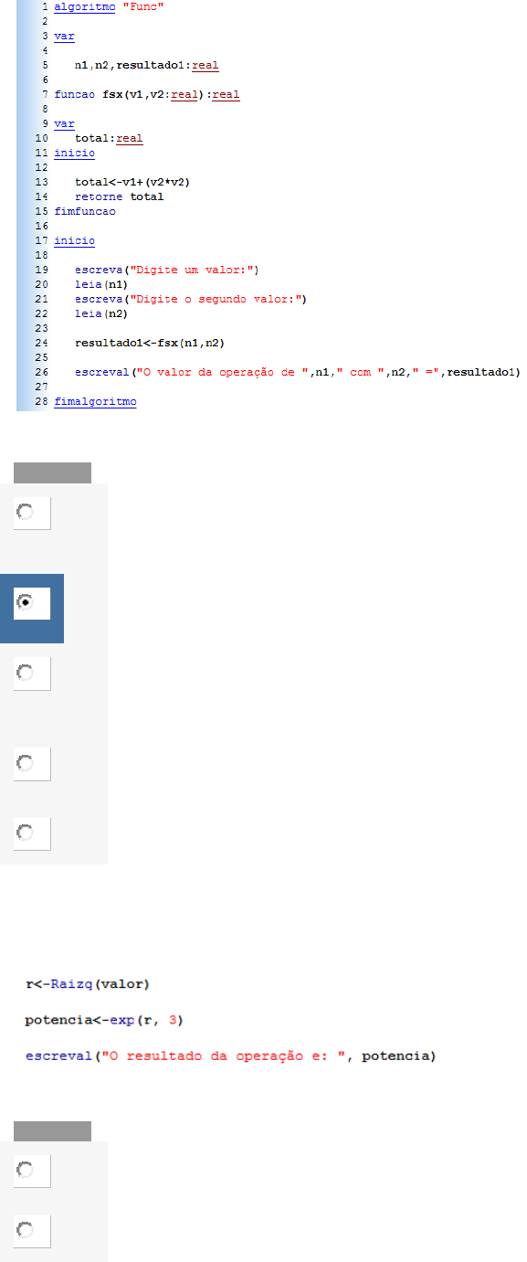 Questão 1/5 - Lógica de Programação e Algoritmos Na Aula 9 trabalhamos com o conceito de Funções. Funções servem como um artifício de modularização do seu código. O algoritmo acima mostra um psedocódigo que contém uma função. Assinale a alternativa que descreve o funcionamento desta função. Nota: 20.0 A A função calcula a soma dos quadrados dos valores. B A função calcula a soma do primeiro valor com o quadrado do segundo valor. Conteúdo abordado nas aulas 7, 8, 9 e 10. C A função calcula a soma do quadrado do primeiro valor pelo segundo valor. D A função calcula o quadrado das somas dos valores. E A função calcula a razao dos quadrados dos valores. Questão 2/5 - Lógica de Programação e Algoritmos Nas Aula 9 e 10 trabalhamos com a criação de funções em psedocódigo bem como com diferentes funções já prontas no VISUALG. Observe o fragmento de código que temos acima. Qual seria o resultado da variável potencia quando atribuímos o número 16 para a variável de nome valor. Nota: 20.0 A 4 B 16 C 0 D 64 Conteúdo abordado nas aulas 9 e 10. E Este código não pode ser executado pois a função Raizq não é pré-definida pelo VISUALG. Questão 3/5 - Lógica de Programação e Algoritmos Observe o recorte de código abaixo. Este código realiza o cadastro de diversos dados de pessoas: nome, idade, sexo e cargo em uma determinada empresa. Agora, assuma que você precisa fazer este cadastro dentro de uma FUNÇÃO. Assinale a alternativa que contém a sintaxe correta da função criada para este caso específico. Nota: 20.0 A B C D E Correta! Questão 4/5 - Lógica de Programação e Algoritmos Na AULA 9 trabalhamos com o conceito de procedimentos e funções. Acerca deste assunto, responda: procedimentos e funções tem a mesma finalidade em um algoritmo? Nota:20.0 A Não. Função obrigatoriamente retorna um valor, já um procedimento não retorna um valor, apenas executa uma ação. Conteúdo abordado nas aulas 09 e 10. B Sim. Possuem a mesma finalidade e ambos retornam um valor. C Não, pois a Função executa uma única ação e procedimento executa uma ação e retorna um valor. D Sim, Funções e procedimentos são apenas sub-rotinas. E Sim. Possuem a mesma finalidade e ambos não apresentam retorno. Questão 5/5 - Lógica de Programação e Algoritmos Nas aulas 9 e 10 trabalhamos com o conceito de funções pré-definidas. O algoritmo abaixo mostra o código que funciona da seguinte forma: o usuário digita uma palavra e uma letra qualquer e o programa retorna (através da função pré-definida Pos) a posição daquela letra escolhida na palavra. Assinale a alternativa que explica exatamente o que acontece com o programa caso o usuário digite a palavra ARARA e escolha a letra A. Nota: 20.0 A Neste caso a variável Posicao irá armazenar somente a posição da primeira ocorrência da letra A na palavra ARARA, não identificando todas as 3 ocorrências da mesma. Conforme a imagem abaixo, a variável Posicao armazenou somente a posição da primeira vez que a letra A apareceu na palavra ARARA. B Neste caso a variável Posicao irá armazenar somente a posição da última ocorrência da letra A na palavra ARARA, não identificando todas as 3 ocorrências da mesma. C Neste caso a variável Posicao irá armazenar todas as 3 ocorrências da letra A na palavra ARARA. D Neste caso o programa dará um erro no VISUALG, não permitindo a execução do programa. E Neste caso a variável Posicao irá armazenar o valor ZERO, pois existem 3 ocorrências da letra A na palavra ARARA.