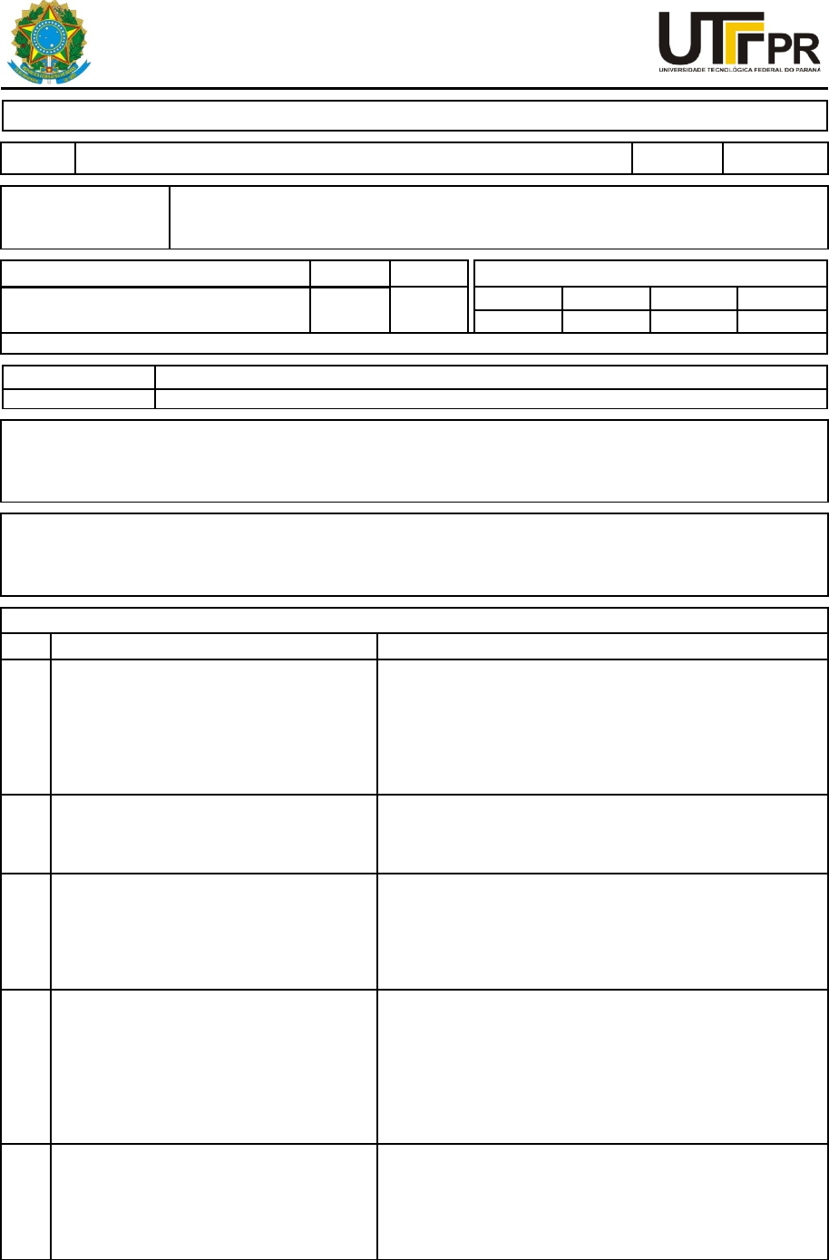 Ministério da Educação UNIVERSIDADE TECNOLÓGICA FEDERAL DO PARANÁ Campus Pato Branco PLANO DE ENSINO CURSO DE AGRONOMIA MATRIZ 468 FUNDAMENTAÇÃO LEGAL O Curso de Agronomia foi autorizado pelo CEE 110/09 em 28/01/1992 publicado no DOU em 29/01/1992. Reconhecido em 16/06/1997 pela Portaria 712 do MEC publicada no DOU 113 em 17/06/1997 DISCIPLINA/UNIDADE CURRICULAR CÓDIGO PERÍODO CARGA HORÁRIA (horas) Fisiologia de Plantas Cultivadas FP32G 2 AT AP APS Total 126 18 08 152 AT: Atividades Teóricas, AP: Atividades Práticas, APS: Atividade Prática Supervisionada. PRÉ-REQUISITO EQUIVALÊNCIA OBJETIVOS Permitir ao estudante, através de aulas teóricas e práticas, a aquisição de conhecimentos básicos de fisiologia vegetal, indispensáveis para compreender as disciplinas relacionadas com o manejo das culturas, no curso de agronomia. EMENTA Relações hídricas. Ecofisiologia da fotossíntese e respiração. Translocação de solutos orgânicos. Absorção, transporte e função de íons minerais. Diagnose foliar. Regulação do desenvolvimento vegetal. Fisiologia de compostos secundários e defesa vegetal. Fisiologia do estresse. CONTEÚDO PROGRAMÁTICO ITEM EMENTA CONTEÚDO 1 Relações hídricas Propriedades físicas e químicas da água; Componentes do potencial hídrico (Ψw). Métodos de determinação do Ψw; Mecanismos de absorção, transporte e perda de água nas plantas; Fisiologia dos estômatos e transpiração; Mecanismos de resistência/tolerância ao estresse hídrico. 2 Ecofisiologia da fotossíntese e respiração Metabolismo do carbono; Trocas gasosas nas plantas; A economia do carbono na planta; Fatores que afetam a fotossíntese. 3 Translocação de solutos orgânicos. Terminologias usuais (fonte, dreno ou destino, partição, remobilização, etc.); Substâncias transportadas; Anatomia do floema; Mecanismos de transporte no xilema e no floema; Partição de assimilados. 4 Absorção, transporte e função de íons minerais. Critérios de essencialidade; Funções dos nutrientes minerais; Absorção e transporte de íons minerais; Fatores que afetam a absorção e transporte dos sais minerais. Sintomas de deficiência nutricional; Absorção foliar de íons minerais. Diagnose foliar. 5 Regulação do desenvolvimento vegetal. Principais grupos de hormônios vegetais e suas funções nas plantas: crescimento e diferenciação; dominância apical; tro- pismos; juvenilidade; vernalização; fotoperiodismo e flora- ção; senescência e abscisão; dormência e germinação; fisio- logia pós-colheita. Uso dos hormônios vegetais/reguladores de crescimento na agricultura. 6 Fisiologia de compostos secundários e defesa vegetal. Terpenos, fenóis e compostos nitrogenados; Função dos compostos secundários; 7 Fisiologia do estresse. Conceito de estresse; Estresse hídrico (deficiência hídrica/inundação); Estresse por baixa temperatura (resfriamento/conjelamento) Estresse por temperaturas altas; Estresse salino. PROCEDIMENTOS DE ENSINO AULAS TEÓRICAS Aula expositiva, trabalho individual, trabalho em grupo, pesquisa, seminário, visita técnica. AULAS PRÁTICAS As aulas práticas serão conduzidas em laboratório ou em campo. As referidas práticas poderão eventualmente serem substituídas, conforme necessidade. PROCEDIMENTOS DE AVALIAÇÃO A avaliação será realizada ao final de cada capítulo, sempre garantindo uma nota no bimestre, através de provas e seminários e atividades práticas. REFERÊNCIAS Referencias Básicas: TAIZ, L.; ZEIGER, E. Fisiologia Vegetal. 3a edição, Porto Alegre: Artmed Editora, 2004. 719p. KERBAUY, G.B., 2004. Fisiologia Vegetal. 1a edição, Rio de Janeiro: Guanabara Koogan, 2004. 452p. LARCHER, W. Ecofisiologia Vegetal. São Carlos: Rima Artes e Textos, 2000. 531p. Referências Complementares: ABELES, F.B.; MORGAN,P.W.; SALTVEIT, M.E. Ethylene in Plant biology. London: Academic Press, 1992. 414p. ANGELOCCI, L.R. Água na planta e trocas gasosas/energéticas com a atmosfera: introdução ao tratamento biofísico. Piracicaba, São Paulo, 2002. 272p. BOYER, J.S. Measuring the Water Status of plants and soils. San Diego: Academic Press, 1995. 178p. BRACHT, A.; ISHII-IWAMOTTO, E.L., 2003. Métodos de laboratório em Bioquímica. 1ª edição, São paulo: Editora Manole, 439p. BUCHANAN, B.; WILHELM GRUISSEM, W.; JONES, R.L. Biochemistry & Molecular Biology of Plants. American Society of Plant Physiologists, 2000. 1200p. COLLINS, C.H., BRAGA, G.L. e BONATO,P.S. 1995. Introdução a métodos cromatográficos, 6ª ed., Editora da UNICAMP, Campinas, 300p. CONN, E.E., STUMPF, P.K., 1980. Introdução à bioquímica. Editora Edgar Blücher, São Paulo, 525p. CONTREIRAS, J., 1992. Fisiologia e bioquímica da respiração das plantas superiores. Fundação Calouste Gulbenkian, Lisboa, 312p. DE ROBERTIS, E.D.P; DE ROBERTIS, E.M.F. Bases da biologia celular e molecular. 2edição, Rio de Janeiro: Guanabara Koogan, 1993. 307p. DEY, P.M. & HARBORNE, J.B., 1997. Plant Biochemistry. Academic Press, London, 554p. DÍAS, M.S.; TEJO, P.A. ; CALVO, J.I. Practicas de Fisiologia Vegetal. Pamplona: EUNSA, 1980. 105p. FOWDEN, L.; MANSFIELD, T.; STODDART, J. Plant adaptation to environmental stress. 5th ed. London: Chapman & Hall, 1996. 346p. GOODWIN, T.W., MERCER, E.I., 1985. Introduction to Plant biochemistry. 2nd. Edition, Pergamon Press, 677p. GRAWLEY, M.J. Plant Ecology. 2nd ed. Malden: Blackwell Science Ltd., 2002. 717p. HALL, D.O.; RAO, K.K., 1995. Photosynthesis. 5th ed., Cambridge: University Press, 211p. HARBORNE, J.B., 1993. Introduction to Ecological Biochemistry. 4rd Edition, Academic Press, London, 316p. HOPKINS, W.G. 1999. Introduction to plant physiology. New York: John Wiley & Sons, 512p. JUNQUEIRA, L.C.; CARNEIRO, J. Biologia celular e molecular. 5ed. Rio de Janeiro: Guanabara Koogan, 1991. 260p. KARSSEN, C.M.; VAN LOON, L.C.; VREUGDENHIL, D. Progress in plant growth regulation. London: Kluwer Academic Publishers, 1992. 963p. KLAR, A.E. Ág