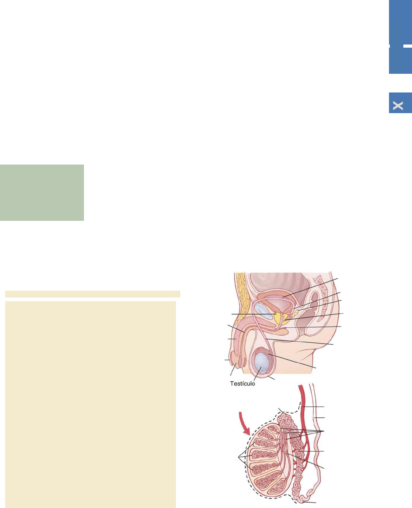 C A P Í T U L O 8 0 Funções Reprodutivas e Hormonais Masculinas (e Função da Glândula Pineal) As funções reprodutoras masculinas podem ser divididas em três grandes subdivisões: (1) espermatogênese que significa a formação do espermatozóide; (2) desempenho do ato sexual masculino; e (3) regulação das funções reprodutoras masculinas por vários hormônios. Associados a essas funções reprodutoras estão os efeitos dos hormônios sexuais masculinos sobre os órgãos sexuais acessórios, metabolismo celular, crescimento e outras funções do organismo. Anatomia Fisiológica dos Órgãos Sexuais Masculinos A Figura 80-IA mostra as várias partes do sistema reprodutor masculino, e a Figura 80-15 apresenta a estrutura detalhada do testículo e do epidídimo. O testículo é composto por até 900 túbulos seminíferos convolutos, onde é formado o esperma; cada um tem, em média, mais de 1 metro de comprimento. O esperma, então, é lançado no epidídimo, outro tubo convoluto de, aproximadamente, 6 metros de comprimento. O epidídimo conduz ao canal deferente, que se alarga na ampola do canal deferente, imediatamente antes do canal entrar no corpo da glândula prostática. Duas vesículas seminais, uma de cada lado da próstata, desembocam na terminação prostática da ampola e os conteúdos da ampola e das vesículas seminais passam para o dueto ejaculatório e são conduzidos, através do corpo da glândula prostática, e, então, desaguando na uretra interna. Os duetos prostáticos recebem o conteúdo da glândula prostática e o conduzem para o dueto ejaculatório e, daí, para a uretra prostática. Finalmente, a uretra é o último elo de conexão dos testículos com o exterior. A uretra contém muco proveniente de grande número de pequenas glândulas uretrais, localizadas em toda sua extensão e, em maior quantidade, das glândulas bulbouretrais (glândulas de Cowper) localizadas próximas da origem da uretra. Espermatogênese Durante a formação do embrião, as células germinativas primordiais migram para os testículos e tornam-se célu las germinativas imaturas, chamadas de espermatogônias que se situam em duas ou três camadas das superfícies internas dos túbulos seminíferos (na Fig. 80-2A é mostrado corte transversal dos mesmos). As espermatogônias passam divisões mitóticas, na puberdade, proliferando e se diferenciando continuamente pelos estágios definidos do desenvolvimento para formar o esperma, como mostrado na Figura 80-25. Túbulos seminíferos Corpo do epidídim o Rete testis Cauda do epidídimo Próstata Uretra Tecido erétil Bexiçja urinaria Ampola Vesícula seminal Dueto ejaculatório G lândula bulbouretral Canal deferente Epidídimo Saco escrotal Cabeça do epidídimo Artéria testicular Canal deferente Duetos eferentes Prepúcio Glande do A Pênis Figura 80-1 A, Sistema reprodutor masculino. (Modificada de BloomV, Fawcett DW:Textbookof Histology, 10th ed. Philadelphia: WB Saunders Co, 1975.) B, Estrutura interna do testículo e relação entre o testículo e o epidídimo. (Redesenhada de Guyton AC: Anatomy and Physiology. Philadelphia: Saunders College Pu- blishing, 1985.) 1025 U N I D A Unidade XIV Endocrinologia e Reprodução Figura 80-2 A, Secção transversal de um túbulo seminífero. B, Estágios de desenvolvimento dos espermatozóides das esperma- togônias. Estágios da Espermatogênese A espermatogênese ocorre nos túbulos seminíferos durante a vida sexual ativa, como resultado da estimulação pelos hormônios gonadotrópicos da glândula hipó- fise anterior, começando, aproximadamente, aos 13 anos de idade e continuando pela maior parte do restante da vida, mas se reduzindo acentuadamente na velhice. No primeiro estágio da espermatogênese, as esperma- togônias migram entre as células de Sertoli em direção ao lúmen central dos túbulos seminíferos. As células de Sertoli são grandes, com envoltório citoplasmático exuberante que envolve a espermatogônia em desenvolvimento, durante todo o trajeto até o lúmen central do túbulo. Meiose. A espermatogônia que cruza a barreira até a camada das células de Sertoli é progressivamente modificada e alargada, para formar os grandes espermatócitos primários (Fig. 80-3). Cada um deles, por sua vez, passa por divisão meiótica para formar dois espermatócitos secundários. Poucos dias depois, estes também se dividem formando espermátides que são, eventualmente, modificadas transformando-se em espermatozóides (esperma). Nascimento 12-14 anos Puberdade Entra no I testículoy Célula germinativa primordial Espermatogônia A espermatogônia prolifera-se por divisão celular mitótica nos testículos Espermatócit o primário 9 dias < 1 Divisão meiótica I Espermatócitos secundários Divisão meiótica II 1 Espermátides ^Diferenciação Espermatozóide maduro Figura 80-3 Divisões celulares durante a espermatogênese. Ao longo do desenvolvimento embriônico, as células germinativas primordiais migram para o testículo, onde elas se tornam esper- matogônias. Na puberdade (geralmente entre 12 e 14 anos), as espermatogônias proliferam rapidamente por divisões mitóticas. Algumas iniciam a meiose para tornarem-se espermatócitos primários e continuam através da divisão meiótica I, tornando-se espermatócitos secundários. Após o término da divisão meiótica II, os espermatócitos secundários produzem as espermátides, que se diferenciam formando os espermatozóides. Durante as transformações do estágio de espermatócitos para o de espermátides, os 46 cromossomos (23 pares de cromossomos) do espermatócito se dividem, e então 23 cromossomos vão para uma espermátide e os outros 23 para a outra espermátide. Os genes cromossô- micos também se dividem e, assim, somente metade das características genéticas do possível feto é fornecida pelo pai, enquanto a outra metade provém do oócito fornecido pela mãe. 1026 Capítulo 80 Funções Reprodutivas 