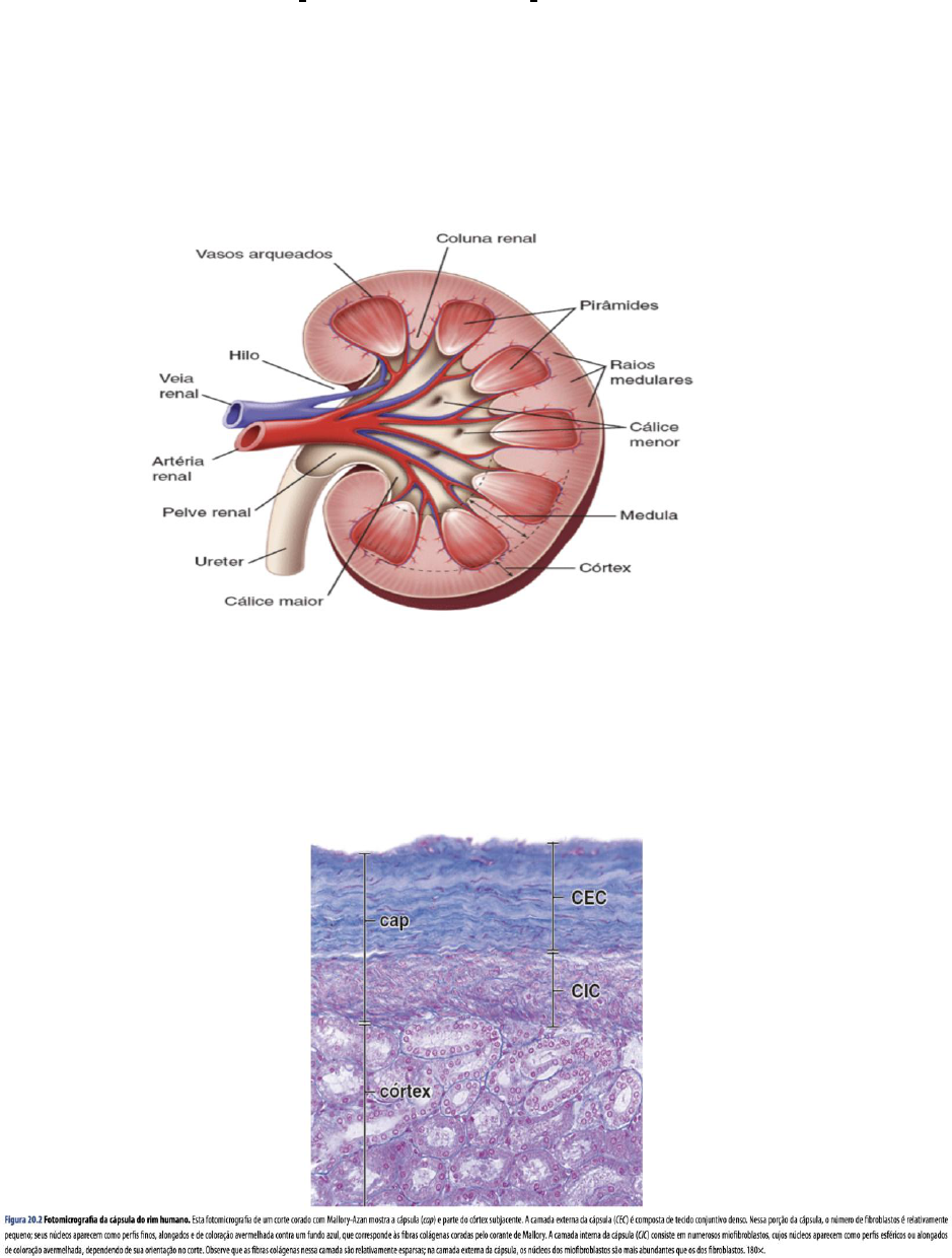 Estrutura geral do rim normal > Introdução Os rins são órgãos pares grandes e avermelhados, em formato de feijão, localizados lateralmente à coluna vertebral, no espaço retroperitoneal da cavidade posterior do abdome. Cada um deles estende-se da 12a vértebra torácica até a 3a vértebra lombar; o rim direito ocupa uma posição ligeiramente mais inferior. No polo superior de cada rim, inserida na fáscia renal e em uma camada protetora espessa de tecido adiposo perirrenal, encontra-se uma glândula suprarrenal. A borda medial do rim é côncava e contém uma fissura vertical profunda, denominada hilo, através do qual os vasos e os nervos renais passam. Do hilo também emerge a pelve renal, que é a porção expandida em formato de funil do ureter. Um corte realizado através do rim mostra a relação anatômica dessas estruturas, que se localizam imediatamente no hilo do rim, em um espaço denominado seio renal. Embora não mostrado nessa ilustração, o espaço entre e ao redor dessas estruturas é preenchido, em grande parte, com tecido conjuntivo frouxo e tecido adiposo. +Cápsula A superfície do rim é recoberta por uma cápsula de tecido conjuntivo. A cápsula consiste em duas camadas distintas: uma camada externa composta de fibroblastos e fibras colágenas e uma camada interna que contém miofibroblastos. A contratilidade dos miofibroblastos pode ajudar na resistência do órgão às variações de volume e de pressão que podem ocorrer durante as variações da função renal. A cápsula do rim penetra no hilo, no qual forma a cobertura de tecido conjuntivo do seio. A cápsula torna-se contínua com o tecido conjuntivo, formando as paredes dos cálices e da pelve renal. +Córtex e medula O exame a olho nu da face de corte de um rim fresco hemisseccionado mostra que ele é formado por duas regiões distintas: *O córtex, a parte externa castanho-avermelhada; *A medula, a parte interna de coloração muito clara. A coloração observada na porção mais externa do corte do rim não fixado reflete a distribuição do sangue no órgão. Aproximadamente 90 a 95% do sangue que passa pelos rins encontram-se no córtex, enquanto apenas 5 a 10% estão na medula. -O córtex caracteriza-se pela existência dos corpúsculos renais e seus túbulos associados O córtex consiste em corpúsculos renais, juntamente com os túbulos contorcidos e túbulos retos do néfron, túbulos conectores, ductos coletores e um extenso suprimento vascular. O néfron é a unidade funcional básica do rim e será descrito na seção a seguir. Os corpúsculos renais consistem em estruturas esféricas pouco visíveis a olho nu. Constituem o segmento inicial do néfron e contêm uma rede singular de capilares, denominada glomérulo. -A medula caracteriza-se por túbulos retos, ductos coletores e uma rede especial de capilares, os vasos retos Os túbulos retos dos néfrons e os ductos coletores partem do córtex para dentro da medula. Ambos são acompanhados de uma rede de capilares, os vasos retos, que seguem um percurso paralelo aos vários túbulos. Esses vasos representam a parte vascular do sistema de troca por contracorrente que regula a concentração da urina. Os túbulos na medula, em virtude de sua disposição e das diferenças de comprimento, formam, em conjunto, estruturas cônicas, denominadas pirâmides. O rim humano pode apresentar, em geral, 8 a 12 pirâmides, mas podem ser observadas até 18 pirâmides. As bases das pirâmides estão voltadas para o córtex, enquanto os ápices estão voltados para o seio renal. A porção apical de cada pirâmide, que é conhecida como papila, projeta-se dentro de um cálice menor, uma estrutura em formato de taça que representa uma extensão da pelve renal. A extremidade da papila, também conhecida como área cribriforme, é perfurada pelas aberturas dos ductos coletores. Os cálices menores são ramos de dois ou três cálices maiores, os quais, por sua vez, são divisões principais da pelve renal. Cada pirâmide é dividida em uma medula externa (adjacente ao córtex) e em uma medula interna. A medula externa é ainda subdividida em uma faixa interna e uma faixa externa. +Lobos e lóbulos renais -O número de lobos em um rim é igual ao número de pirâmides medulares Cada pirâmide medular e o tecido cortical associado à sua base e lados (metade de cada coluna renal adjacente) constituem um lobo do rim. A organização lobar do rim é evidente no rim fetal em desenvolvimento. Cada lobo é visto como uma convexidade na superfície externa do órgão; no entanto, esses lobos geralmente desaparecem depois do nascimento. -Um lóbulo consiste em um ducto coletor e no conjunto de néfrons drenados por ele. Os lobos do rim são ainda subdivididos em lóbulos, que consistem em um raio medular central e a córtex circundante. Embora o centro ou eixo de um lóbulo seja prontamente identificável, os limites entre lóbulos adjacentes não são nitidamente demarcados uns dos outros por septos de tecido conjuntivo. +Néfron O néfron é a unidade estrutural e funcional fundamental do rim. Ambos os rins humanos contêm aproximadamente 2 milhões de néfrons. Estes são responsáveis pela produção de urina e correspondem à porção secretora de outras glândulas. Os ductos coletores são responsáveis pela concentração final da urina e são análogos aos ductos das glândulas exócrinas, que também modificam a concentração do produto secretor. +Organização geral do néfron -O néfron consiste no corpúsculo renal e em um sistema de túbulos. Conforme assinalado anteriormente, o corpúsculo renal representa o início do néfron. É formado pelo glomérulo, um tufo de capilares composto de 10 a 20 alças capilares, circundado por um capuz epitelial de dupla camada, a cápsula renal ou de Bowman. A cápsula de Bowman é a porção inicial do néfron, em que o sangue que flui através dos capilares glomerulares sofre filtração, produzindo o ultrafiltra