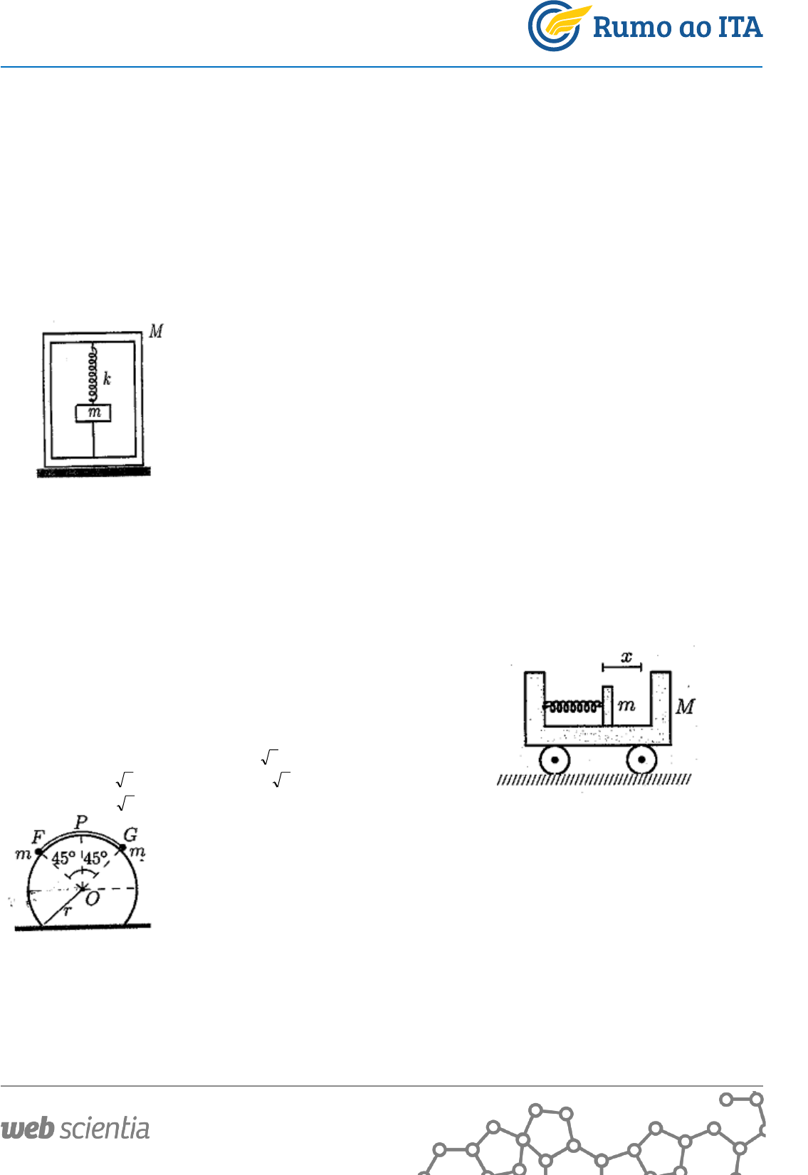1 Prova de Dinâmica – ITA 1 - (ITA-13) No interior de uma caixa da massa M, apoiada num piso horizontal, encontra-se fixada numa mola de constante elástica k presa a um corpo de massa m, em equilíbrio na vertical. Conforme a figura, este corpo também se encontra preso a um fio tracionado, de massa desprezível, fixado à caixa, de modo que resulte uma deformação b da mola. Considere que a mola e o fio se encontram no eixo vertical de simetria da caixa. Após o rompimento do fio, a caixa vai perder contato com o piso se a) b > (M + m)g/k b) b > (M + 2m)g/k c) b > (M - m)g/k d) b > (2M - m)g/k e) b > (M - 2m)g/k 2 - (ITA-13) Uma corda, de massa desprezível, tem fixada uma de suas extremidades, F e G, uma partícula de massa m. Esse sistema encontra-se em equilíbrio apoiado numa superfície cilíndrica sem atrito, de raio r, abrangendo um ângulo de 90º e simetricamente disposto em relação ao ápice P do cilindro, conforme mostra a figura. Se a corda for levemente deslocada e começa a escorregar no sentido anti-horário, o ângulo FÔP em que a partícula na extremidade F perde contato com a superfície é tal que a) 2cos = 1 b) 2cos - sen = 2 c) 2sen + cos = d) 2cos + sen = e) 2cos + sen = /2 3 - (ITA-13) Uma rampa maciça de 120 Kg inicialmente em repouso, apoiada sobre um plano horizontal, tem sua declividade dada por tan θ = 3/4. Um corpo de 80 Kg desliza nessa rampa a partir do repouso, nela percorrendo 15 m até alcançar o piso. No final desse percurso, e desconsiderando qualquer tipo de atrito, a velocidade da rampa em relação ao piso é de aproximadamente a) 1 m / s b) 3 m / s c) 5 m / s d) 2 m / s e) 4 m / s 4 - (ITA-12) Um elevador sobe verticalmente com aceleração constante e igual a a. No seu teto está preso um conjunto de dois sistemas massa-mola acoplados em série, conforme a figura. O primeiro tem massa m1 e constante de mola k1, e o segundo massa m2 e constante de mola k2. Ambas as molas têm o mesmo comprimento natural (sem deformação) ℓ. Na condição de equilíbrio estático relativo ao elevador, a deformação da mola de constante k1 é y, e a da outra, x. Pode-se então afirmar que (y – x) é A. ( ) [(k2 – k1)m2 + k2m1](g – a) ⁄ k1k2. B. ( ) [(k2 + k1)m2 + k2m1](g – a) ⁄ k1k2. C. ( ) [(k2 – k1)m2 + k2m1](g + a) ⁄ k1k2. D. ( ) [(k2 + k1)m2 + k2m1](g + a) ⁄ k1k2 – 2ℓ. E. ( ) [(k2 – k1)m2 + k2m1](g + a) ⁄ k1k2 + 2ℓ. 5 - (ITA-12) No interior de um carrinho de massa M, mantido em repouso, uma mola de constante elástica k encontra-se comprimida de uma distancia x, tendo uma extremidade presa e a outra conectada a um bloco de massa m, conforme a figura. Sendo o sistema então abandonado e considerando que não há atrito, pode-se afirmar que o valor inicial da aceleração do bloco relativa ao carrinho é a) kx/m b) kx/M c) kx/(m + M) d) kx (M - m)/Mm e) kx (M + m)/Mm 6 - (ITA-11) Um cubo maciço homogêneo com 4,0 cm de aresta flutua na água tranqüila de uma lagoa, de modo a manter 70% da área total de sua superfície em contato com a água, conforme mostra a figura. 2 2 2 2 A seguir, uma pequena rã se acomoda no centro da face superior do cubo e este se afunda mais 0,50 cm na água. Assinale a opção com os valores aproximados da densidade do cubo e da massa da rã, respectivamente. a) 0,20 g/cm3 e 6,4 g b) 0,70 g/cm3 e 6,4 g c) 0,70 g/cm3 e 8,0 g d) 0,80 g/cm3 e 6,4 g e) 0,80 g/cm3 e 8,0 g 7 - (ITA-11) Uma pessoa de 80,0 kg deixa-se cair verticalmente de uma ponte amarrada a uma corda elástica de “bungee jumping” com 16,0 m de comprimento. Considere que a corda se esticará até 20,0 m de comprimento sob a ação do peso. Suponha que, em todo o trajeto, a pessoa toque continuamente uma vuvuzela, cuja freqüência natural é de 235 Hz. Qual(is) é(são) a(s) distância(s) abaixo da ponte em que a pessoa se encontra para que um som de 225 Hz seja percebido por alguém parado sobre a ponte? a) 11,4 m b) 11,4 m e 14,4 m c) 11,4 m e 18,4 m d) 14,4 m e 18,4 m e) 11,4 m, 14,4 m e 18,4 m 8 - (ITA-11) Sobre uma mesa sem atrito, uma bola de massa M é presa por duas molas alinhadas, de constante de mola k e comprimento natural 0 , fixadas nas extremidades da mesa. Então, a bola é deslocada a uma distância x na direção perpendicular à linha inicial das molas, como mostra a figura, sendo solta a seguir. Obtenha a aceleração da bola, usando a aproximação 1 1a a . a) a = – kx b) a = – kx2/M 0 c) a = – kx2/2M 0 d) a = – kx3/2M 2 0 e) a = – kx3/M 2 0 9 - (ITA-11) Duas partículas idênticas, de mesma massa m, são projetadas de uma origem O comum, num plano vertical, com velocidades iniciais de mesmo módulo v0 e ângulos de lançamento respectivamente e em relação à horizontal. Considere T1 e T2 os respectivos tempos de alcance do ponto mais alto de cada trajetória e t1 e t2 os respectivos tempos para as partículas alcançar um ponto comum de ambas as trajetórias. Assinale a opção com o valor da expressão t1T1+t2T2. a) 2 2 0 2 ( ) /tg tg g b) 2 2 0 2 / g c) 2 2 0 4 /sen g d) 2 2 0 4 /sen g e) 2 2 0 2 ( ) /sen sen g 10 - (ITA-11) Um exercício sobre a dinâmica da partícula tem seu início assim anunciado: Uma partícula está se movendo com uma aceleração cujo módulo é dado por 3 2( / )r a r , sendo r a distância entre a origem e a partícula. Considere que a partícula foi lançada a partir de uma distância a com uma velocidade inicial 2 a . Existe algum erro conceitual nesse anunciado? Por que razão? a) Não, porque a expressão para a velocidade é consistente com a da aceleração; b) Sim, porque a expressão correta para a velocidade seria 22a ; c) Sim, porque a expressão correta para a velocidade seria 22 /a r ; d) Sim, porque a expressão correta para a velocidade seria 22 /a r ; e) Sim, porque a expressão correta para a velocidade seria 2a ; 11 - (ITA-10) Um quadro quadrado de lado e massa m, feito de um material de coeficiente de dilatação superficial , é pendurado no pino O