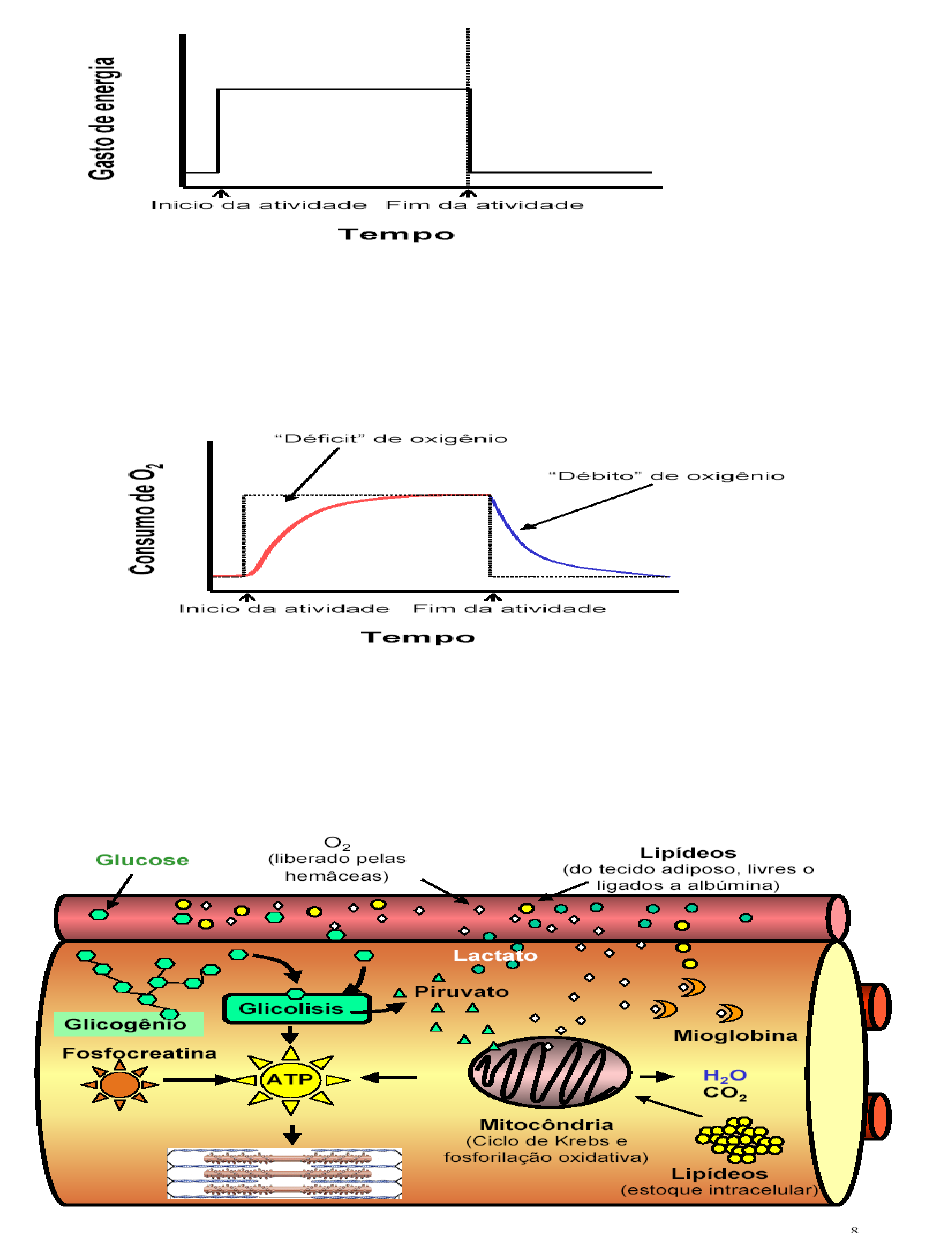 1) Explique o gráfico abaixo de acordo com os seus conhecimentos de Bioquímica. Condição Aeróbica, com a presença de O, a respiração celular está ocorrendo normalmente, sendo assim, a concentração de ATP esta regulada. 2) Explique o gráfico abaixo de acordo com os seus conhecimentos em Bioquímica. Condição Anaeróbica, sem a presença de O, no início da atividade física ocorre o déficit de O até que a fermentação láctica ocorra e estabilize a concentração de ATP, após a atividade física ocorre um debito de O pois a fermentação estava acontecendo rapidamente. 3) Explique a figura acima Ocorre a fermentação láctica, 4) A glicólise produz 2 ATP através de uma série de 10 reações enzimáticas. Por que alguns processos metabólicos precisam ser longos para produzir energia. Porque é necessário quebrar a molécula 5) Qual a importância da fermentação lática nos animais. A fermentação lática é importante pois em condição anaeróbica, ou seja, falta de O na célula, para que a glicólise não pare, pois ela regenera o NAD+ necessário na glicólise a partir do NADH pela redução do piruvato a lactato. 6) Fale sobre a regulação da glicólise e do ciclo de Krebs. 7) Discurse sobre o processo de obtenção de energia a partir de NADH e FADH2. 8) Comente a frase. “A cadeia respiratória pode operar independente da fosforilação oxidativa”. 9) Explique o ciclo de Cori e sua função no metabolismo. É a reciclagem do lactado produzido pela célula do musculo, que é transportado pelo sangue para o fígado onde é convertido em glicose, através da gliconeogênese. 10) Qual o papel do dinitrofenol (substância usada antigamente para emagrecimento)? E por que, ele é considerado uma substância tóxica? 11) Em que situação você acha que o consumo de glicose é maior, em uma atividade física com ou sem oxigênio. Justifique. Sem oxigênio, condição anaeróbica, pois apenas a glicólise estará acontecendo e ela produz apenas 2 ATPs, com isso, para produzir a mesma quantidade de ATP que a respiração celular será consumida cerca de 15 vezes mais glicose. 12) Qual a diferença em relação a função do glicogênio hepático e muscular. 13) Explique a regulação pelos hormônios glucagon e insulina na glicogênese e glicogenólise. Explique a situação metabólica em que cada hormônio é secretado pelo pâncreas.