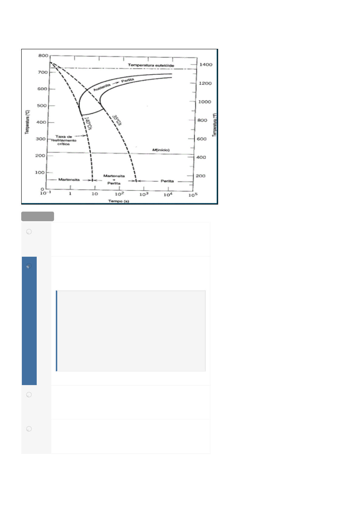 30/06/2018 AVA UNIVIRTUS http://univirtus.uninter.com/ava/web/#/ava/AvaliacaoUsuarioHistorico/266769/novo/1/42724 1/7 Questão 1/5 - Tecnologia dos Materiais Com base nas curvas TTT e CCT apresentadas abaixo, temos que: Nota: 20.0 A Uma velocidade de resfriamento superior a 140°C/s irá gerar uma estrutura final composta por Martensita e Perlita. B Um tempo de resfriamento de 750°C até a temperatura ambiente de 1000 s leva a uma estrutura composta por Perlita. C Uma velocidade de resfriamento entre 140°C/s e 35°C/s leva a uma estrutura composta por Perlita. D Um tempo de resfriamento de 750°C até a temperatura ambiente de 10 s leva a uma estrutura composta por Martensita. Você acertou! Conforme TEMA 5 Diagramas TTT , CCT e Tratamentos Térmicos e Termoquímicos das Ligas Ferrosas: O tempo de resfriamento de 750°C até a temperatura ambiente de 1000 s leva a uma estrutura composta por Perlita. 30/06/2018 AVA UNIVIRTUS http://univirtus.uninter.com/ava/web/#/ava/AvaliacaoUsuarioHistorico/266769/novo/1/42724 2/7 Questão 2/5 - Tecnologia dos Materiais Curvas CCT (Transformações a Resfriamento Contínuo) são curvas que se inserem nas curvas TTT, representando transformações de fases para meios com diversas velocidades de resfriamento. Quanto maior o ângulo de inclinação da curva CCT, mais lento é o resfriamento. Nas curvas CCT se inserem duas novas fases que só ocorrem nas ligas ferrosas devido a choques térmicos nas estruturas cristalinas, que são a bainita e a martensita. Com relação a estas fases: Nota: 20.0 A São fases dúcteis e de alta maleabilidade e resistência ao impacto. Bainita é a estrutura formada por um resfriamento rápido, de tal forma que parte dos cristais cúbicos da perlita sofrem deformação, passando de cúbicas para hexagonais compactas. A martensita é uma estrutura na qual há uma total clivagem da estrutura cristalina da perlita, que passa totalmente de cúbica para hexagonal compacta. B São fases duras e de baixa maleabilidade e resistência ao impacto. Bainita é a estrutura formada por um resfriamento rápido, de tal forma que parte dos cristais cúbicos da perlita sofrem deformação, passando de cúbicas para hexagonais compactas. A martensita é uma estrutura na qual há uma total clivagem da estrutura cristalina da perlita, que passa totalmente de cúbica para hexagonal compacta. C Você acertou! Conforme Tema 5 da Aula 1: São fases duras e de baixa maleabilidade e resistência ao impacto. Bainita é a estrutura formada por um resfriamento rápido, de tal forma que parte dos cristais cúbicos da perlita sofrem deformação, passando de cúbicas para hexagonais compactas. A martensita é uma estrutura na qual há uma total clivagem da estrutura cristalina da perlita, que passa totalmente de cúbica para hexagonal compacta. 30/06/2018 AVA UNIVIRTUS http://univirtus.uninter.com/ava/web/#/ava/AvaliacaoUsuarioHistorico/266769/novo/1/42724 3/7 São fases duras e de baixa maleabilidade e resistência ao impacto. Bainita é a estrutura formada por um resfriamento rápido, de tal forma há uma total clivagem da estrutura cristalina da perlita, passando de cúbicas para hexagonais compactas. A martensita é uma estrutura na qual que parte dos cristais cúbicos da perlita sofrem deformação, passando de cúbica para hexagonal compacta. D São fases dúcteis e de alta maleabilidade e resistência ao impacto. Bainita é a estrutura formada por um resfriamento rápido, de tal forma há uma total clivagem da estrutura cristalina da perlita, passando de cúbicas para hexagonais compactas. A martensita é uma estrutura na qual que parte dos cristais cúbicos da perlita sofrem deformação, passando de cúbica para hexagonal compacta. Questão 3/5 - Tecnologia dos Materiais Ligas de zinco, alumínio e cobre, são conhecidas como ZAMAC , e são ligas para fundição sob pressão. Podem conter também magnésio. Estas ligas possuem ponto de fusão em torno de 385ºC, boas propriedades mecânicas, boa usinabilidade. Podem ser niquelados e cromados, bem como permitem boa aderência de pinturas e vernizes em sua superfície. Tomando como base os dados da tabela abaixo, qual a liga ZAMAC mais adequada para uma aplicação que não permita uma deformação plástica. 30/06/2018 AVA UNIVIRTUS http://univirtus.uninter.com/ava/web/#/ava/AvaliacaoUsuarioHistorico/266769/novo/1/42724 4/7 Nota: 20.0 A Será a ZAMAC 3, pois terá um alongamento de 5-8%, que é maior se comparado com o da ZAMAC 5, que é de 3-6%. B Será a ZAMAC 3, pois terá um limite de elasticidade de 8500 kgf/mm , que é menor se comparado com o da ZAMAC 5, que é de 9600 kgf/mm . C Será a ZAMAC 5, pois terá um limite de elasticidade de 9600 kgf/mm , que é maior se comparado com o da ZAMAC 3, que é de 8500 kgf/mm . 2 2 2 2 Você acertou! Conforme Aula 2 TEMA 5. Ligas de Zinco. Será a ZAMAC 5, pois terá um limite de elasticidade de 9600 kgf/mm , que é maior se comparado com o da ZAMAC 3, que é de 8500 kgf/mm . 2 2 30/06/2018 AVA UNIVIRTUS http://univirtus.uninter.com/ava/web/#/ava/AvaliacaoUsuarioHistorico/266769/novo/1/42724 5/7 D Será a ZAMAC 5, pois terá um alongamento de 3-6%, que é menor se comparado com o da ZAMAC 3, que é de 5-8%. Questão 4/5 - Tecnologia dos Materiais Usando o diagrama de fases abaixo, lembrando que o teor mínimo de carbono na liga é de 0,005%C, determinar a procentagem de fases do aço do tipo ASTM 1037. Nota: 20.0 A 68% de ferrita e 32% de perlita B 52% de ferrita e 48% de perlita Você acertou! TEMA 4 Defeitos e Diagramas de Fases das Ligas Ferrosas Aplicando a regra da alavanca para aços hipoeutetóides temos 52% de ferrita e 48% de Perlita 30/06/2018 AVA UNIVIRTUS http://univirtus.uninter.com/ava/web/#/ava/AvaliacaoUsuarioHistorico/266769/novo/1/42724 6/7 C 32% de ferrita e 68% de perlita D 48% de ferrita e 52% de perlita Questão 5/5 - Tecnologia dos Materiais O melhor tratamento térmico para ligas de alumínio - cobre é o envelhecimento por pre
