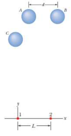1. Na Figura, três esferas condutoras iguais possuem inicialmente as seguintes cargas: esfera 𝐴, 4𝑄; esfera 𝐵, – 6𝑄; esfera 𝐶, 0. As esferas 𝐴 e 𝐵 são mantidas fixas, a uma distância entre os centros que é muito maior que o raio das esferas. Dois experimentos são executados. No experimento 1, a esfera 𝐶 é colocada em contato com a esfera 𝐴, depois (separadamente) com a esfera 𝐵 e, finalmente, é removida. No experimento 2, que começa com os mesmos estados iniciais, a ordem é invertida: a esfera 𝐶 é colocada em contato com a esfera 𝐵, depois (separadamente) com a esfera 𝐴 e, finalmente, é removida. Qual é a razão entre a força eletrostática entre 𝐴 e 𝐵 no fim do experimento 2 e a força eletrostática entre 𝐴 e 𝐵 no fim do experimento 1? 2. Na Figura, a partícula 1, de carga +1,0 𝜇𝐶, e a partícula 2, de carga – 3,0 𝜇𝐶, são mantidas a uma distância 𝐿 = 10,0 𝑐𝑚 uma da outra, em um eixo 𝑥. Determine (a) a coordenada 𝑥 e (b) a coordenada 𝑦 de uma partícula 3 de carga desconhecida 𝑞3 para que a força total exercida sobre ela pelas partículas 1 e 2 seja nula. 3. Nos cristais de cloreto de césio, os íons de césio, 𝐶𝑠 +, estão nos oito vértices de um cubo, com um íon de cloro, 𝐶𝑙–, no centro (Figura). A aresta do cubo tem 0,40 𝑛𝑚. Os íons 𝐶𝑠 + possuem um elétron a menos (e, portanto, uma carga +𝑒) e os íons 𝐶𝑙– possuem um elétron a mais (e, portanto, uma carga – 𝑒). (a) Qual é o módulo da força eletrostática exercida sobre o íon 𝐶𝑙– pelos íons 𝐶𝑠 + situados nos vértices do cubo? (b) Se um dos íons 𝐶𝑠– está faltando, dizemos que o cristal possui um defeito; qual é o módulo da força eletrostática exercida sobre o íon 𝐶𝑙– pelos íons 𝐶𝑠 + restantes? 4. Na Figura, �⃗�1é a força sobre 𝑞 devida a 𝑞1, e �⃗�2 é a força sobre 𝑞 devida a outra carga 𝑞2. A força total sobre a carga 𝑞 é �⃗� e as cargas estão igualmente distantes umas das outras.(a) Se 𝑞 é uma carga positiva, qual é o sinal de 𝑞1? (b) Qual é a carga de maior magnitude, 𝑞1 ou 𝑞2? 5. Um elétron é liberado a partir do repouso em um campo elétrico uniforme, de módulo 2,00 × 104 N/C. Determine a aceleração do elétron. (Ignore os efeitos da gravitação.) 6. Uma placa de cobre, plana e fina, possui dimensões de 4 cm × 4 cm. Se uma carga de –10 μC é adicionada ao metal condutor, determine a distância média entre os elétrons sobre um dos lados da placa. 7. Em uma região do espaço bidimensional, existem três cargas fixa: +1 𝑚𝐶 em (0,0), −2 𝑚𝐶 em (17 𝑚𝑚, 5 𝑚𝑚) e +3 𝑚𝐶 em (−2 𝑚𝑚, 11 𝑚𝑚). Qual a força resultante sobre a carga de −2 𝑚𝐶?
