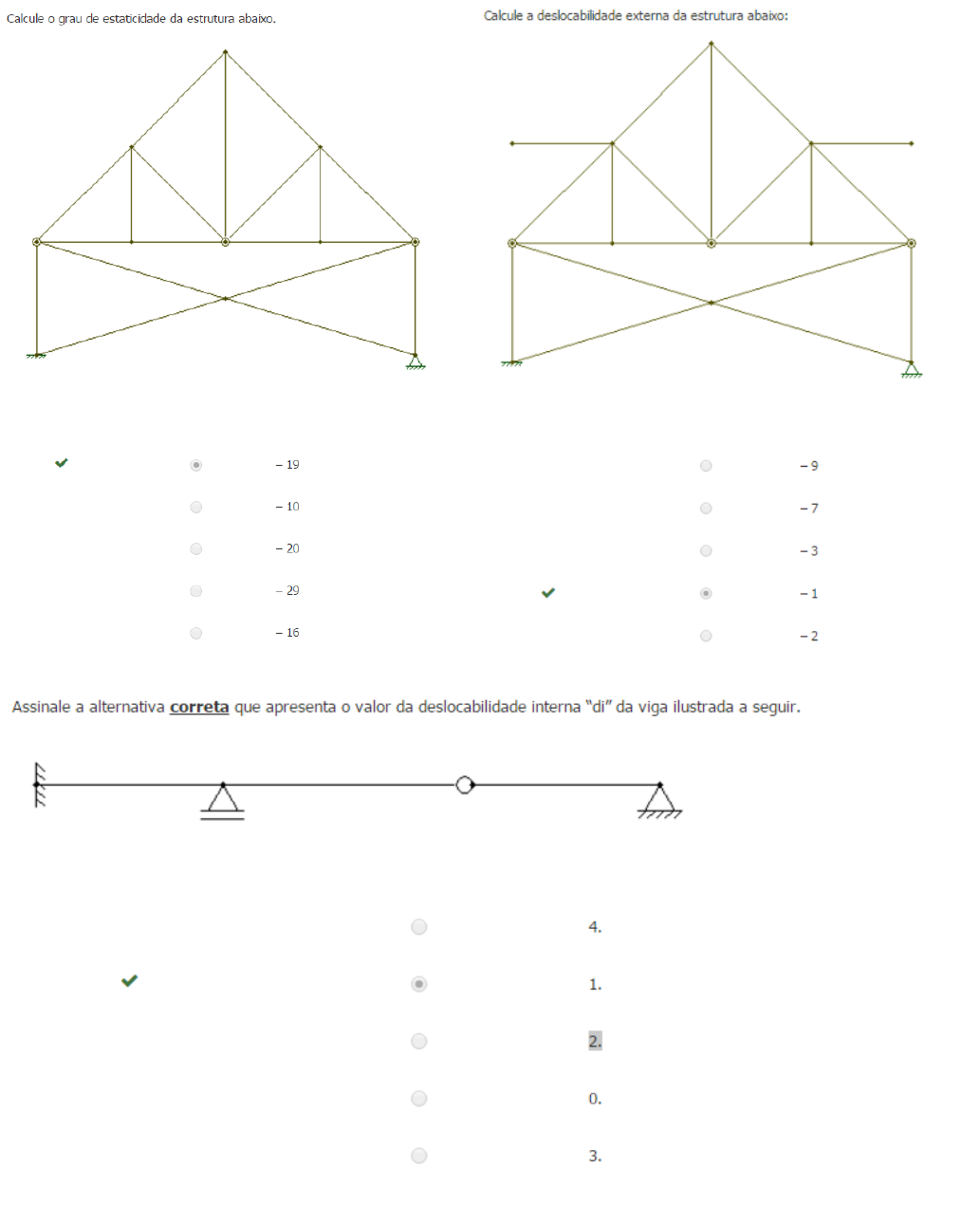 Teoria das estruturas 1º Semana Questão 1 Com base na estrutura representada abaixo, assinale a alternativa correta que apresenta o grau de deslocabilidade externa. 1. 4. 2. RESPOSTA CORRETA 0. 3. Questão 2 Com base na figura abaixo, assinale a alternativa CORRETA que apresenta o valor da deslocabilidade interna da estrutura. Di = 9 Di = 4 RESPOSTA CORRETA Di = 5 Di = 0 Di = 8 2º Semana Questão 2 Valor da questão: 1,00 sua pontuação é 1,00 Calcule o grau de estaticidade da estrutura esquematizada abaixo, 2 -1 0 1 -2 Com base na viga esquematizada determine as deslocabilidades interna e externa da mesma. Considere que a viga possui EI constante. di = 0 ; de = 2 di = 3 ; de = 1 di = 3 ; de = 0 di = 2 ; de = 0 di = 1 ; de = 3 Questão 2 Utilizando o método dos deslocamentos calcule o valor do cortante no meio do trecho AB, considerando o primeiro apoio como A o segundo B e o terceiro D, faça o desenvolvimento das equações, demonstrando como chegou nos resultados, sabe-se que EI é constante. 50 kN 35 kN 55 kN 37,5 kN 45 kN 3º Semana Questão 1 Valor da questão: 1,00 sua pontuação é 1,00 Com base na viga ilustrada a seguir, assinale a alternativa correta que apresenta o valor do momento no apoio C. Para tanto, utilize o método das deformações e considere o produto E.I = constante. 264,0 kN.m 344,4 kN.m 96,4 kN.m 176,2 kN.m 95,3 kN.m 4° SEMANA Questão 1 Valor da questão: 1,00 sua pontuação é 1,00 Para o pórtico apresentado a seguir, assinale a alternativa correta, considerando EI=6tf.m²: Adotando o SH com uma chapa no nó B e um apoio horizontal no nó B, numerados nesta sequência, teremos no caso (1) uma rotação do nó B. Para o SH configurado com uma chapa rígida no nó B e um apoio simples horizontal no mesmo nó, pode-se dizer que o nó B sofre um deslocamento horizontal para a esquerda. Todos os momentos de engastamento perfeito serão iguais a zero. Adotando o SH com uma chapa no nó B e um apoio horizontal no nó B, numerados nesta sequência, teremos no caso (1) um deslocamento horizontal da barra BC. Considerando as simplificações, não é necessário inserir uma chapa rígida no nó C, porém no nó D é preciso. Questão 2 Valor da questão: 1,00 sua pontuação é 1,00 Para a estrutura a seguir, considerando um recalque para baixo no nó F, assinale a alternativa correta: Considerando as barras inextensíveis, as barras afetadas pelo recalque seriam a AC e a CE. Considerando as barras inextensíveis, as barras afetadas pelo recalque seriam a AC e a BD. Considerando as barras inextensíveis, as barras afetadas pelo recalque seriam a FD e a BD. Considerando as barras inextensíveis, as barras afetadas pelo recalque seriam a FD e a CD. Considerando as barras inextensíveis, as barras afetadas pelo recalque seriam a AB e a CD. 7° SEMANA "Sabe-se que o coeficiente de distribuição de momento de uma barra com relação a um nó é a razão entre o coeficiente de rigidez à rotação da barra e o somatório dos coeficientes de rigidez à rotação de todas as barras que convergem no nó". Com base na informação anterior assinale a alternativa CORRETA que apresenta o valor do somatório de todos os coeficientes de distribuição de momento de todas as barras adjacentes a um determinado nó. 3 2 100 0,50 1 Questão 1 Com base na viga ilustrada a seguir, assinale a alternativa CORRETA que apresenta os valores das reações de apoio verticais nos pontos A, B e C, respectivamente. -1,73 kN; -58,88 kN e -29,85 kN. 1,73 kN; -58,88 kN e -26,39 kN. 1,73 kN; 58,88 kN e 26,39 kN. -1,73 kN; 58,88 kN e 29,85 kN. Resposta correta -1,73 kN; 56,88 kN e 31,85 kN. Questão 2 Observe a viga representada na figura abaixo. Utilizando o método de Cross, determine o coeficiente de distribuição no nó B. Em seguida, marque a alternativa que apresenta a resposta correta. 0,38 e 0,62 0,36 e 0,64 0,48 e 0,52 0,45 e 0,55 0,43 e 0,57 Questão 1 Valor da questão: 1,00 sua pontuação é 1,00 Qual o valor do momento fletor Mcb no ponto "C" do pórtico abaixo. Utilize o processo de CROSS para resolução. -156,3 KN.m -125,5 KN.m -108,3 KN.m -52,3 KN.m -188,8 KN.m Questão 2 Valor da questão: 1,00 sua pontuação é 1,00 Determine, por meio do Processo de Cross, o momento máximo no ponto B. Adote uma precisão de 0,01 KN.m para os momentos e os apoios A,B, e C sequencialmente da esquerda para direita. Considere todas as barras do mesmo material e de inércia constante. 98,31 73,39 37,5 38,68 30,02 8° SEMANA Qual o valor do momento fletor Mcb no ponto "C" do pórtico abaixo. Utilize o processo de CROSS para resolução. -52,3 KN.m -156,3 KN.m -108,3 KN.m -125,5 KN.m -188,8 KN.m Determine, por meio do Processo de Cross, a reação de apoio VB. Adote os apoios A,B, e C sequencialmente da esquerda para direita. Considere todas as barras do mesmo material e de inércia constante. 41,96 140,64 98,68 9,32 69,32 Questão 2/2 Valor da questão: 1,00 Qual o valor do momento fletor no ponto "E" do pórtico abaixo. Utilize o processo de CROSS para resolução. -44,0 KN.m -12,2 KN.m -69,5 KN.m -88,6 KN.m -21,2 KN.m 9° SEMANA Questão 2 Valor da questão: 1,00 sua pontuação é 1,00 Pelo processo de Cross, calcule o valor da reação vertical no ponto "C". RVC. 110,25 KN 36,6 KN 15,5 KN 87,4 KN 42,5 KN Questão 1/2 Valor da questão: 1,00 Pelo método dos deslocamentos calcule o momento fletor atuante na estrutura [2] criada referente ao nó "C". EI e -EI -0,8 EI e -1,33 EI -0,4 EI e -0,67 EI 0,4 EI e 0,67 EI 0,8 EI e 1,33 EI
