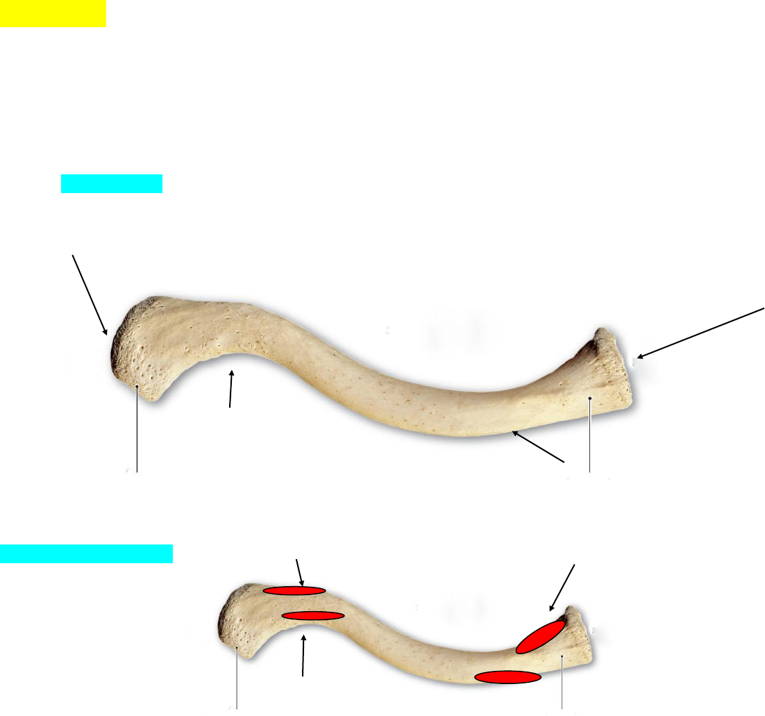 CURSO MEDICINA 1 ° AÑO ONLINE 2017 APUNTE ROUVIERE –ATLAS- EXAMEN CLASE 2 : MIEMBRO SUPERIOR Empezamos diciendo como esta formado el esqueleto del miembro superior : -POR EL HOMBRO -POR EL BRAZO -POR EL ANTEBRAZO -POR LA MANO ESQUELETO DEL HOMBRO Como vimos la cintura escapular unia el brazo al torax y esta formada por : CLAVICULA OMOPLATO CLAVICULA: Tipo de hueso : largo Forma : S itálica Como se divide para el estudio : 2 caras ( superior e inferior) 2 bordes 2 extremidades Esta es la CARA SUPERIOR Nos damos cuenta que es la cara superior porque es lisa . Nos queda ver de que lado es Esta es la extrmidad Externa que articula con El acromion ( parte del omoplato) esto es posterior Esta es la extremidad interna Que articula con el esternon Borde externo anterior concavo Anterior borde anterior interno convexo ¡ENTONCES ¿¿¿DE QUE LADO ES ?? RTA : es derecha INSERCIONES MUSCULARES : trapecio esternocleidomastoideo Deltoides pectoral mayor Ahora vamos a ver la CARA INFERIOR : es rugosa extremo interno ( articula con esternón) Extremo externo ( articula con acromion) ANTERIOR Tubérculo costal POSTERIOR Miren el canal subclavio se ve bien Tubérculo conoide Bien veamos ahora las INSERCIONES MUSCULARES : pectoral mayor Deltoides ANTERIOR subclavio esternocleidohioideo trapecio POSTERIOR Los BORDES : ANTERIOR : ¿Que tenemos ? insercione del pectoral mayo y del deltoides POSTERIOR : ¿Qué tenemos? La inserción del trapecio EXTREMIDADES : En la interna : se inserta el ECM En la externa se articula con el acromion EXAMEN : ¿ Que pueden tomar de este hueso ? 1-¿Qué musculos se insertan en el borde anterior? Pectoral mayor y deltoides 2-¿Qué musculos se sinsertan en el borde posterior? Esternocleidomastoideo y trapecio 3-¿En que cara se encuentra el canal subcalvio? En la cara inferior 4-¿Qué se inserta en el canal subclavio? El musculo subclavio 5-¿Con que hueso articula la extremidad interna ? con el esternón 6-¿Con que hueso articula la extremidad externa ? con el omoplato ESCAPULA – OMOPLATO CARA ANTERIOR TIPO DE HUESO : plano apófisis coracoides escotadura coracoides DIVISION : 2 caras : anterior y posterior 3 bordes angulo superior 3 angulos Acromion cavidad glenoidea angulo externo Borde axilar externo INSERCIONES MUSCULARES Fosa subescapular Pectoral menor Angulo inferior Coracobraquial Porción corta del bíceps omohioideo deltoides porción larga del biceps serrato mayor porción larga del triceps subescapular CARA POSTERIOR Acromion Apófisis espinosa Espina del omoplato Fosa supraespinosa Fosa infraespinosa cresta oblicua INSERCIONES MUSCULARES Angular del omoplato trapecio deltoides Porción larga del biceps Porción corta del biceps Romboides mayor romboides Redondo menor menor Redondo mayor infraespinoso Dorsal ancho BORDES : SUPERIOR : escotadura coracoidea ( pasa el nervio supraescapular) INTERNO : espinal EXTERNO: axilar ANGULOS : -SUPERIOR : da inserción al angular del omoplato -INFERIOR : se inserta el dorsal ancho EXAMEN : 1-¿Qué hueso presenta apófisis coracoides? La escapula ( omoplato) 2-¿Qué se inserta en la apófisis coracoides ? pectoral mayor Pectoral menor Tendón de la porción corta del bíceps Ligamento conoide Ligamento trapezoide Ligamento acromio-coracoideo Ligamento coraco –humeral Ligamento coraco claviculares HUESO DEL BRAZO : HUMERO: TIPO DE HUESO : Largo ARTICULA CON : hacia arriba con omoplato y hacia abajo con cubito y radio DIVISION PARA SU ESTUDIO : CARAS : Cara anterior Cara posterior Antero- Externa Antero- Interna BORDES : anterior , externo e interno EXTREMIDADES : superior e inferior CARA ANTERIOR CARA POSTERIOR TROQUIN TROQUITER troquiter cabeza Cuello quirurgico CORREDERA BICIPITAL (entre el troquin y troquiter) LADO INTERNO LADO EXTERNOCANAL RADIAL V deltoidea Borde anterior cara antero interna cara antero-externa fosa supratroclear epitróclea fosa radial epicondilo cavidad oleocraneana tróclea cóndilo IN RINSERCIONES MUSCULARES Subescapular supraespinoso infraespinoso redondo menor Dorsal ancho Redondo mayor pectoral mayor vasto externo Deltoides deltoides Coracobraquial braquial anterior vasto interno braquial anterior supinador largo epitrocleares 1° radial epicondileos anconeo cubital MUSCULOS EPITROCLEARES : -PLANO SUPERFICIAL DELGRUPO ANTERIOR DEL ANTEBRAZO : -pronador redondo -palmar mayor y menor -cubital anterior -flexor superficial MUSCULOS EPICONDILEOS : -PLANO SUPERFICIAL DEL GRUPO POSTERIOR DEL ANTEBRAZO : -anconeo -cubital posterior -extensor común de los dedos -extensor propio del meñique BORDES : -ANTERIOR : corredera bicipital y V deltoidea . Se inserta en el borde anterior el braquial anterior -EXTERNO : arriba interrumpiado por canal radial . Abajo se inserta : supinador largo y primer radial. EXTREMIDADES : -SUPERIOR :cabeza del humero con : troquin ( tuberosidad menor) , troquiter ( tuberosidad mayor) y entre ambos La corredera bicipital -INFERIOR : epicondilo - tróclea - epitróclea EXAMEN : 1-¿Entre que dos musculos se encuentra el canal radial? Entre el vasto interno y vasto externo 2-¿Qué pasa por el canal radial ? pasa : nervio radial , arteria y vena humeral profunda 3-¿Dónde se encuentra el canal radial en el humero ? en la cara posterior 4-¿Qué musculos se insertan en el troquiter? Supraespinoso , infraespinoso y redondo menor 5-¿Qué musculos se insertan en el troquin ? subescapular 6-¿Dónde se ubica la corredera bicipital ? en la cara anterior del humero entre el troquin y el troquiter 7-¿Qué elementos se encuentran en la corredera bicipital ? Musculos : tendón de la porción larga del bíceps Dorsal ancho ( en el fondo) La rama de la arteria circunfleja anterior 8-¿Qué musculos se insertan a ambos lados de la corredera bicipital ? Redondo mayor ( en el labio interno) Pectoral mayor ( labio externo) HUESOS DEL ANTEBRAZO CUBITO : CARA ANTERIOR TIPO DE HUESO : largo pico del olecranon UBICACIÓN : dentro del radio cavidad sigmoidea menor CUERPO : forma de S itál