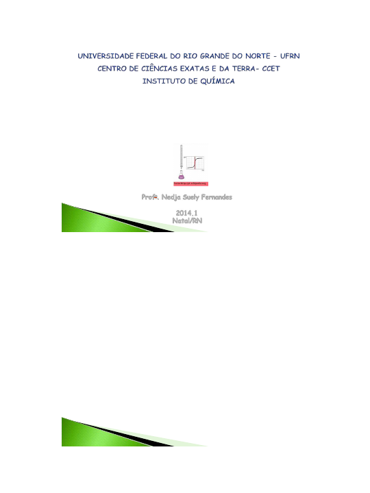 1 QUÍMICA ANALÍTICA APLICADA - QUI 0111 Profa. Nedja Suely Fernandes 2014.1 Natal/RN CONSTRUINDO UMA CURVA DE TITULAÇÃO DE UM ÁCIDO FORTE E UMA BASE FORTE Profa. Nedja Fernandes IQ/UFRN 2 CONSTRUÇÃO DAS CURVAS DE TITULAÇÃO As curvas de titulação, no caso das reações de neutralização, são obtidas tomando-se os valores de pH da solução em função do volume do titulante ou da fração titulada. Nestes cálculos admite-se que a reação entre o ácido e a base é completa e considera-se a solução resultante como uma mistura do ácido ou da base em excesso e de um sal formado. 2 Profa. Nedja Fernandes IQ/UFRN 3 TITULAÇÃO DE UMA SOLUÇÃO DE NaOH e HCl TITULANTE TITULADO Solução de NaOH 0,100 mol/L Solução de HCl 0,100 mol/L INDICADOR Profa. Nedja Fernandes IQ/UFRN 4 CONSTRUÇÃO DAS CURVAS DE TITULAÇÃO Calcular o pH antes da adição de NaOH Calcular o pH antes do ponto de equivalência Calcular o pH no ponto de equivalência Calcular o pH após o ponto de equivalência 3 Profa. Nedja Fernandes IQ/UFRN 5 TITULAÇÃO ÁCIDO FORTE-BASE FORTE • Considere a adição de uma base forte (por exemplo, NaOH) a uma solução de um ácido forte (por exemplo, HCl). – Antes de qualquer base ser adicionada, o pH é dado pela solução do ácido forte. Portanto, o pH < 7. – Quando a base é adicionada, antes do ponto de equivalência, o pH é dado pela quantidade de ácido forte em excesso. Portanto, pH < 7. Profa. Nedja Fernandes IQ/UFRN 6 No ponto de equivalência, a quantidade de base adicionada é estequiometricamente equivalente à quantidade de ácido originalmente presente. Portanto, o pH é determinado pela ionização da água. Portanto, pH = 7 a 25 oC. • Sabemos que o pH no ponto de equivalência é 7,00. • Para detectar o ponto equivalência, usamos um indicador que muda de cor quando próximo a 7,00. TITULAÇÃO ÁCIDO FORTE-BASE FORTE 4 Profa. Nedja Fernandes IQ/UFRN 7 • O ponto de equivalência em uma titulação é o ponto no qual o ácido e a base estão presentes em quantidades estequiométricas. • O ponto final em uma titulação é o ponto observado. • A diferença entre o ponto de equivalência e o ponto final é chamada de erro de titulação. • Inicialmente, o ácido forte está em excesso, logo o pH < 7. TITULAÇÃO ÁCIDO FORTE-BASE FORTE Profa. Nedja Fernandes IQ/UFRN 8 • À medida que a base é adicionada, o pH aumenta, mas ainda é menor que 7 devido o excesso de ácido. • No ponto de equivalência, o pH é dado pela solução do sal (neste caso, o pH = 7) devido a ionização da água. • Após o ponto de equivalência, o pH é dado pela base forte em excesso, logo, o pH > 7. TITULAÇÃO ÁCIDO FORTE-BASE FORTE 5 Profa. Nedja Fernandes IQ/UFRN 9 Considere-se a titulação de 50,0 mL de solução de HCl 0,100 mol/L com uma solução de NaOH 0,100 mol/L. V NaOH (mL) pH V NaOH (mL) pH 0 1,0 50,1 10,0 10 1,2 50,5 10,7 20 1,4 51 11,0 25 1,5 52 11,3 30 1,6 55 11,7 40 2,0 60 12,0 45 2,3 70 12,2 48 2,7 75 12,3 49 3,0 80 12,4 49,5 3,3 90 12,5 49,9 4,0 100 12,5 50,0 7,0 Profa. Nedja Fernandes IQ/UFRN 10 CURVA DE TITULAÇÃO (ÁCIDO FORTE/BASE FORTE) 6 Profa. Nedja Fernandes IQ/UFRN 11 HClC ]O[H3 a) Antes da titulação ser iniciada (Vb = 0 mL) mol/L 0,100 C HCl mol/L 0,100 ]O[H3 0,100 log - pH 1,00 pH Profa. Nedja Fernandes IQ/UFRN 12 b) Após a adição de 25,0 mL de NaOH (Vb = 25 mL) V HCln C * HCl nNaOH - nHCl HCln* HCl nHCl - nNaOH C V n* = número de mols de HCl que restou sem reagir V = volume total da solução 7 Profa. Nedja Fernandes IQ/UFRN 13 HCl VaMa - VbMb C Va + Vb nHCl = VaMa nNaOH = VbMb V = Va + Vb HClC ]O[H3 Considerando 3 VaMa - VbMb [H O ] Va + Vb Profa. Nedja Fernandes IQ/UFRN 14 2 3[H O ] 3,33 x 10 mol/L 3 3 3 (50,0 x 0,100 - 25,0 x 0,100) x 10 [H O ] (50,0 + 25,0) x 10 pH 1,48 8 Profa. Nedja Fernandes IQ/UFRN 15 c) Após a adição de 50,0 mL de NaOH (Vb = 50 mL) VaMa VbMb PONTO DE EQUIVALÊNCIA nNaOH nHCl NaCl Profa. Nedja Fernandes IQ/UFRN 16 250,0 x 0,100[Na ] [Cl ] = = 5,00 x 10 mol/L 100,0 3[H O ] = [OH ] PONTO DE EQUIVALÊNCIA IONIZAÇÃO DA ÁGUA 9 Profa. Nedja Fernandes IQ/UFRN 17 14 3[H O ] x [OH ] = 1,0 x 10 2 14 3[H O ] = 1,0 x 10 7 3[H O ] = 1,0 x 10 mol/L pH 7,00 a 25 oC Profa. Nedja Fernandes IQ/UFRN 18 d) Após a adição de 75,0 mL de NaOH (Vb = 75 mL) * NaOH n NaOH C V NaOH[OH ] C n* = número de mols de NaOH que restou sem reagir V = volume total da solução *n NaOH nNaOH - nHCl 10 Profa. Nedja Fernandes IQ/UFRN 19 NaOH nNaOH - nHCl C V NaOH VbMb - VaMa C Va + Vb VbMb - VaMa [OH ] Va + Vb Profa. Nedja Fernandes IQ/UFRN 20 NaOH nNaOH - nHCl C V NaOH VbMb - VaMa C Va + Vb VbMb - VaMa [OH ] Va + Vb 11 Profa. Nedja Fernandes IQ/UFRN 21 2[OH ] 2,00 x 10 mol/L 3 3 (75,0 x 0,100 - 50,0 x 0,100) x 10 [OH ] (75,0 + 50,0) x 10 pOH 1,70 pH 12,30 Profa. Nedja Fernandes IQ/UFRN 22 DEVER DE CASA UTILIZANDO O EXCEL, CONSTRUA A CURVA DE TITULAÇÃO (ÁCIDO FORTE-BASE FORTE) A PARTIR DOS DADOS DA TABELA.