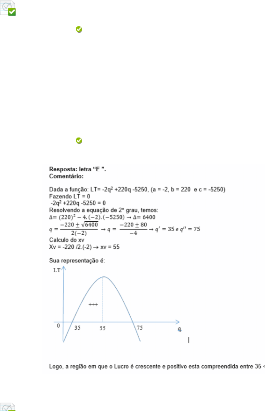Pergunta 1 0,4 em 0,4 pontos Dada a função LT= -2q2 +220q -5250, a região em que o lucro é crescente e positivo é: Resposta Selecionada: e. 35 < q < 55 Respostas: a. 0 < q < 55 b. 0 < q < 35 c. 0 < q < 75 d. 35< q < 75 e. 35 < q < 55 Feedback da resposta: Pergunta 2 0,4 em 0,4 pontos A copiadora Xerox S&A tem um custo fixo de R$ 1600,00 por mês e custos vaiáveis de R$ 0,08 por folha que reproduz. Se os consumidores pagam R$ 0,18 por folhas, quantas folhas a copiadora precisa reproduzir para não ter prejuízo? Resposta Selecionada: d. Q ≥ 16.000 Respostas: a. Q < 16.000 b. Q > 16.000 c. Q = 16.000 d. Q ≥ 16.000 e. Q ≤ 16.000 Feedback da resposta: Resposta: letra “D”. Comentário: Sabendo que R = 0,18.q e C = 1600 + 0,08q, basta determinar o Ponto de Nivelamento, ou seja, igualar as duas funções. R = C 0,18q = 1600 + 0,08q 0,10q = 1600 q = 16000 folhas. Fazendo análise econômica: Q = 16000 → R = C → Lucro é zero Q > 16000 → R > C → Lucro Q < 16000 → C > R → Prejuízo Logo, para a empresa não ter prejuízo é preciso que ela reproduza uma quantidade maior e igual a 16000 folhas. Pergunta 3 0,4 em 0,4 pontos A dona do Salão Bem Star verificou que quando o valor do design de sobrancelha custava R$ 15,00 ela tinha, por semana, 200 clientes sendo atendidos, porém, aumentando para R$ 20,00, o número de clientes semanais caiu pela metade. Preocupada com isto, ela precisa saber que preço deve ser cobrado para maximizar a receita e quantos clientes consegue captar por este preço semanalmente. Resposta Selecionada: c. P = R$ 12,50 e 250 clientes Respostas: a. P = R$ 17,50 e 150 clientes b. P = R$ 17,50 e 200 clientes c. P = R$ 12,50 e 250 clientes d. P = R$ 12,50 e 150 clientes e. P = R$ 18,00 e 140 clientes Feedback da resposta: Resposta: letra “C ”. Comentário: Considerando x como quantidade e y como preço temos os conjuntos de pontos: (200; 15) e (100 ; 20) Substituindo na equação: y = ax + b y = ax + b 15 = 200.a + b 20 = 100.a + b Resolvendo o sistema 15 = 200.a + b 20 = 100.a + b a = -0,05 b = 25 Logo a função demanda é P = -0,05D + 25 Substituindo na função RT = P.D RT = (-0,05D + 25).D RT = -0,05D2 + 25D Calculando xv e yv temos: Xv = -25 / 2.(-0,05) Xv = 250 unidades (quantidade que maximiza a receita) Yv = -((252)-4.(-0,05).0)/4. (-0,05) Yv = R$ 3125,00 (Receita máxima) Para calcular o preço basta dividir a receita máxima pela quantidade RT = P. D P = 3125 / 250 P = R$ 12,50 Pergunta 4 0,4 em 0,4 pontos Num modelo linear de oferta e procura, as quantidades ofertadas e demandadas são, respectivamente, funções lineares do preço S = -30+18P e D = 42-6P. O ponto de equilíbrio (p,q) para estas funções é: Resposta Selecionada: a. (3 ; 24) Respostas: a. (3 ; 24) b. (24 ; 3) c. (1 ; 36) d. (36 ; 1) e. (1,67 ; 7) Feedback da resposta: Resposta: letra “ A ”. Comentário: O ponto de equilíbrio é determinado igualando as funções Oferta e Demanda. S = D -30 + 18P = 42 – 6P 72 = 24P P=R$ 3,00 Substituindo p = R$ 3,00 na função Demanda, temos: D = 42 – 6P D = 42 – 6.(3) D = 24 unidades. Logo, o ponto de Equilíbrio é dado pelas coordenadas (3 ; 24) Pergunta 5 0,4 em 0,4 pontos Num modelo linear de oferta e procura, as quantidades ofertadas e demandadas são, respectivamente, funções lineares do preço S = -30+18P e D = 42-6P. Analise as seguintes situações e assinale a informação falsa. Resposta Selecionada: c. Se o preço for R$ 5,00 haverá um excesso de demanda correspondente a 12 unidades em relação à quantidade de equilíbrio. Respostas: a. Para um preço de R$ 4,00 os produtores se sentem mais a vontade de ofertar seu produto uma vez que a oferta aumenta em 18 unidades em relação à quantidade de equilíbrio. b. O preço de equilíbrio é obtido quando for ofertado/vendido 24 unidades do produto. c. Se o preço for R$ 5,00 haverá um excesso de demanda correspondente a 12 unidades em relação à quantidade de equilíbrio. d. O preço inicial para ofertar produto é acima de R$ 1,67. e. Só é possível vender uma quantidade inferior a 42 produtos. Feedback da resposta: Resposta: letra “ C ”. Comentário: O ponto de equilíbrio é determinado igualando as funções Oferta e Demanda. S = D -30 + 18P = 42 – 6P 72 = 24P P=R$ 3,00 Substituindo p = R$ 3,00 na função Demanda, temos: D = 42 – 6P D = 42 – 6.(3) D = 24 unidades. Logo, o ponto de Equilíbrio é dado pelas coordenadas (3 ; 24) Se o preço for R$ 5,00 Haverá escassez de demanda correspondente a 12 unidades em relação à quantidade de equilíbrio D = 42 – 6.(5) D = 12 unidades Analisando a demanda em relação à demanda de equilíbrio, temos: 24 - 12 = 12 unidades. Pergunta 6 0,4 em 0,4 pontos O departamento financeiro de uma microempresa verificou que a receita diária é dada por RT= - q2 + 58q onde q e quantidade de produtos vendidos. Qual será a receita quinzenal se forem vendidos 50 produtos por dia? Resposta Selecionada: b. R$ 400,00 Respostas: a. R$ 44.250,00 b. R$ 400,00 c. R$ 6.00,00 d. R$ 2.950,00 e. R$ 5.400,00 Feedback da resposta: Resposta: letra “B”. Comentário: Dada a função: RT= - q2 + 58q, para q = 50 temos: RT= - q2 + 58q RT= -(50)2+58.(50) RT = -2500 + 2900 RT = R$ 400,00 Para saber a Receita em 15 dias, basta multiplicar o valor da receita por 15. 400 x 15 = R$ 6.000,00 Pergunta 7 0,4 em 0,4 pontos O gerente de uma empresa de produtos eletrônicos, sabendo que o preço de mercado para um determinado tipo de GPS é igual a R$ 317,00 por unidade, decide colocar à venda 424 unidades por mês. Se o preço de mercado fosse de R$ 426,00, a gerente acharia vantagem em oferecer 642 unidades à venda por mês. Expresse a função oferta e o preço para iniciar a ofertar mercadoria. Resposta Selecionada: d. Função oferta é S = 2P – 210 e começará a ofertar mercadoria quando P > R$ 105,00 Respostas: a. Função oferta é S = 0,5P – 265,50 e começará a ofertar mercadoria quando P > R$ 531,00 b. Função ofer