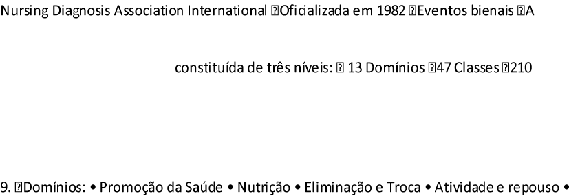 A Classificação das Intervenções de Enfermagem (NIC) é uma ferramenta clínica que padroniza a linguagem para a documentação das intervenções de enfermagem e auxilia o profissional na seleção das intervenções adequadas. Esta taxonomia é ideal para profissionais da área de enfermagem (enfermeiros, estudantes, gestores e docentes) que buscam melhorar ampliar seu conhecimento e aperfeiçoar sua prática. Diagnósticos de Enfermagem: Uso das Taxonomias (NANDA, NIC, NOC e CIPE) 1. Diagnósticos de Enfermagem: Uso das Taxonomias (NANDA, NIC, NOC e CIPE) Enfª R1 Gabrielle Pessôa Pronto Socorro Cardiológico de Pernambuco Profº Luiz Tavares Programa de Especialização em Cardiologia Modalidade Residência Março 2015 2. Objetivos • Abordar o processo de enfermagem; • Conceituar os diagnósticos de enfermagem; • Diferenciar diagnósticos de enfermagem de diagnósticos médicos; • Elencar e explanar as taxonomias NANDA, NIC, NOC e CIPE; 3. •Organiza-se em cinco etapas inter-relacionadas, interdependentes e recorrentes. O Processo de Enfermagem •Instrumento metodológico que orienta o cuidado profissional de Enfermagem e a documentação da prática profissional. •A sua operacionalização e documentação evidencia a contribuição da enfermagem na atenção à saúde da população, aumentando a visibilidade e o reconhecimento profissional. (Resolução COFEN 358/2009) 4. Etapas do Processo de Enfermagem 1- Coleta de dados de enfermagem/Histórico de enfermagem 2- Diagnóstico de enfermagem 3- Planejamento de enfermagem 4- Implementação 5- Avaliação de enfermagem Ao enfermeiro, incumbe a liderança na execução e avaliação do Processo de Enfermagem. 5. Diagnósticos de enfermagem Diagnósticos Médicos x 6. Diagnósticos de Enfermagem IMPORTANTE! “Processo de interpretação e agrupamento dos dados coletados na primeira etapa, representando, com mais exatidão, as respostas da pessoa, família ou coletividade humana em um dado momento do processo saúde e doença.” (COFEN, 2009) Os sistemas de classificação de enfermagem podem ser utilizados como ferramentas de auxílio e qualificação. 7. Classificação de Diagnósticos de Enfermagem da NANDA-I • NANDA-I: North American Nursing Diagnosis Association International Oficializada em 1982 Eventos bienais A participação de enfermeiros brasileiros somente em 1990 na VIII Conferência da NANDA 8. • Estrutura da taxonomia constituída de três níveis: 13 Domínios 47 Classes 210 Diagnósticos de enfermagem 7 Eixos: foco diagnóstico, sujeito diagnóstico, julgamento, localização, idade, tempo e situação do diagnóstico. Diagnóstico de enfermagem: Julgamento clínico das respostas do indivíduo, da família ou da comunidade a problemas de saúde/processos vitais, reais ou potenciais [...] (NANDA, 2013) NANDA-I 9. Domínios: • Promoção da Saúde • Nutrição • Eliminação e Troca • Atividade e repouso • Percepção/cognição • Autopercepção • Papéis/relacionamentos NANDA-I • Sexualidade • Enfrentamento/tolerân cia ao estresse • Princípios da vida • Segurança/proteção • Conforto • Crescimento/desenvolvi mento “esfera de conhecimentos, influências e questionamento” (NANDA, 2013) Classe: “um grupo, conjunto ou tipo que partilha atributos comuns” (NANDA, 2013) 10. Composição dos Diagnósticos de Enfermagem Título Definição Fatores relacionados Fatores de risco Características definidoras Dor Aguda Experiência sensorial e emocional desagradável causada por lesões tissulares reais ou potenciais [...] Agentes lesivos x Relato verbal, fácies de dor Risco de Infecção Risco aumentado de invasão p/ microorganismo s patogênicos x Procedimentos invasivos x 11. Tipos de Diagnósticos de Enfermagem Real Promoção da Saúde Risco Síndrome NANDA, 2013. 12. NIC (Nursing Interventions Classification) • Contempla aspectos fisiológicos e psicossociais do ser humano, incluindo tratamento, prevenção e promoção da saúde. Intervenção de enfermagem: “Qualquer tratamento baseado no julgamento e conhecimento clínico , que seja realizado por um enfermeiro para melhorar os resultados do paciente/cliente. Trata-se de uma ação autônoma executada com base científica e em benefício do cliente, ralacionada a um DE, com vistas a atingir os melhores resultados possíveis” (NIC, 2010) 13. • Estrutura taxonômica: domínios, classes e intervenções • 7 domínios, 30 classes, 542 intervenções e mais de 12 mil atividades/ações. Domínios: • 1) Fisiológico básico • 2)Fisiológico Complexo • 3) Comportamental • 4) Segurança • 5) Família • 6) Sistema de Saúde • 7) Comunidade NIC (Nursing Interventions Classification) 14. Tipos de Intervenções Intervenções diretas Intervenções indiretas Fonte: NIC, 2010. 15. NOC (Nursing Outcomes Classification) Resultado de enfermagem: “O estado, comportamento, ou percepção de um indivíduo, da família e comunidade , mensurado ao longo de um continuum, em resposta a uma ou mais intervenções de enfermagem.” (NOC, 2010) Estrutura taxonômica possui 5 níveis: 7 domínios, 31 classes, 385 resultados, indicadores e escalas de mensuração. Domínios: Saúde funcional Saúde fisiológica Saúde psicossocial Conhecimento de saúde e comportamento Saúde percebida Saúde familiar Saúde comunitária 16. Controle da dor Nunca demonstra do Raramente demonstra do Algumas vezes demonstra do Frequente mente demonstra do Consistent emente demonstra do Reconhecim ento do início da dor 1 2 3 4 5 Uso de medidas preventivas 1 2 3 4 5 NOC (Nursing Outcomes Classification) Fonte: NOC, 2010. 17. CIPE (Classificação Internacional da Prática de Enfermagem) Elaborada pelo Conselho Internacional dos Enfermeiros (International Council of Nursing – ICN) em 1989. Constitui uma uniformização das terminologias científicas reunindo diagnósticos (fenômenos), intervenções e resultados da prática de en