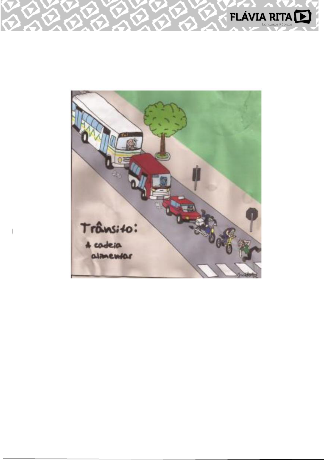 | 1 Rua Mato Grosso 306/ Sl 101- Barro Preto- Belo Horizonte (31) 3296-0590 - (31)3646-3088 www.flaviarita.com QUESTÕES FGV – PORTUGUÊS AULÃO O Colégio Bom Conselho, em Porto Alegre, promoveu um concurso de charges sobre o trânsito e o primeiro lugar foi dado à charge abaixo: 01. (FGV/Analista Judiciário/TJ-PI) Sobre a charge, é correto afirmar que seu tema central é:(A) a solidariedade no trânsito; (B) as dificuldades de locomoção; (C) a violência no trânsito; (D) a ausência de autoridade; (E) a falta de fiscalização adequada. 02. (FGV/Analista Judiciário/TJ-PI) A charge anterior apoia-se na estrutura de uma figura de linguagem, que é: (A) a hipérbole; (B) o eufemismo; (C) a catacrese; (D) o pleonasmo; (E) a metáfora. ad en ilso n c arl os ag uia r d e s ou za - 7 57 .82 8.8 02 -44 - a pca de nils on @h otm ail. com - 1 7/0 4/2 01 8 2 1:2 3:4 5 | 2 Rua Mato Grosso 306/ Sl 101- Barro Preto- Belo Horizonte (31) 3296-0590 - (31)3646-3088 www.flaviarita.com 03. (FGV/Analista Judiciário/TJ-PI) A charge mostra uma característica das mudanças no trânsito, que é: (A) a dificuldade de locomoção; (B) a falta de estacionamentos; (C) a ausência de fiscais; (D) a presença de criatividade; (E) a solidariedade dos motoristas. Texto 3 – TRÂNSITO: SOLUÇÕES Em 1997 foram criados os rodízios para diminuir a circulação de veículos em determinados horários na capital paulista. Também foram feitas ciclovias (17,5 km) e campanhas de conscientização. Mas nada disso resolveu o caos no trânsito. Também foi incentivado o uso de motocicletas, que ocupam menos espaço no tráfego. Porém, elas poluem mais do que veículos novos e são as principais causadoras de mortes no trânsito. Segundo o “Mapa da Violência 2011”, do Instituto Sangari, o número de vítimas fatais no trânsito brasileiro subiu 23,9%, de 1998 a 2008; entre os motociclistas, o aumento foi de 753,8%. Por isso, cada vez mais especialistas defendem a mobilidade urbana sustentável. Uma das principais mudanças seria o investimento em transporte coletivo e o desestímulo ao individual. Entre as medidas sugeridas – e uma das mais polêmicas – está a cobrança de pedágio urbano. Ele consiste em cobrar uma tarifa dos motoristas que circulem em determinadas áreas da cidade. O modelo foi implantado pela primeira vez em 1975, em Cingapura, e se espalhou por países europeus. Em São Paulo, há projetos que tramitam na Câmara para cobrar motoristas que trafeguem na região central. As tarifas variam de R$ 1 a R$ 4, valor que especialistas acham pouco para que a medida dê resultado. Há ainda propostas de aumento da malha ferroviária – atualmente, 60% do transporte brasileiro é feito em rodovias. São Paulo, por exemplo, possui apenas 65,3 km de linhas de metrô, enquanto Santiago do Chile (com metade da população paulista) possui 83,2 km e Nova York, 479 km. Todos esses pontos são avaliados como soluções para as demais capitais brasileiras e mesmo para cidades de médio porte, que já enfrentam problemas semelhantes. ad en ilso n c arl os ag uia r d e s ou za - 7 57 .82 8.8 02 -44 - a pca de nils on @h otm ail. com - 1 7/0 4/2 01 8 2 1:2 3:4 5 | 3 Rua Mato Grosso 306/ Sl 101- Barro Preto- Belo Horizonte (31) 3296-0590 - (31)3646-3088 www.flaviarita.com 04. (FGV/Analista Judiciário/TJ-PI) No primeiro parágrafo do texto 3 há duas formas verbais na voz passiva: “foram criadas” e “foram feitas”. A opção pela voz passiva faz com que as ações realizadas: (A) não mostrem seus agentes; (B) se localizem em passado distante; (C) se processem simultaneamente; (D) sejam atribuídas a agentes diferentes; (E) indiquem ações potenciais e não reais. 05. (FGV/Analista Judiciário/TJ-PI) “Também foram feitas ciclovias e campanhas de conscientização”. A forma ativa dessa frase passiva é: (A) fizeram ciclovias e também campanhas de conscientização; (B) também fizeram ciclovias e campanhas de conscientização; (C) também tinham feito ciclovias e campanhas de conscientização; (D) também faziam ciclovias e campanhas de conscientização; (E) ciclovias e campanhas de conscientização também eram feitas. 06. (FGV/Analista Judiciário/TJ-PI) “Todos esses pontos são avaliados como soluções para as demais capitais brasileiras e mesmo para cidades de médio porte, que já enfrentam problemas semelhantes”. A frase abaixo em que o vocábulo “mesmo” aparece com sentido idêntico ao que possui no trecho acima é: (A) mesmo com trânsito caótico, muitos saem de carro; (B) dizem que o trânsito está engarrafado mesmo!; (C) os turistas chegaram no mesmo dia; (D) as multas são iguais, mesmo para carros menores; (E) andava devagar, mesmo com carro potente. 07. (FGV/Analista Judiciário/TJ-PI) Em todos os segmentos abaixo há a preocupação de eliminar-se o QUE das frases originais; a opção em que essa modificação foi feita de forma inadequada é: (A) “soluções para as demais capitais brasileiras e mesmo para cidades de médio porte, que já enfrentam problemas semelhantes” / já com problemas semelhantes; (B) “Também foi incentivado o uso de motocicletas, que ocupam menos espaço no tráfego” / com menos espaço de ocupação no tráfego; (C) “Ele consiste em cobrar uma tarifa dos motoristas que circulem em determinadas áreas da cidade” / com circuito em determinadas áreas da cidade; (D) “Em São Paulo, há projetos que tramitam na Câmara para cobrar motoristas que trafeguem na região central” / em tráfego na região central; (E) “Em São Paulo, há projetos que tramitam na Câmara para cobrar motoristas que trafeguem na região central” / em tramitação na Câmara. 08. (FGV/Analista Judiciário/TJ-PI) Abaixo estão cinco medidas que pretendem melhorar o problema do trânsito nas grandes cidades. O aspecto positivo de uma delas que, no contexto, está apontado de forma correta é: (A) rodízios / melhora a conscientização das pessoas; (B) 