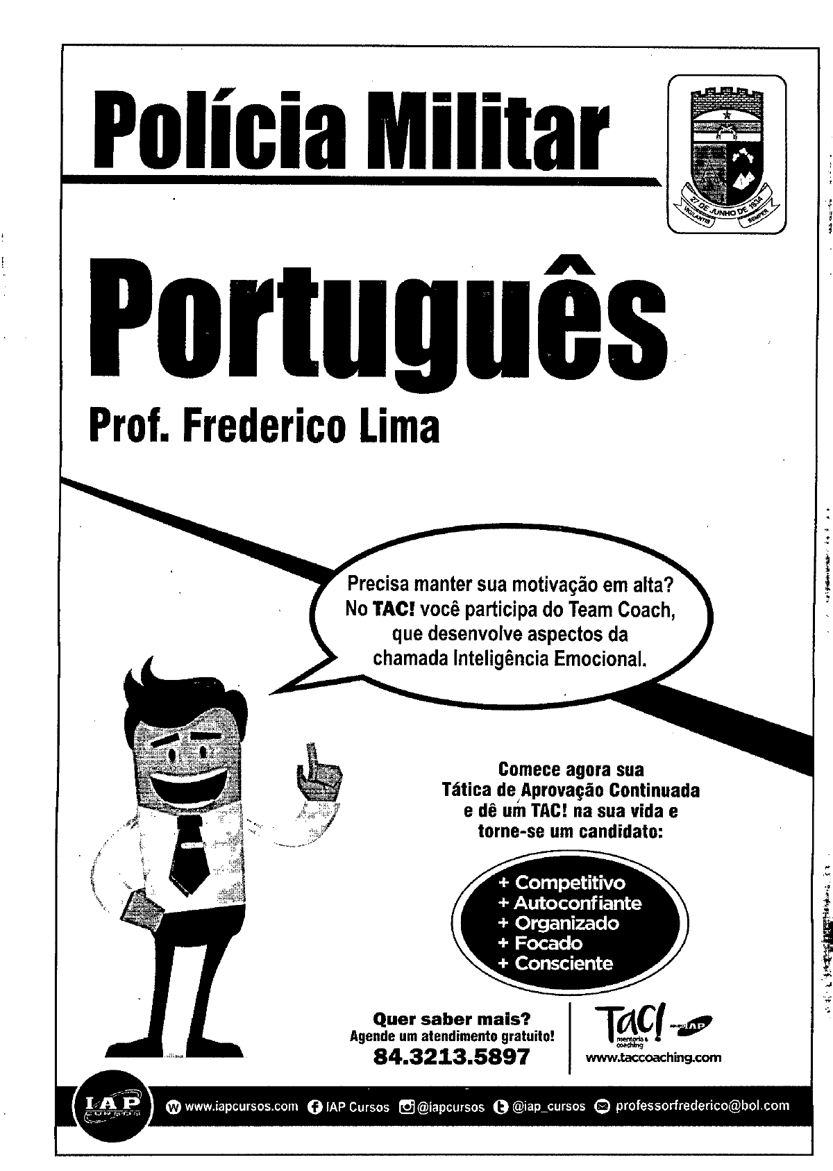 Polícia Militar i I j Prol. Frederico Lima Comece agora sua Tática de Aprovação Continuada e dê um TAC! na sua vida e torne-se um candidato: + Competitivo +Autoconfiante + Organizado + Focado + Consciente .. T~Çf-" www.taccoaching.com Quer saber mais? Agende um atendimento gratuito! 84.3213.5897 Precisa manter sua motivação em alta? No TAC! você participa do Team Coach, que desenvolve aspectos da chamada Inteligência Emocional. - ('l) www.iapcursos.comOIAPcursost!::!l@iapcursos(}@iap_cursoseprofessorfrederico@bol.com I.' 111 Polícia Militar Português MANHÃ/TARDE/NOITE PORTUGUÊS FREDERICO LIMA I Soldado PM [I Prof PredericoLima Técnicas de leitura e interpretação de texto. Classes de palavras (usos e adequação em textos)/Colocação de proriomeslColetil/ós Avaliaçãa do texto. sob o aspecto da adequação da pontuação. Regência verbal e:t\ôm inaf/crasé, ..' . ,Conjl.inções (Complemento da coesãopor relação lógico-semântica). o estudo dos verbos/Concordâncias: nominal fi verbal: .ortografia: emprego das letras e acentuação gráfica e resolução de questões. Observações ao aluno o cronograma de aulas é uma ferramenta cuja finalidade é possibilitar a você, aluno, um acompanhamento preciso das aulas e do conteúdo programático. Por meio dele, você poderá planejar-se com antecedência, estudando o assunto das aulas subsequentes. O empenho no sentido do cumprimento deste cronograma deve partir do professor, mas também de todos os alunos, uma vez quo tal cumprimento resultará em aulas mais eficientes e um estudo melhor direcionado. A pontualidade é essencial para a.eficiê.ncia, portanto não se atrase para o início das aulas, nem prolongue seu horário de intervalo. Quando reeisar de um es aço individualizado para estudar, você tem à dis osiçãO a nossa Biblioteca. WWW.IAPCURSOS.COM <I)o ~ ::>o 0- S '".~" "teo o- ...... • ••••• -~ •• __ o ••• _ ••• _ ••••••••••••• 111 Polícia Militar Português I Soldado PM ; J Professor: Predérico Lima WWW.IAPCURSOS.COM , , . AULA 1 1- Técnicas de leitura e interpretação de texto: 1.1- Ler, leitura ... O que é isso? o entendimento do conceito de leitura ultrapassa a concepção de decodificação do código escrito. Ou seja, a habilidade que se deve ter de leitura não é somente reconhecer e traduzir sílabas ou palavras (signos Iinguísticos), em sons, isoladamente (a decodificação), mas é atribuir significado àquilo que é lido. Buscando a definição do Dicionário Eletrônico Houaiss da Língua Portuguesa, encontramos que leitura é: 1. ato de decifrar signos gráficos que traduzem a linguagem oral; arte de ler. 2. ação de tomar conhecimento do conteúdo de um texto escrito, para se distrair ou se informar. 3. maneira de compreender, de interpretar um texto, uma mensagem, um acontecimento. 4. ato de decifrar qualquer notação; o resultado desse ato. No entanto, para compreendermos, de fato, o fenômeno da leitura, não basta o seu sentido dicionarizado. Por isso, vamos buscar a definição apresentada por Lajota (1982, P 59), que afirma Ler não é decifrar, como num jogo de adivinhações, o sentido de um texto. É a partir do texto, ser capaz de atribuir-lhe significado, conseguir relacioná- lo a todos os outros textos significativos para cada um, reconhecer nele o tipo de leitura que seu autor pretendia e, dono da própria vontade, entregar-se a esta leitura, ou rebelar-se contra ela, propondo outra não prevista. Nesse sentido, segundo a autora, a leitura é um processo de interlocução entre leitor/autor mediado pelo texto. É uma espécie de encontro com o autor, que está ausente, mas mediado pela palavra escrita. 1.2- Fases da leitura informativa ou de estudo: Segundo Cervo & Servian (1983, apud ANDRADE, 1999, p. 20-21), as fases da leitura informativa ou de estudo são: A) leitura de reconhecimento ou pré-leitura: também classificada por outros autores como leitura prévia ou de contato, tem como finalidade dar uma visão global do assunto, ao mesmo tempo em que permite ao leitor verificar a existência ou não de informações úteis para o seu objetivo específico; tratase de uma leitura rápida, "por alto", apenas para permitir um primeiro contatocom o texto; B) leitura seletiva: o objetivo é a seleção de informações mais importantes e que interessam à elaboração do trabalho em perspectiva; C) leitura critica ou reflexiva: leitura de análise e avaliação das informações e das intenções do autor. A reflexão se dá por meio da análise, comparação e julgamento das ideias contidas no texto; D) leitura interpretativa: é a mais completa, é o estudo aprofundado das ideias principais, onde se procura saber o que realmente o autor afirma, quais os dados e informações ele oferece, além de correlacionar as afirmações do auto com os problemas em questão. 1.3- Como garantir um bom resultado durante a leitura de um texto? 10 PASSO: Delimitar a unidade de leitura (seleção) - O primeiro passo a ser tomado pelo leitor é o estabelecimento da unidade de leitura, que é ° setor do texto que forma uma totalidade de sentido. Podemos considerar um capitulo, uma seção ou qualquer outra subdivisão. Ou seja, o autor se atém apenas a parte do conteúdo que lhe interessa. 20 PASSO: Identificar o tema do texto - Esse passo nos indica que precisamos fazer as seguintes perguntas ao texto: do que trata o texto? qual seria o seu foco principal (assunto em torno do qual as informações se organizam)? qual o grau de conhecimento que tenho sobre esse tema: alto (que me permita avaliar o que dito no texto a ser lido), médio (posso obter informações ainda ignoradas) ou baixo (em que é difícil julgar a qualidade das informações oferecidas pejo texto?) 30 PASSO: Localizar o texto no tempo e no espaço - Nesse passo, devemos perguntar ao texto: quem é o seu autor? quando o escreveu? quais as condições da época em qu