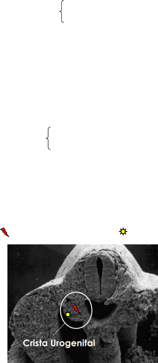 DESENVOLVIMENTO DO SISTEMA URINÁRIO Sistema urogenital Sistema urinário (excreção) Sistema genital (reprodução) Origem embrionária comum: Mesoderme intermediário, tecido usado para a formação tanto do sistema urinário quanto do reprodutor, nesse momento ainda não aconteceu o dobramento do embrião. A primeira modificação está relacionada ao dobramento lateral do embrião, em que o mesoderme se desloca para região ventral, dando inicio ao desenvolvimento do sistema urinário. Com o dobramento lateral do embrião: Mesoderme intermediário: Ventralmente Perde conexão com somitos. A mesoderme intermediaria passa a ser chamada de crista Urogenital, a partir do momento que se desloca para a região ventral e se desprende dos somitos. Crista Urogenital elevação longitudinal do mesoderme, tem se a formação de duas regiões que vão dar origem ao: Cordão nefrogênico-vai dar origem a estruturas do sistema urinário Crista gonadal- Sistema genital (gônada) DESENVOLVIMENTO DO SISTEMA URINÁRIO 3 conjuntos de órgãos excretores ou rins: Pronefros (cervical) Mesonefros (torácico, abdominal e lombar) Metanefros (região sacral) * (parte azul)- cordão nefrogênico. PRONEFRO: mais rudimentar, não tem nenhuma função especifica relacionada ao sistema urinária, mas é essencial para formação do mesoderme. O pronefro age como o primer, mesonefro vai conseguir se formar a partir do pronefro. Aparece no inicio da 4 semana Estruturas transitórias, se formam, fazem o papel e logo se degeneram; e não funcional. Segmentação do cordão nefrogênico nefrótomos Vesículas túbulos ducto pronéfrico -O cordão nefrogênico(cervical) vai sofrer segmentação, metamerização, cada bloquinho é chamado de nefrótomo. As células na região de cada nefrotomo morrem, sofrem apopitose, formando cavidades, luz, passando a se chamar de vesícula. Essa vesícula se achata, sofrendo uma curvatura para baixo em uma das extremidades. As curvaturas vão se unindo, formando um ducto na lateral. Logo tem vários túbulos que se ligam a um ducto, formando assim o pronéfro. O ducto pronéfrico só serve para dar origem ao ducto mesonéfrico MESONEFRO O mesonefro vai ter desenvolvimento parecido com o pronéfro, se diferenciando apenas, por não precisar da curvatura para formar o ducto, o ducto é formado a partir do crescimento do ducto pronéfro. Aparece no final da 4 ª semana. São considerados como rins provisórios. A filtração para eliminação de metabólicos via secreção urinária, não existe. Logo o mesonefro é responsável pela excreção de urina fetal. A produção de urina fetal é importante para manutenção do volume do liquido amniótico. Nesse momento ocorre a recirculação, em que o feto deglute o liquido, é eliminado e ele bebe de novo. Rins mesonéfricos túbulos mesonéfricos se alongam tufo de capilares glomérulos cápsula de Bowman Para finalizar o desenvolvimento do mesonefro, cada um dos túbulos se alongam, ganhando morfologia mais tortuosa. No caminho encontram um tufo de capilares (glomérulos do mesonéfricos), os envolvendo parcialmente, formando as capsulas de Bowman com glomérulos do mesonéfricos dentro. A partir do mesonefro se forma o pronefro se degenera, assim como o mesonefro também vai se degenerar mais para frente. Túbulos mesonéfricos se abrem nos ductos mesonéfricos Mesonefro degenera o final do 1º trimestre O ducto mesonefro vai até a região do Cloaco, uma cavidade única onde desemboca digestório do urogenital. Sexo masculino X sexo feminino Quando o embrião é XX o mesonefro se degenera totalmente. No embrião XY, só a região caudal que não vai se degenerar para dar origem as estruturas do aparelho reprodutor masculino. METANEFRO Primórdio dos rins permanentes Desenvolvimento = 5ª semana Início do funcionamento ~9ª Um pouco antes do mesonefro se desembocar na cloaca, ele sofre evaginação, formando um broto, chamado de broto uretérico. Normalmente todo o cordão nefrogenico se segmenta para formar túbulos e ductos. A única parte do cordão nefrogenico que não segmenta é região caudal, formando uma massa (na imagem a preta), que se chama blastema metanefrogênico. O Broto uretérico forma: Ureter,Pelve renal,Cálices maiores e menores,Túbulos coletores. Blastema+ broto: metanefro INDUÇÃO RECÍPROCA: blastema e broto são interdependentes. O blastema induz o broto a começar a formação de ramos, ramificar, ele começa a se desenvolver e crescer por essa indução. O blastema forma o nefron, por indução do broto. As células do blastema começam a se agrupar, formando pontos, que formam uma vesícula com a formação de uma luz nesses aglomerados. Essa vesícula se alonga, tomando uma morfologia característica. Na extremidade forma uma capsula que envolve um “tufo de cabelo”, até que toda a estrutura seja formada. Tudo por indução do broto. O Blastema metanefrogênico forma o néfron que dará origem ao: Túbulo contorcido distal, alça de Henle, túbulo contorcido proximal, cápsula de Bowman e glomérulo. Crescimento pós-natal: se dá pelo alongamento dos túbulos contorcidos proximais e tecido intersticial. MUDANÇA DE POSIÇÃO DOS RINS Resulta do crescimento do corpo do embrião e diminuição da curvatura do corpo. As estruturas formadas na região caudal, próximos na pelve, com o processo de redução da curvatura, auxiliam no processo de mudança de posição dos rins. Alem disso no início da gestação,a região do encéfalo cresce mais que a região caudal, por conta disso tem esse crescimento mais acentuado na região caudal para obter a simetria, logo os rins se reposicionam. FORMAÇÃO DA CLOACA A cloaca precisa se dividir através da formação de um septo, septo urorretal, que divide a cloaca em duas parte, para um lado só desembocar digestório e outro lado só urogenital. Cada parte da cloaca possui um nome: Onde desemboca o urogential: Seio Urogenital Onde desemboca o Digestório: Se